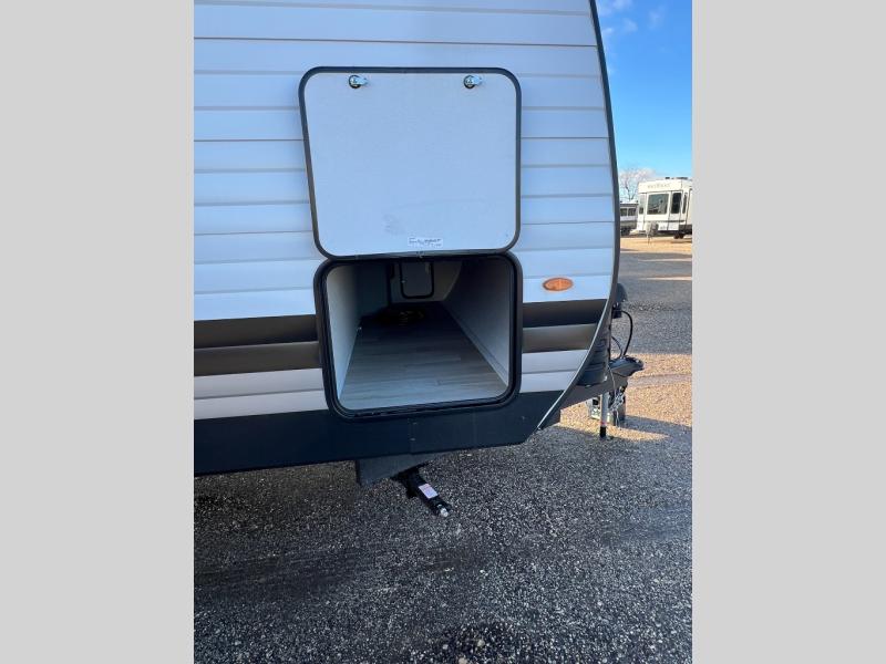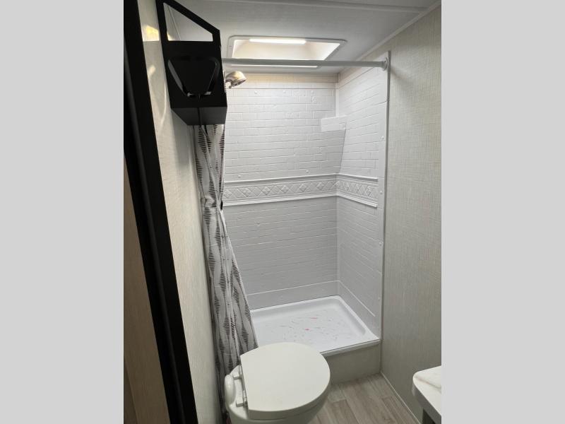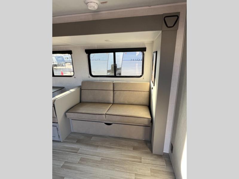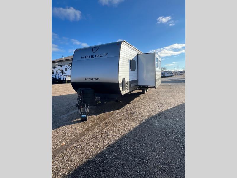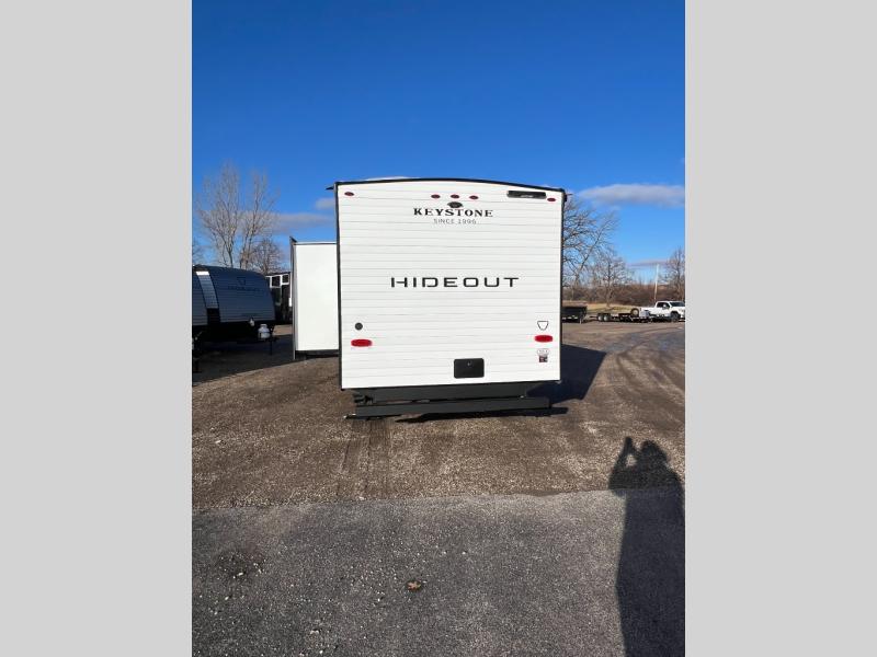 With any Hideout travel trailer by Keystone, you will find functional features and comfort at every turn! Each one is built with tinted safety glass windows and a walkable roof for added durability. There are also Solid Step entry steps outside, along with an outside shower, heavy-duty stabilizer jacks, a spare tire kit and Tire Linc TPMS prep. You'll love the pressed membrane premium countertops inside, plus a decorative tub surround, LED lighting, blackout night shades, and many more comforts. Additional features include a tankless water heater, a porcelain foot flush toilet, a power tongue jack, and an XL entry assist handle to name just a few!
