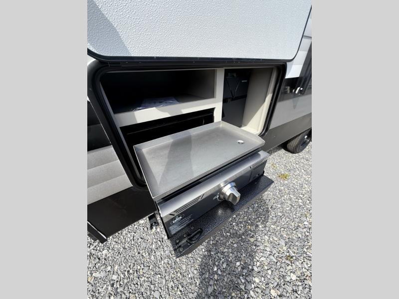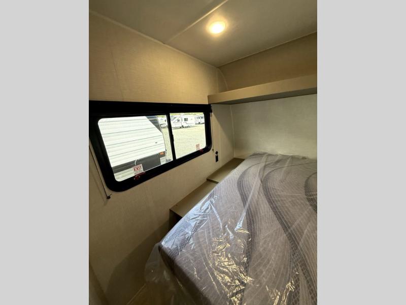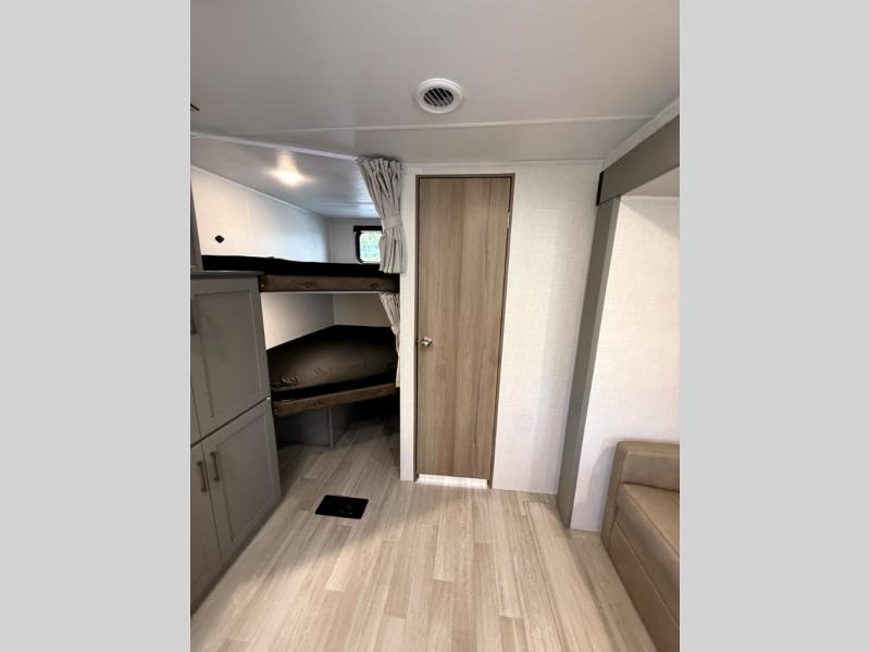 A large slide, front private bedroom, and double-size bunks make this Hideout Sport Double Axle the ultimate travel trailer! You will enjoy a walk-around queen bed in the bedroom plus dual closets and nightstands for your things. The full bath is towards the back and beside the bunks for easy nighttime use, and there is a pass-through storage outside for your gear. Head to the kitchen to prepare lunch on the cooktop, then dine at the U-shaped dinette and sofa within the large slide. If the weather is nice, you might just want to cook outdoors on the outside kitchen under the 18' power awning!