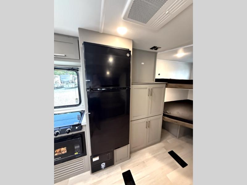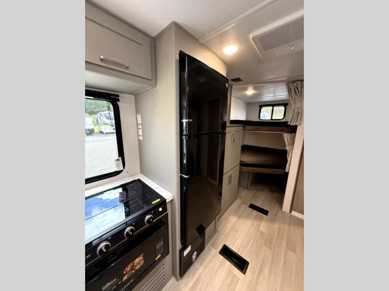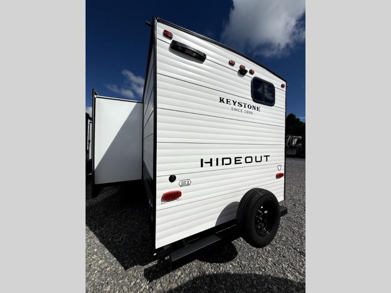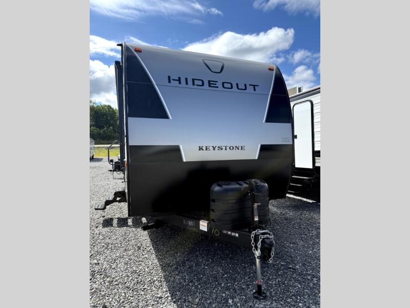 With any Hideout Sport travel trailer by Keystone you will enjoy simplified camping solutions that won't break the bank! Each model is constructed with a durable AlphaPly TPO roof membrane tinted safety glass windows, and an I-beam frame. There are power tongue jacks and heavy duty stabilizer jacks that will make it easier than ever to hitch up and go. An XL entry assist handle will also provide convenience, along with a power awning that will provide much wanted shade during the day. You will feel right at home with stylish decor, blackout night shades, and cozy bed with storage underneath!
