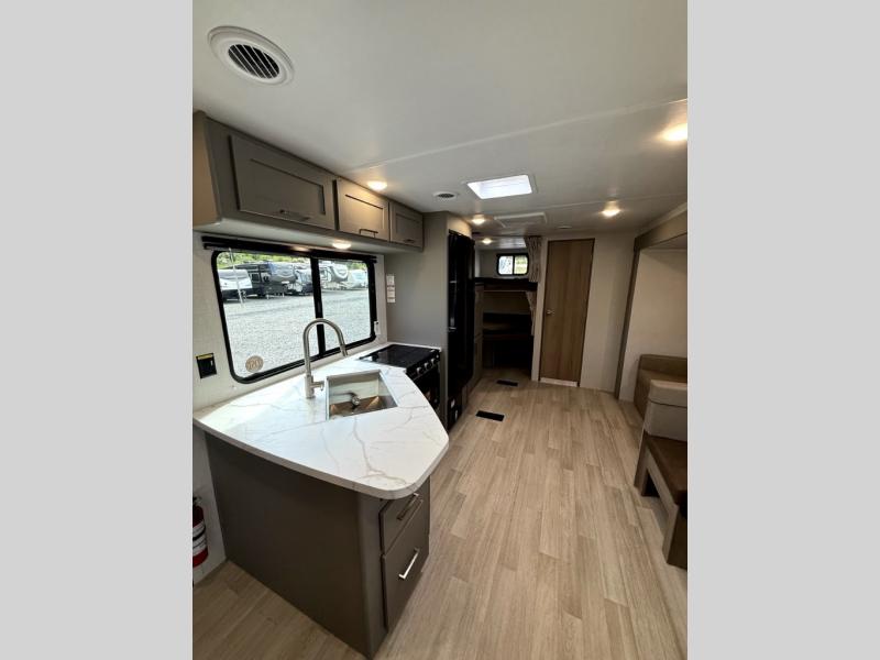 A large slide, front private bedroom, and double-size bunks make this Hideout Sport Double Axle the ultimate travel trailer! You will enjoy a walk-around queen bed in the bedroom plus dual closets and nightstands for your things. The full bath is towards the back and beside the bunks for easy nighttime use, and there is a pass-through storage outside for your gear. Head to the kitchen to prepare lunch on the cooktop, then dine at the U-shaped dinette and sofa within the large slide. If the weather is nice, you might just want to cook outdoors on the outside kitchen under the 18' power awning!