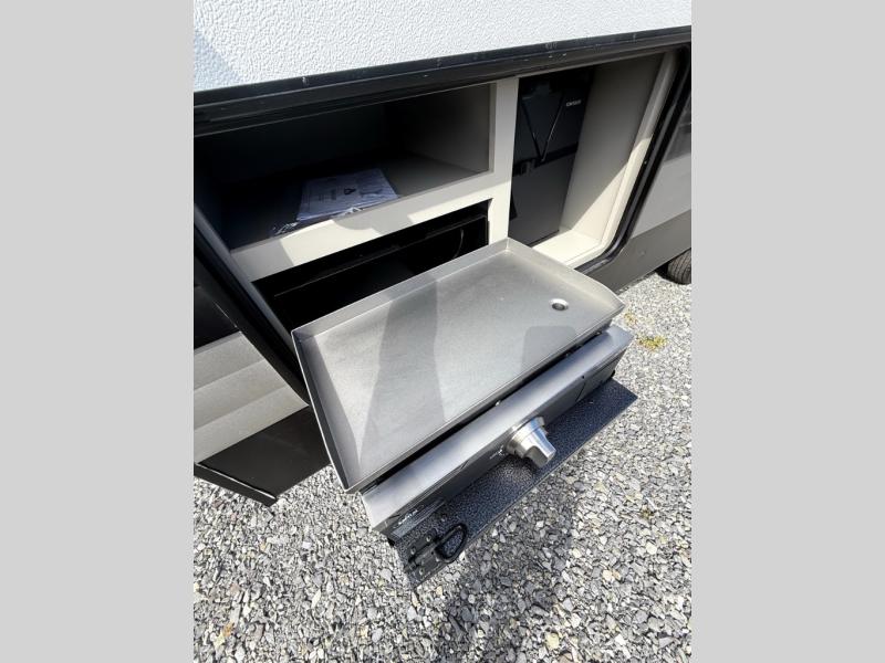 A large slide, front private bedroom, and double-size bunks make this Hideout Sport Double Axle the ultimate travel trailer! You will enjoy a walk-around queen bed in the bedroom plus dual closets and nightstands for your things. The full bath is towards the back and beside the bunks for easy nighttime use, and there is a pass-through storage outside for your gear. Head to the kitchen to prepare lunch on the cooktop, then dine at the U-shaped dinette and sofa within the large slide. If the weather is nice, you might just want to cook outdoors on the outside kitchen under the 18' power awning!
