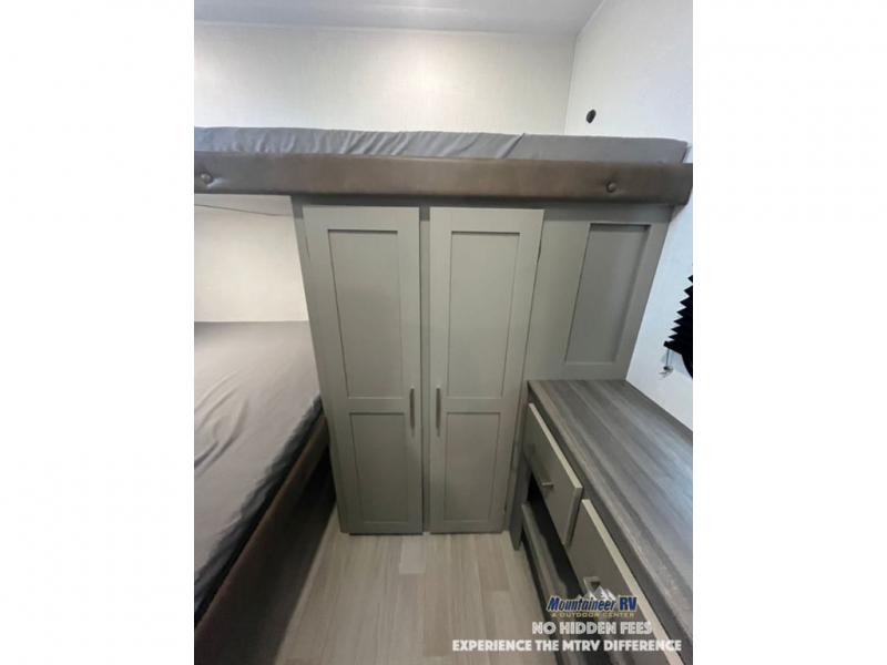 A large slide, front private bedroom, and double-size bunks make this Hideout Sport Double Axle the ultimate travel trailer! You will enjoy a walk-around queen bed in the bedroom plus dual closets and nightstands for your things. The full bath is towards the back and beside the bunks for easy nighttime use, and there is a pass-through storage outside for your gear. Head to the kitchen to prepare lunch on the cooktop, then dine at the U-shaped dinette and sofa within the large slide. If the weather is nice, you might just want to cook outdoors on the outside kitchen under the 18' power awning!