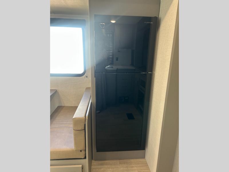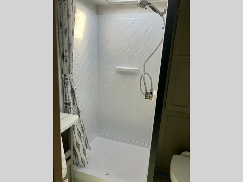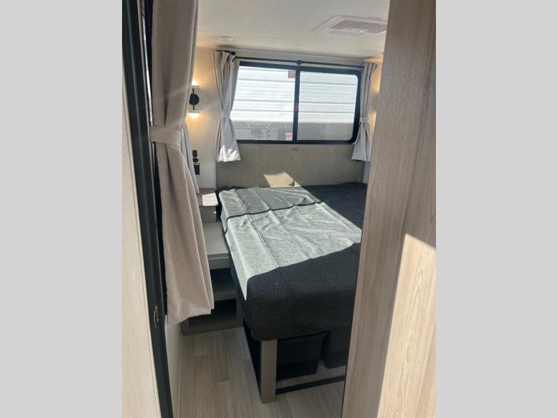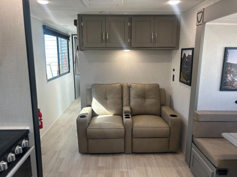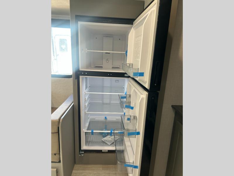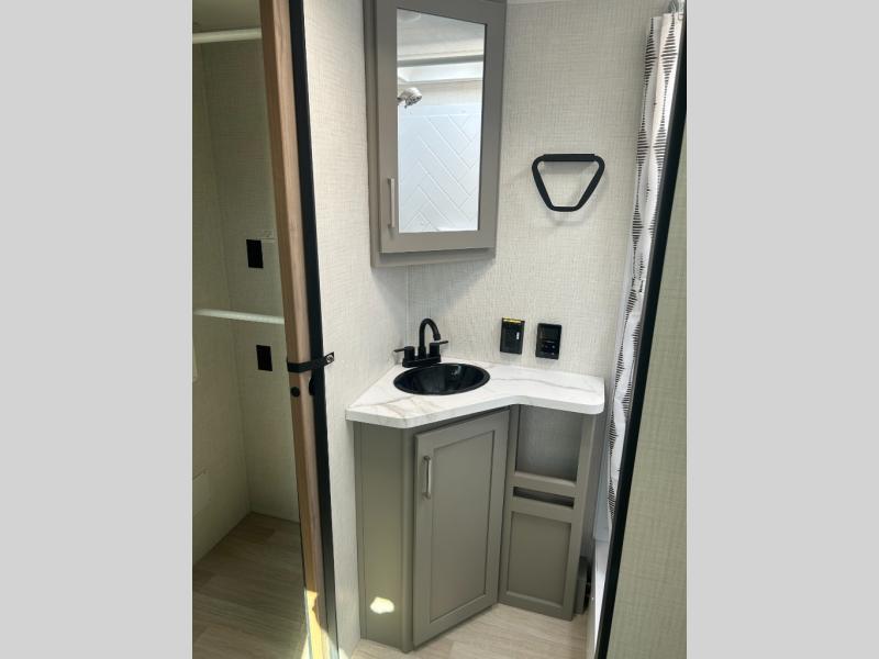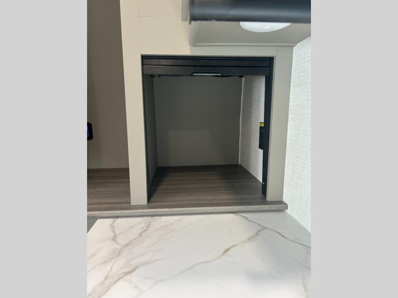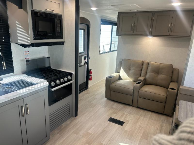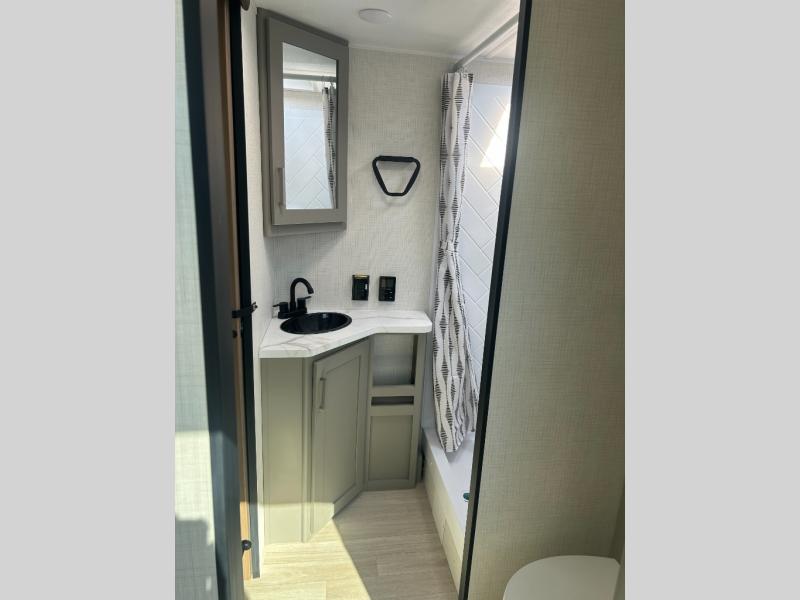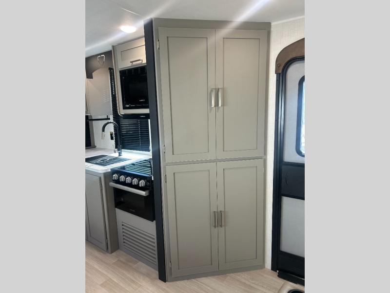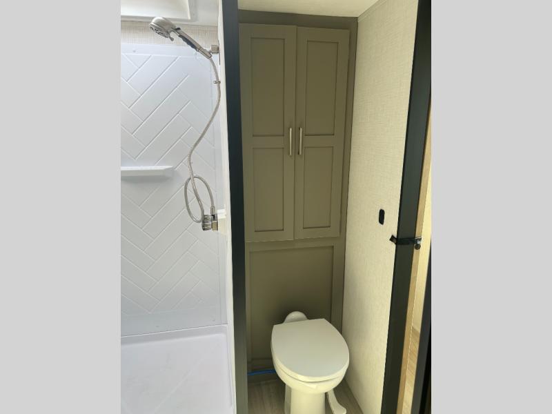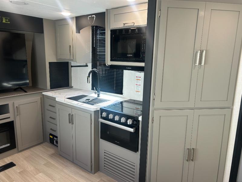 This travel trailer is designed for campers who want extra comfort without giving up easy towing and it offers a smart, functional layout for everyday living on the road. Along with a complete bath with 30" x 36" shower and linen storage, you get inviting seating, a well-equipped kitchen, and plenty of storage so you can settle in and feel at home on every trip. This floorplan stands out with its 50" TV perfectly positioned for movie nights, plus dedicated wardrobe and shoe storage to keep clutter under control. At the end of the day, you can stretch out on the Olympic queen bed, giving you more sleeping space than a standard queen, and the kitchen’s air fryer microwave lets you whip up quick, crispy meals without needing extra appliances.