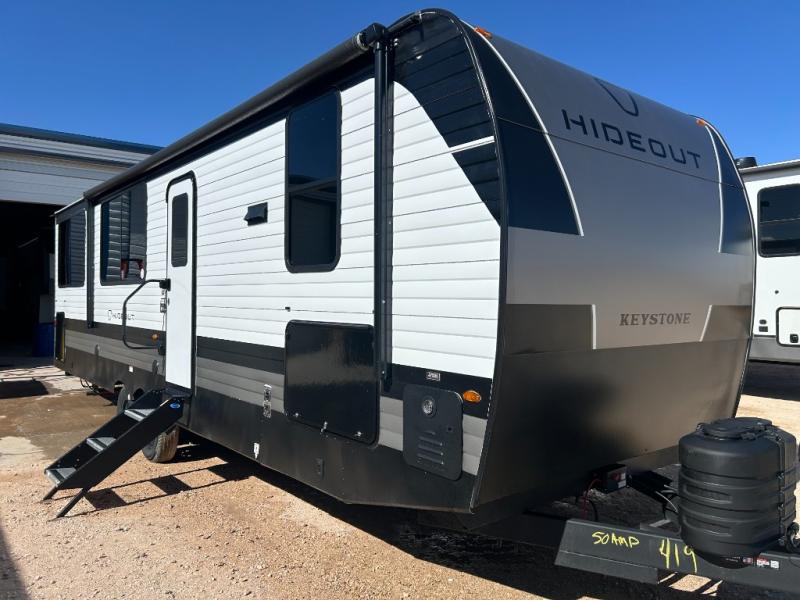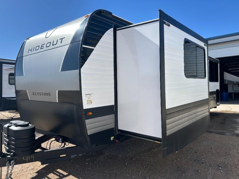 Hideout Max travel trailers by Keystone are built to make the most of every trip, with durable construction, a fully walkable roof with ladder prep, tinted safety glass windows, and solid step entry steps that make getting in and out easy. Standard features like a waterproof drop-frame pass-through for bulky gear, a power awning with LED lights, power stabilizer jacks, and a power tongue jack keep campsite setup simple, while the tankless water heater, SolarFlex™-ready wiring, and 26K dual A/C system on 30-amp service help every Hideout Max feel comfortable and capable, no matter which floorplan you choose.