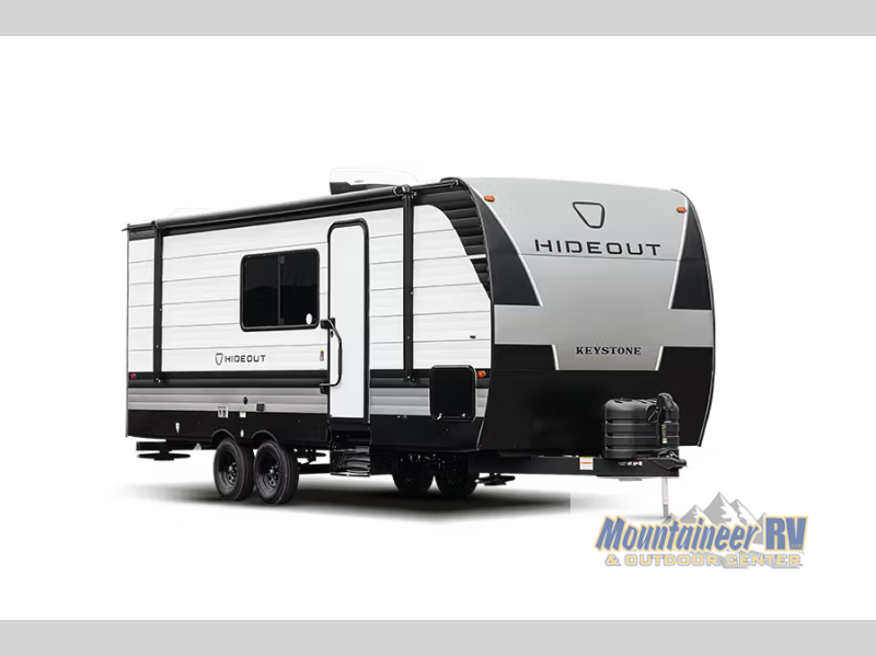Hideout Max travel trailers by Keystone are built to make the most of every trip, with durable construction, a fully walkable roof with ladder prep, tinted safety glass windows, and solid step entry steps that make getting in and out easy. Standard features like a waterproof drop-frame pass-through for bulky gear, a power awning with LED lights, power stabilizer jacks, and a power tongue jack keep campsite setup simple, while the tankless water heater, SolarFlex™-ready wiring, and 26K dual A/C system on 30-amp service help every Hideout Max feel comfortable and capable, no matter which floorplan you choose.
