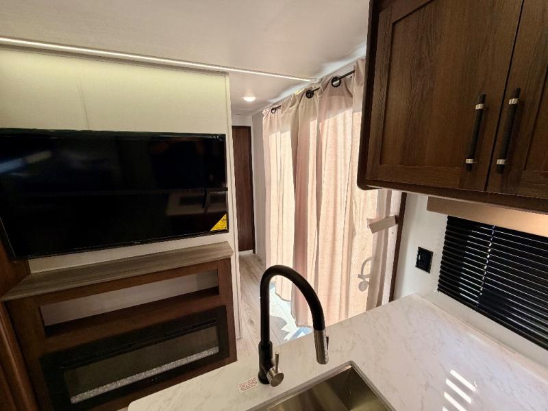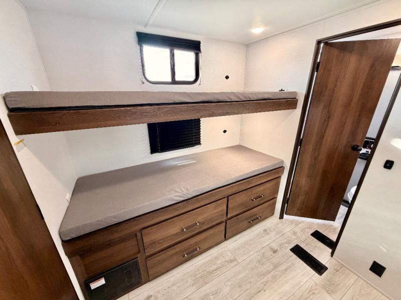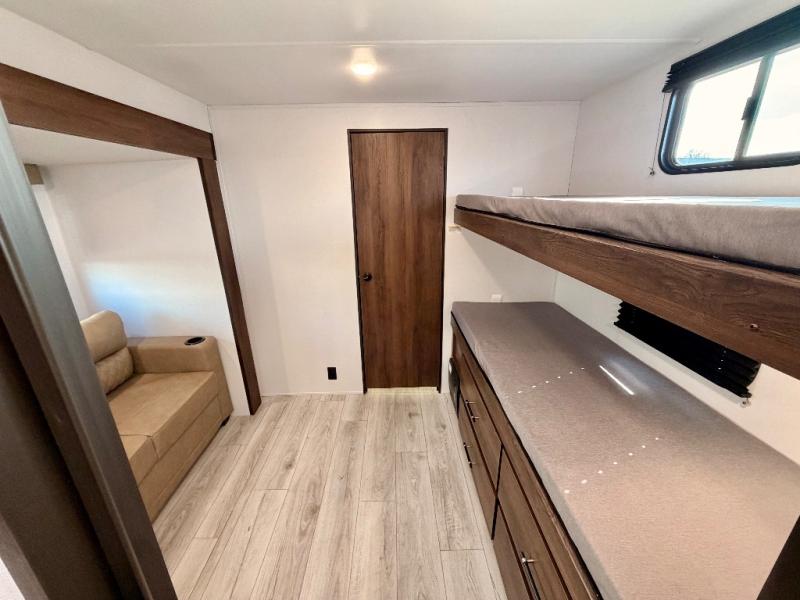 The 2026 Keystone Hideout 38BHT is an ideal travel trailer for large families or extended stays, designed as a spacious home-away-from-home. This floorplan boasts a comfortable king-sized bed in the private master bedroom and a dedicated, large bunkroom that provides ample sleeping capacity for numerous guests, making it perfect for family trips or group adventures. A standout feature is the inclusion of two full bathrooms, offering unparalleled convenience and privacy, so everyone can get ready without waiting. The living area is crafted for relaxation, typically featuring an entertainment center with a fireplace, plush seating, and a U-shaped dinette for dining or game nights. With a well-appointed kitchen, plenty of cabinets and pantry space, and Keystone's commitment to durable construction and thoughtful design, the 38BHT delivers both comfort and functionality for memorable adventures, whether for weekend getaways or extended camping excursions.
