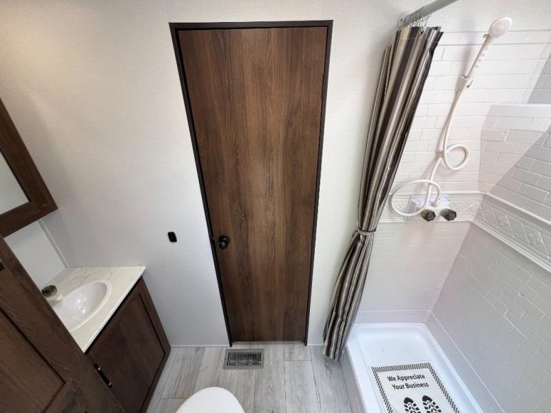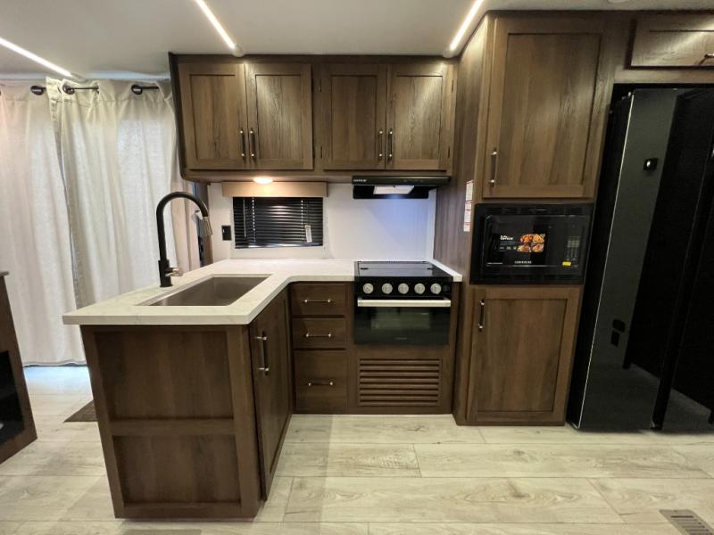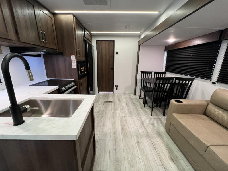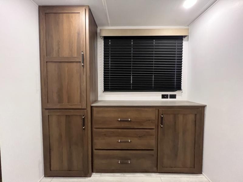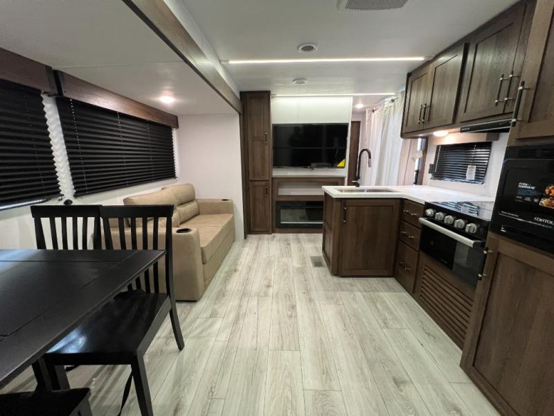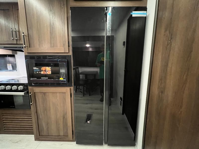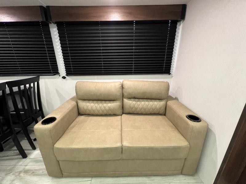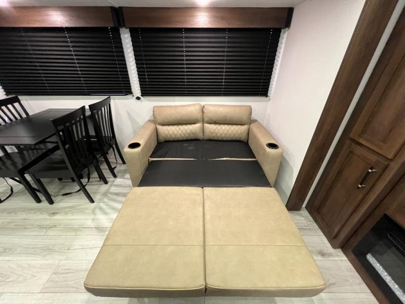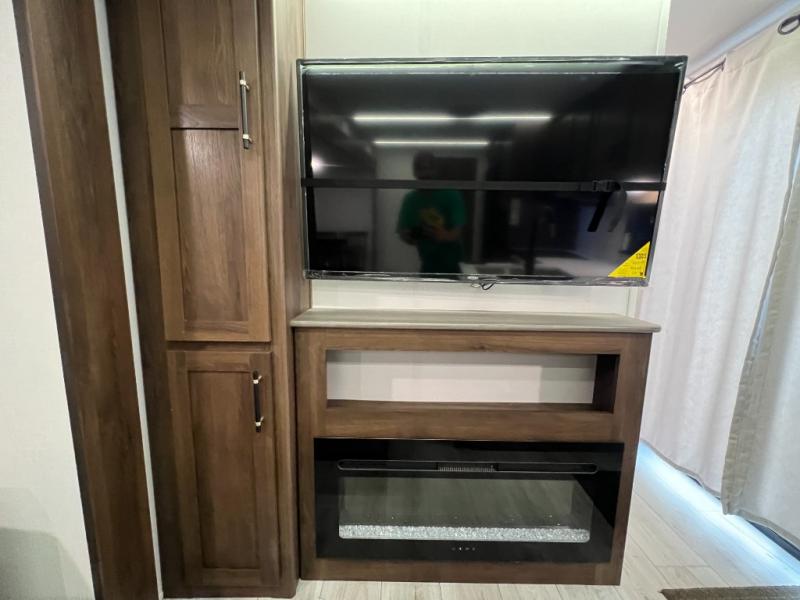Extended stays are easy in this spacious destination trailer. Since there are two private bedrooms and two full baths, you can camp with family and friends, plus there are triple slides for more space! The front bedroom includes a king bed slide out, a closet, dresser, plus washer and dryer prep if you choose to add those appliances. The master bedroom towards the back features a queen bed slide, dual closets, and a full rear bath, and both bathrooms includes a shower with a seat for more comfort! Everyone can meet in the combined kitchen and living area to relax on the tri-fold sofa, play a game at the flex lounge, or just enjoy the 50" TV and fireplace. And the full kitchen is sure to impress with its three burner gas oven, air fryer microwave, and 16 cu. ft. refrigerator!