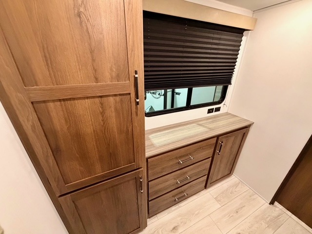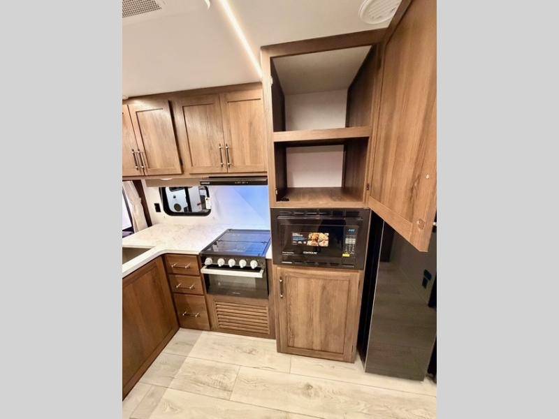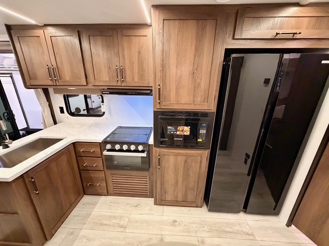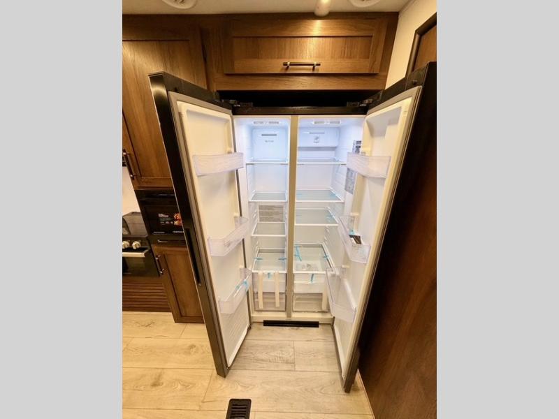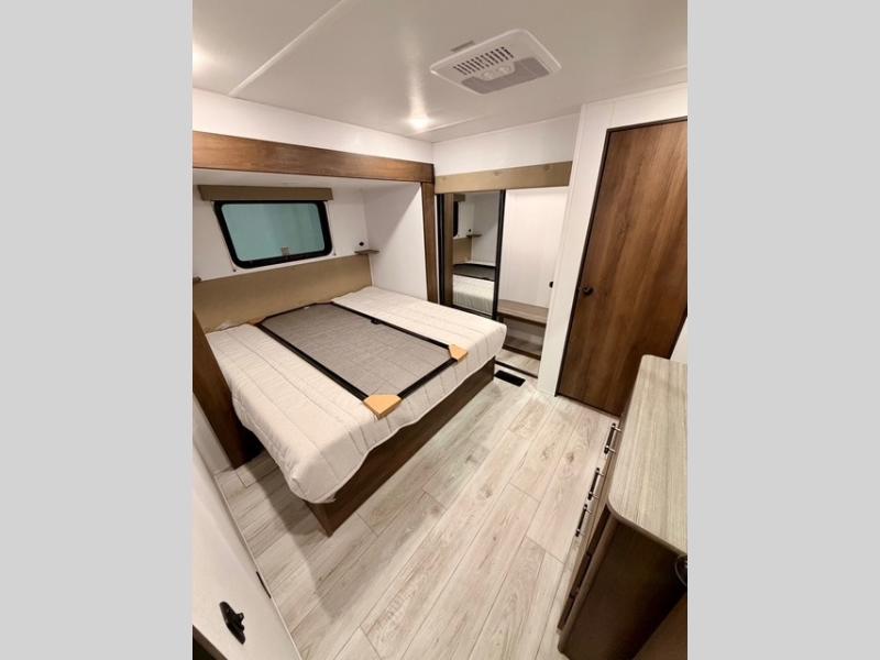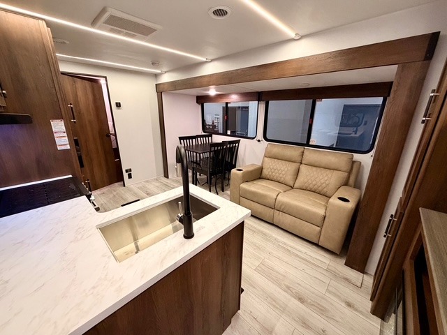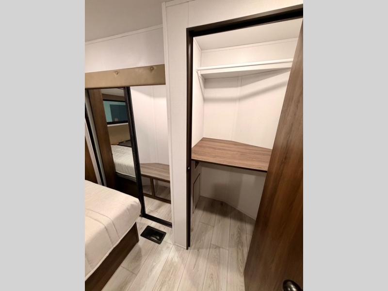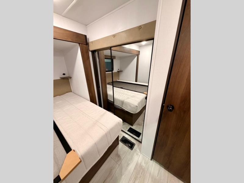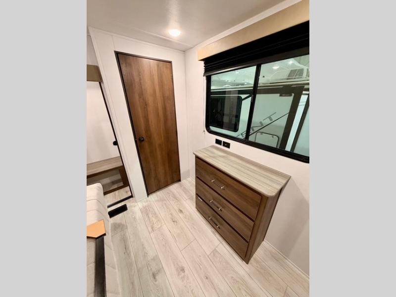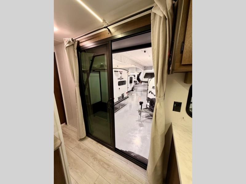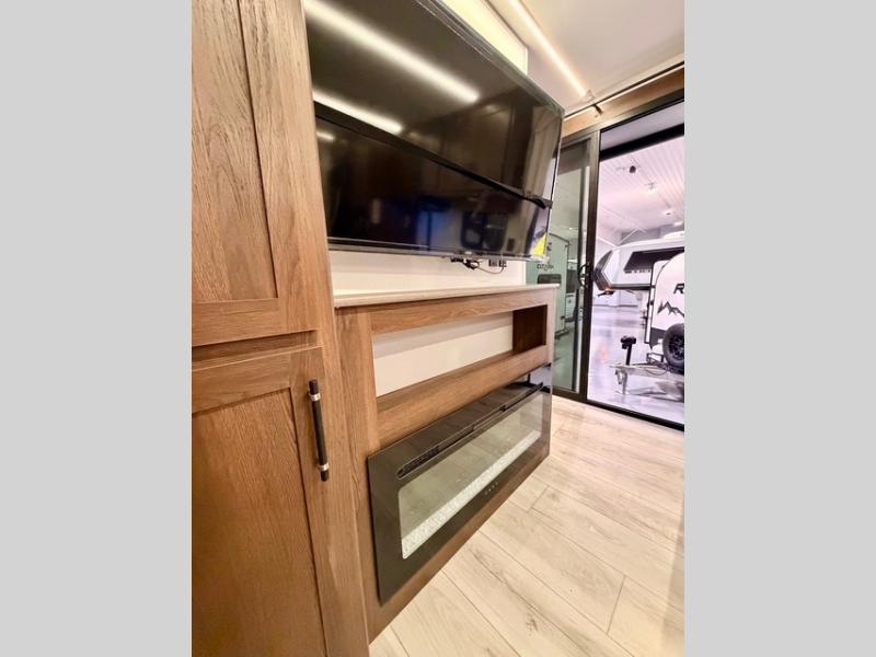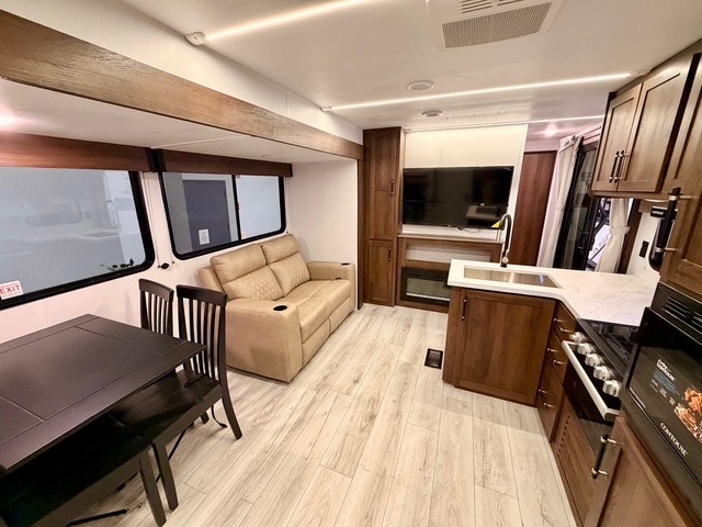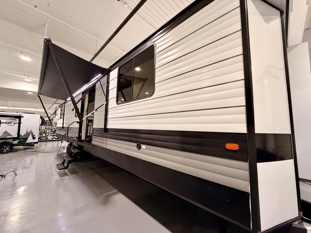 This is the perfect trailer to travel with friends and family since there are two bedrooms! The front bedroom includes a king bed slide out, a closet, dresser, plus washer and dryer prep if you choose to add these appliances. There is also a full bath right next to this room for easy access, making morning routines simpler for multiple people. Head to the rear master bedroom to find a queen bed slide out, a dresser and a closet, plus a full rear bath with one of the dual entry doors to the unit for added convenience. Everyone can meet in the combined kitchen and living area in the morning while the chef makes breakfast on the three-burner gas range. There is a free-standing table and a tri-fold sofa within the large slide out here, and the entertainment center with a fireplace is close by to make it more cozy and inviting for relaxing evenings or family movie nights. After breakfast you can head out on a trail or two, enjoy an outdoor game, or just relax outdoors under the 20' power awning with ample shade and space for everyone.