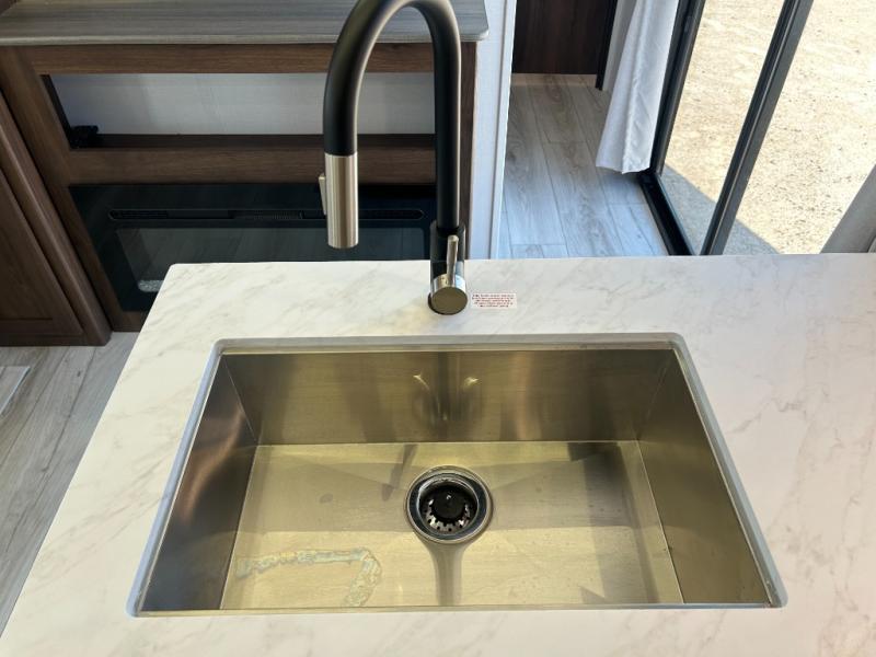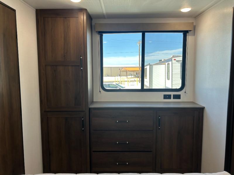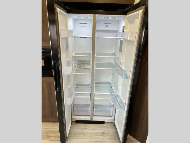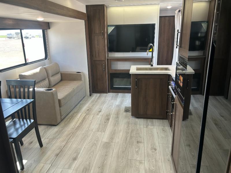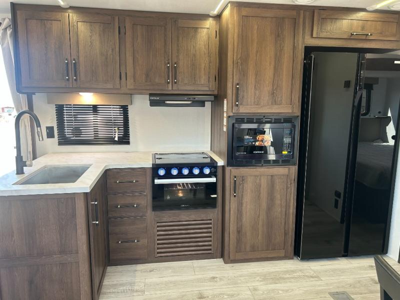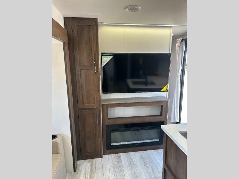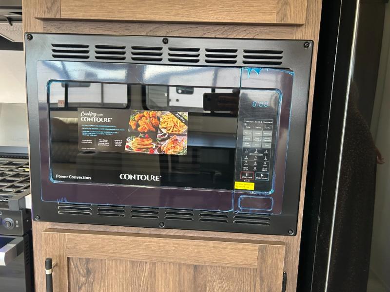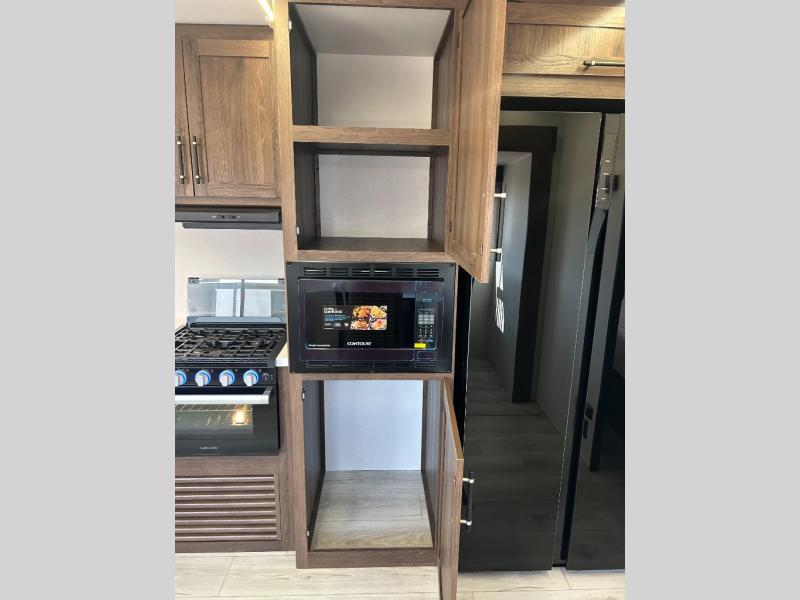 Extended stays are easy in this spacious destination trailer. Since there are two private bedrooms and two full baths, you can camp with family and friends, plus there are triple slides for more space! The front bedroom includes a king bed slide out, a closet, dresser, plus washer and dryer prep if you choose to add those appliances. The master bedroom towards the back features a queen bed slide, dual closets, and a full rear bath, and both bathrooms includes a shower with a seat for more comfort! Everyone can meet in the combined kitchen and living area to relax on the tri-fold sofa, play a game at the flex lounge, or just enjoy the 50" TV and fireplace. And the full kitchen is sure to impress with its three burner gas oven, air fryer microwave, and 16 cu. ft. refrigerator!