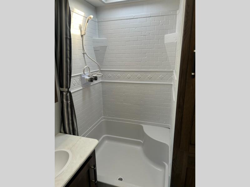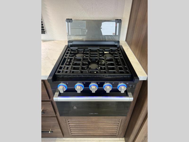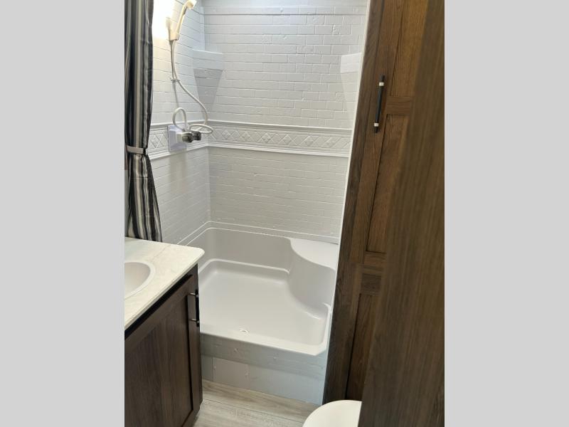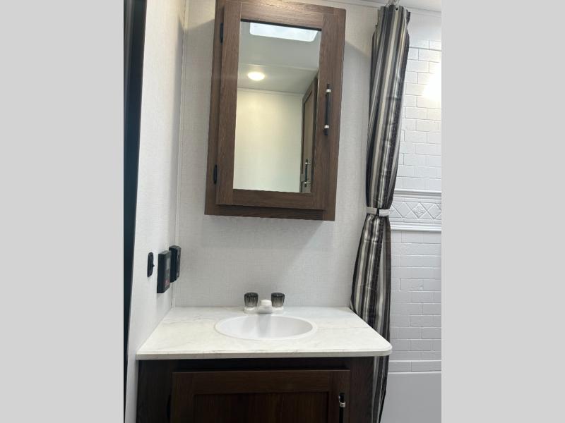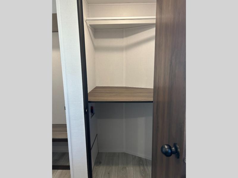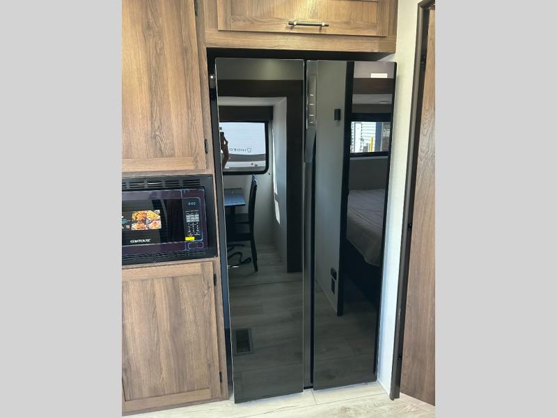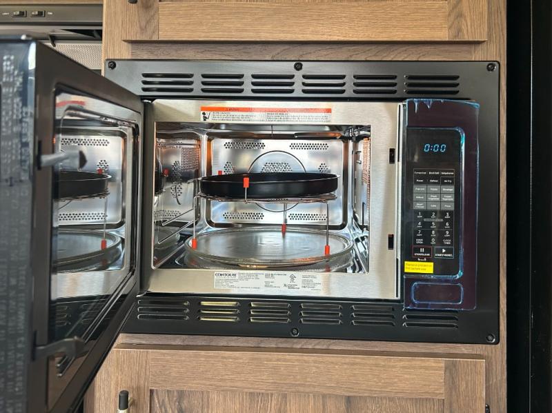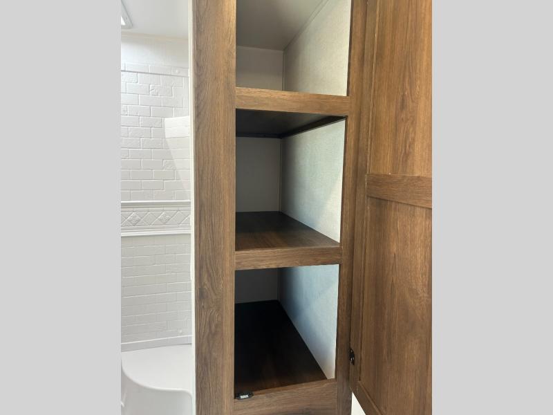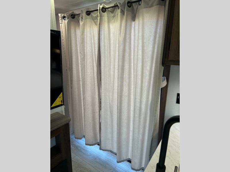Extended stays are easy in this spacious destination trailer. Since there are two private bedrooms and two full baths, you can camp with family and friends, plus there are triple slides for more space! The front bedroom includes a king bed slide out, a closet, dresser, plus washer and dryer prep if you choose to add those appliances. The master bedroom towards the back features a queen bed slide, dual closets, and a full rear bath, and both bathrooms includes a shower with a seat for more comfort! Everyone can meet in the combined kitchen and living area to relax on the tri-fold sofa, play a game at the flex lounge, or just enjoy the 50" TV and fireplace. And the full kitchen is sure to impress with its three burner gas oven, air fryer microwave, and 16 cu. ft. refrigerator!