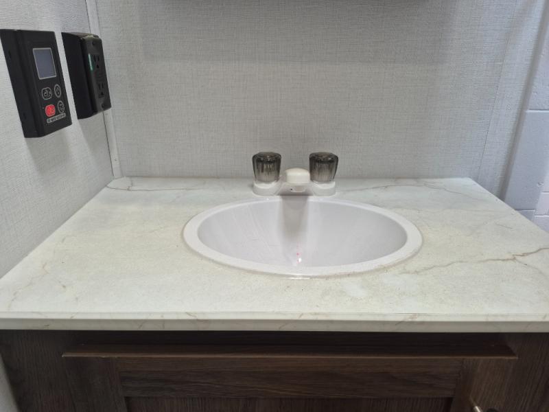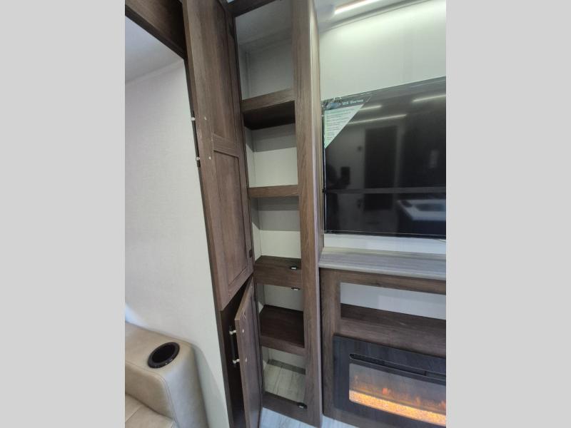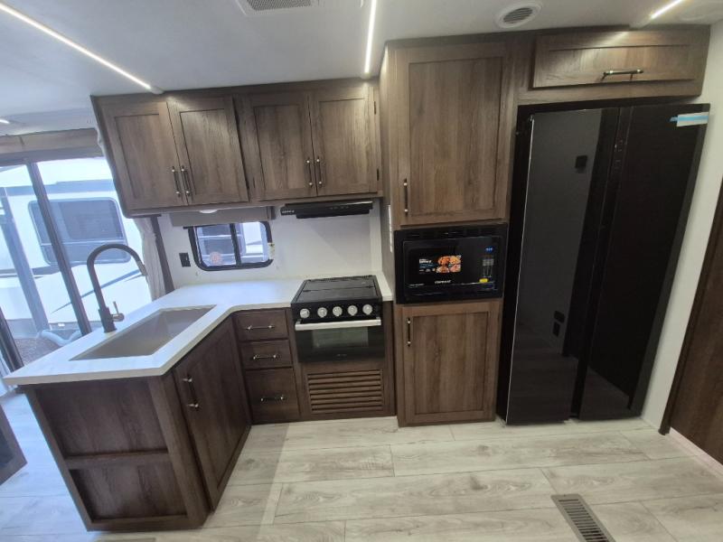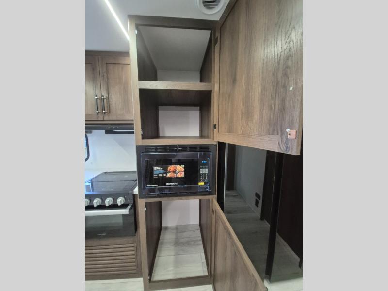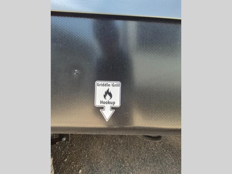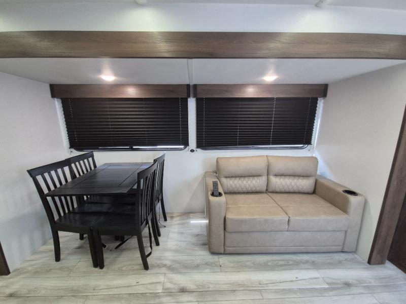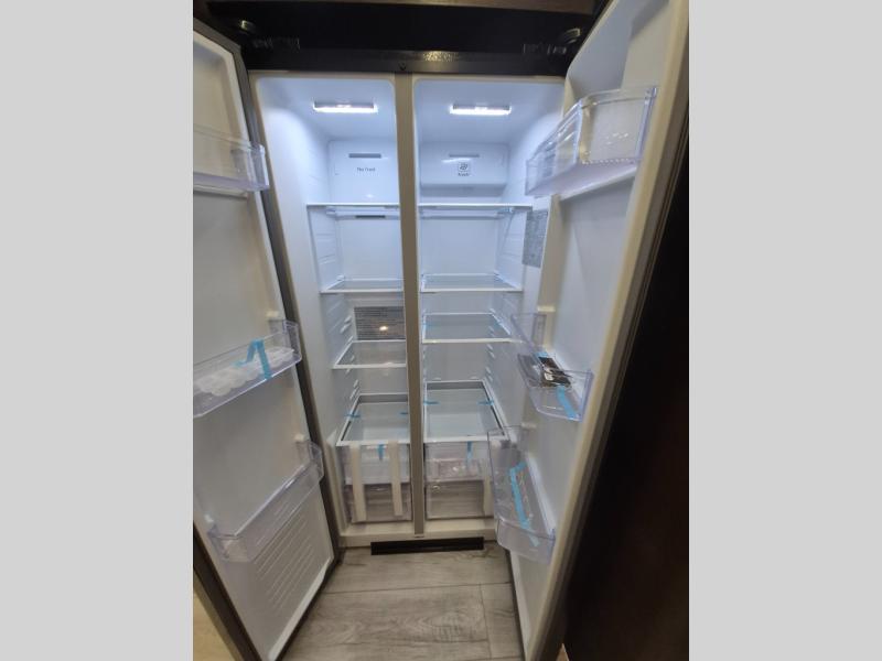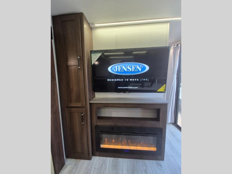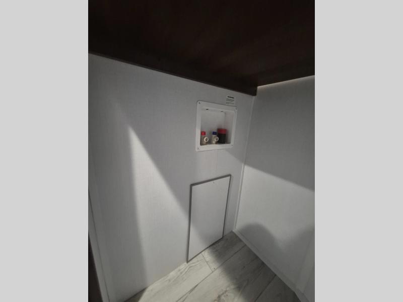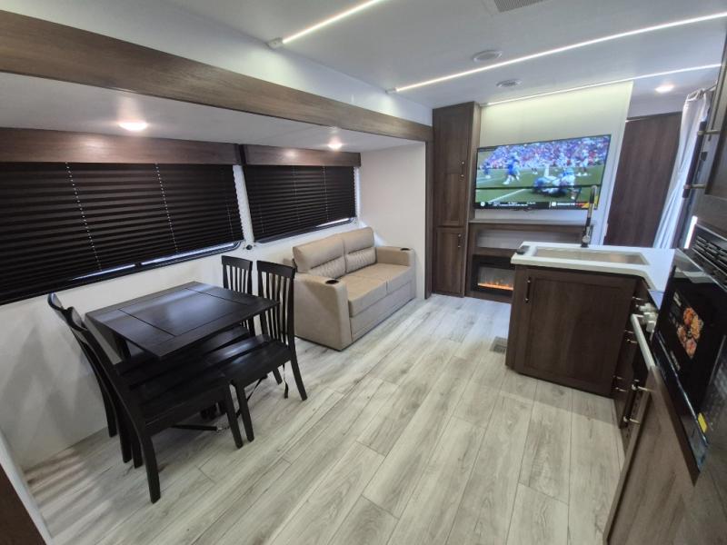 Extended stays are easy in this spacious destination trailer. Since there are two private bedrooms and two full baths, you can camp with family and friends, plus there are triple slides for more space! The front bedroom includes a king bed slide out, a closet, dresser, plus washer and dryer prep if you choose to add those appliances. The master bedroom towards the back features a queen bed slide, dual closets, and a full rear bath, and both bathrooms includes a shower with a seat for more comfort! Everyone can meet in the combined kitchen and living area to relax on the tri-fold sofa, play a game at the flex lounge, or just enjoy the 50" TV and fireplace. And the full kitchen is sure to impress with its three burner gas oven, air fryer microwave, and 16 cu. ft. refrigerator!