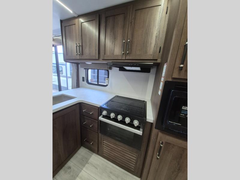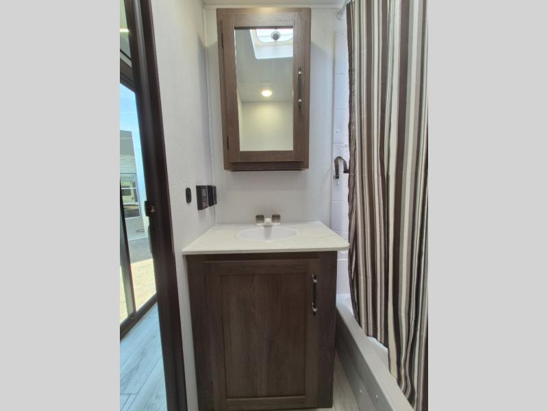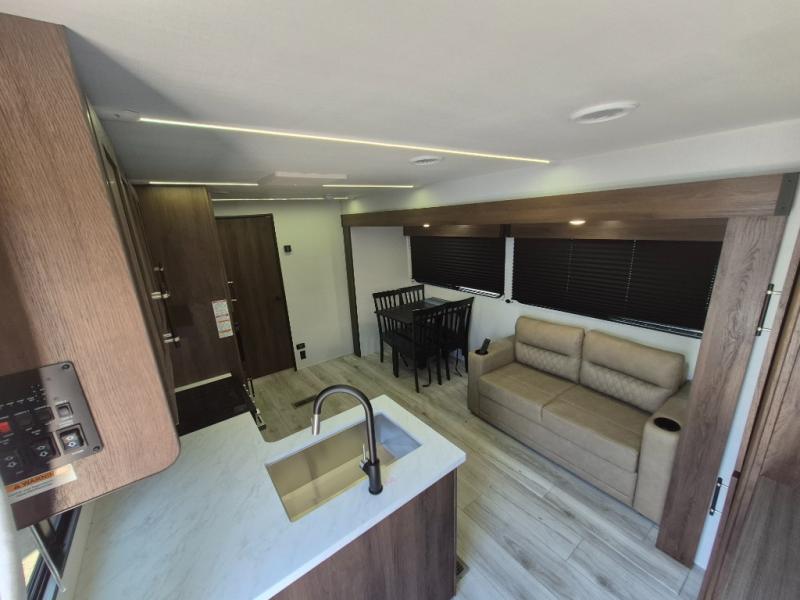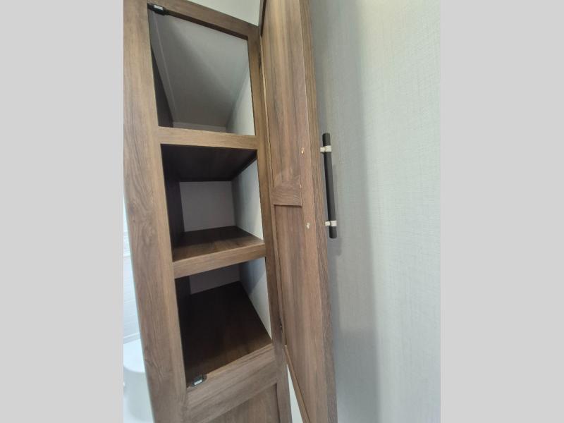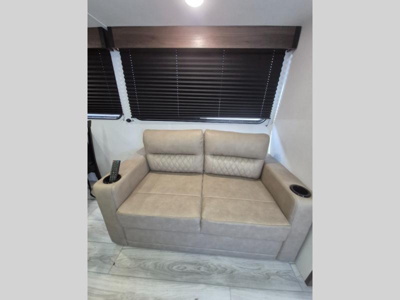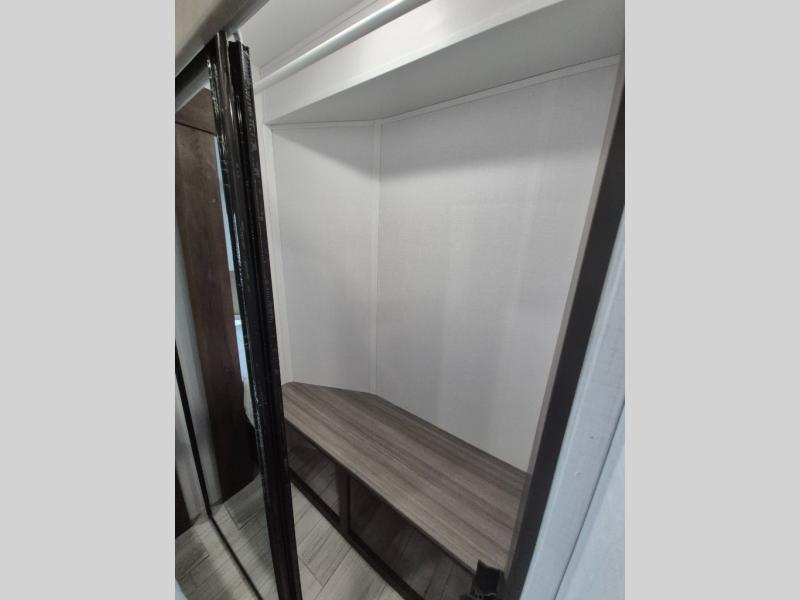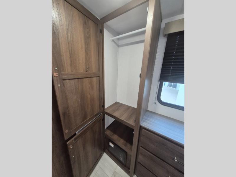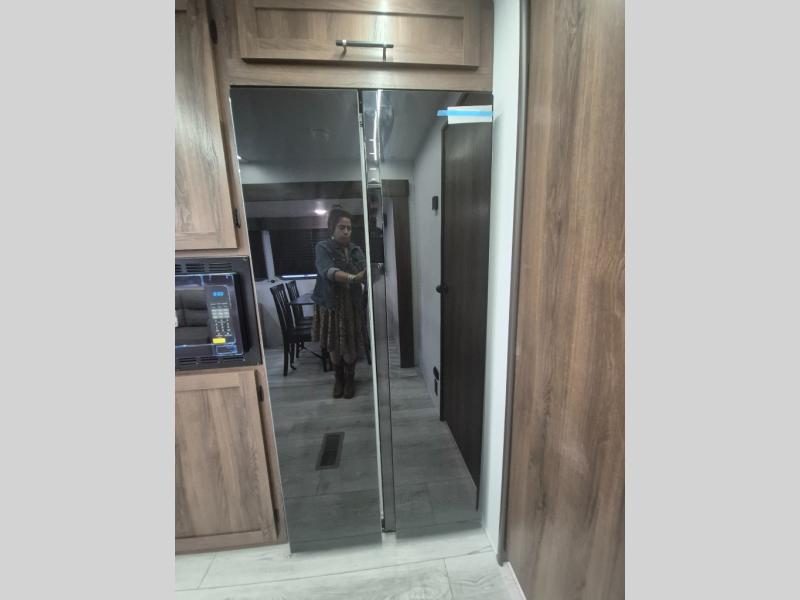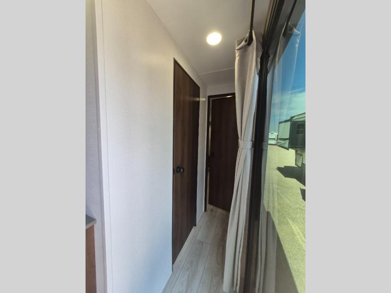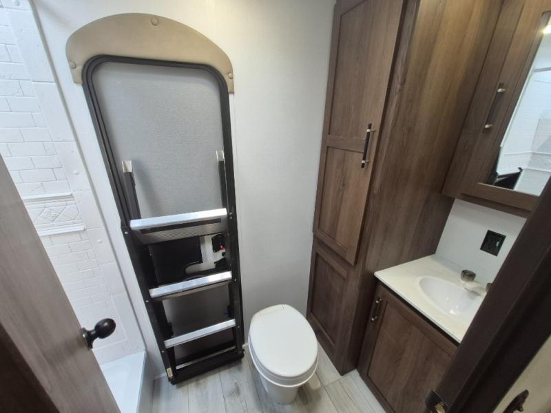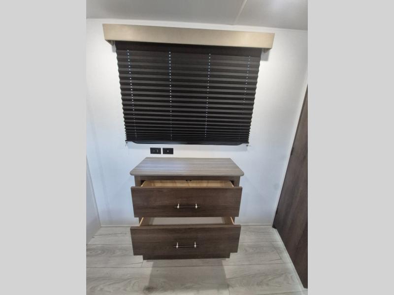 Extended stays are easy in this spacious destination trailer. Since there are two private bedrooms and two full baths, you can camp with family and friends, plus there are triple slides for more space! The front bedroom includes a king bed slide out, a closet, dresser, plus washer and dryer prep if you choose to add those appliances. The master bedroom towards the back features a queen bed slide, dual closets, and a full rear bath, and both bathrooms includes a shower with a seat for more comfort! Everyone can meet in the combined kitchen and living area to relax on the tri-fold sofa, play a game at the flex lounge, or just enjoy the 50" TV and fireplace. And the full kitchen is sure to impress with its three burner gas oven, air fryer microwave, and 16 cu. ft. refrigerator!