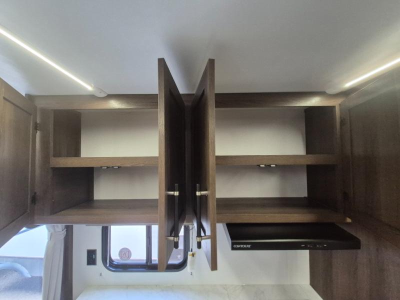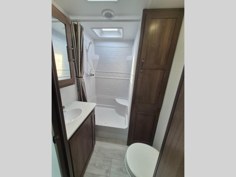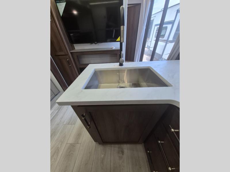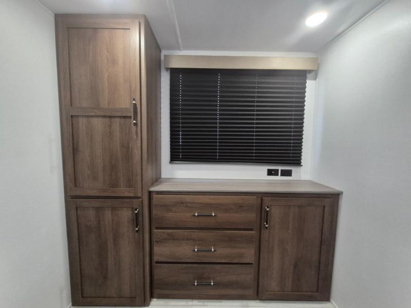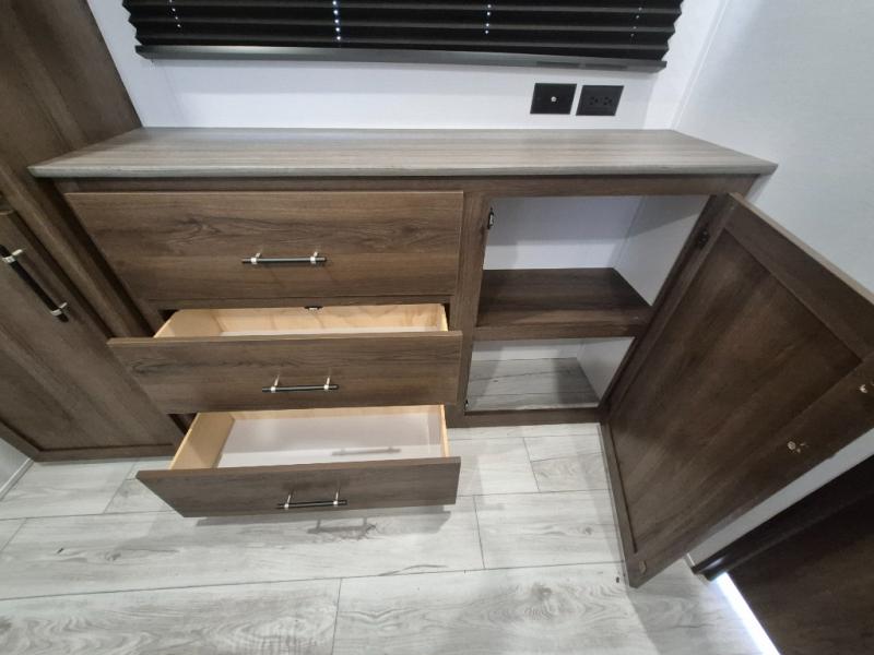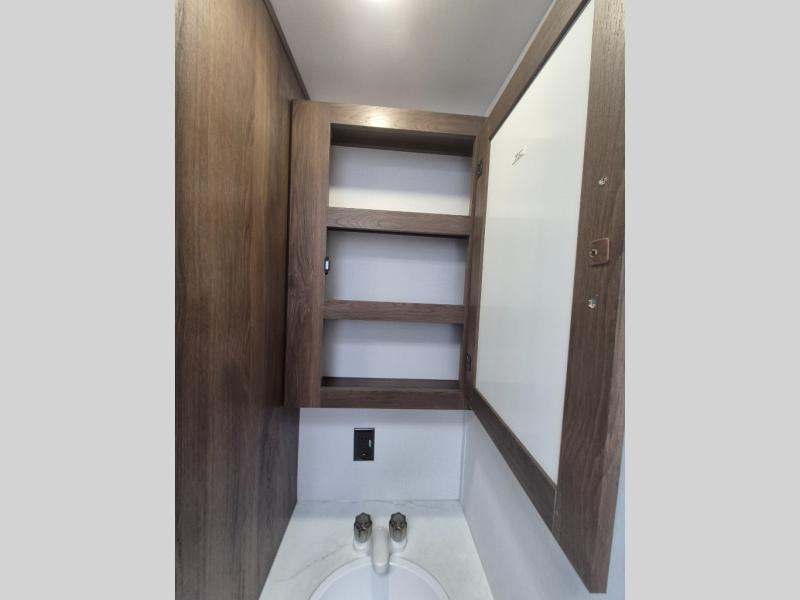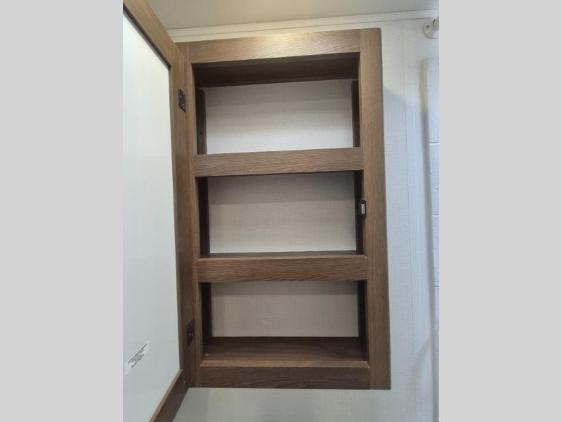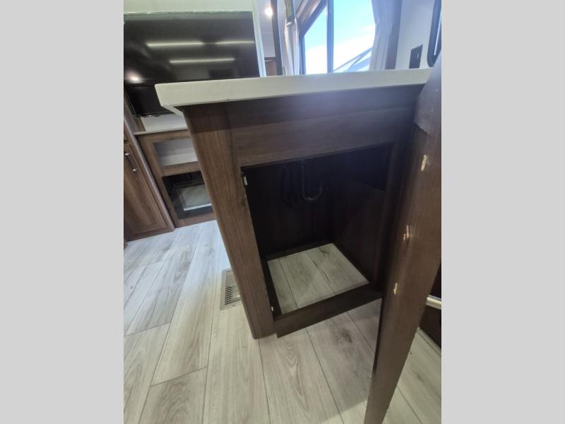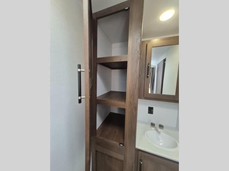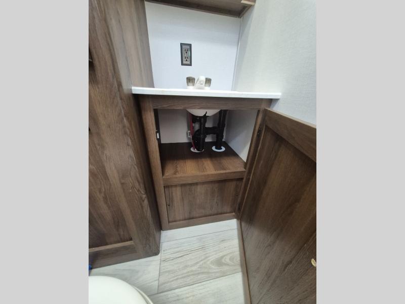 Extended stays are easy in this spacious destination trailer. Since there are two private bedrooms and two full baths, you can camp with family and friends, plus there are triple slides for more space! The front bedroom includes a king bed slide out, a closet, dresser, plus washer and dryer prep if you choose to add those appliances. The master bedroom towards the back features a queen bed slide, dual closets, and a full rear bath, and both bathrooms includes a shower with a seat for more comfort! Everyone can meet in the combined kitchen and living area to relax on the tri-fold sofa, play a game at the flex lounge, or just enjoy the 50" TV and fireplace. And the full kitchen is sure to impress with its three burner gas oven, air fryer microwave, and 16 cu. ft. refrigerator!