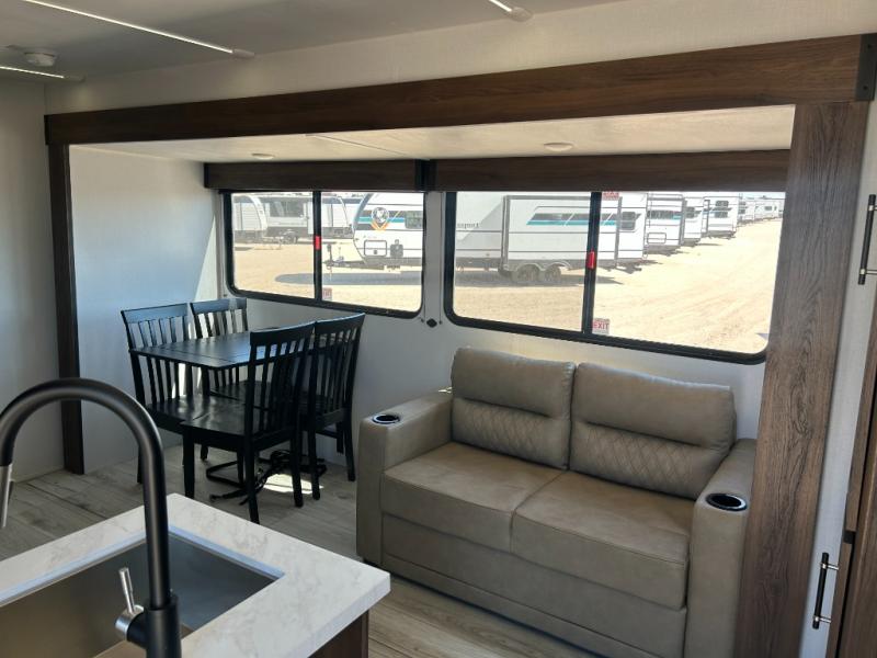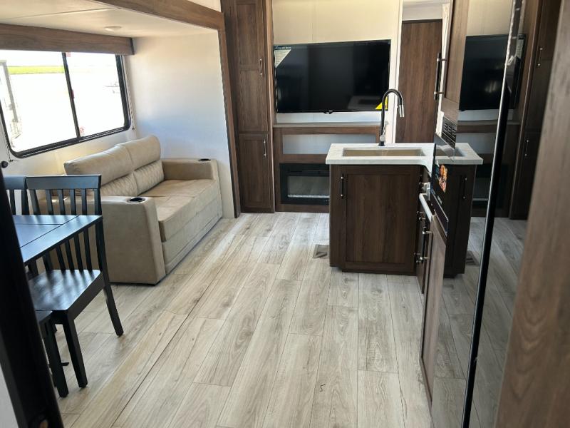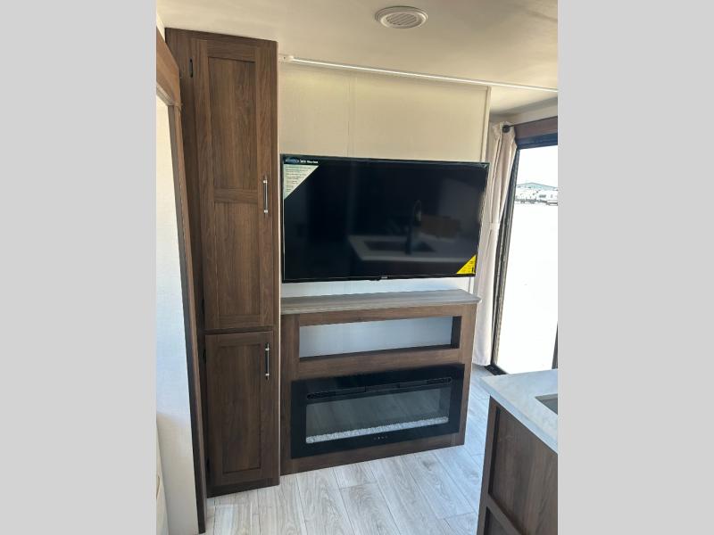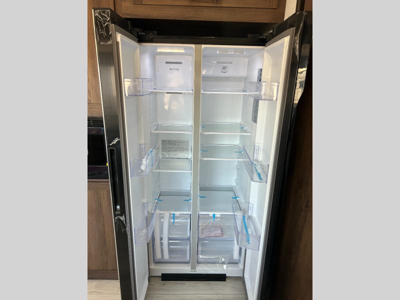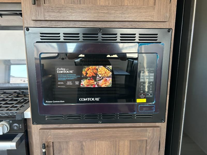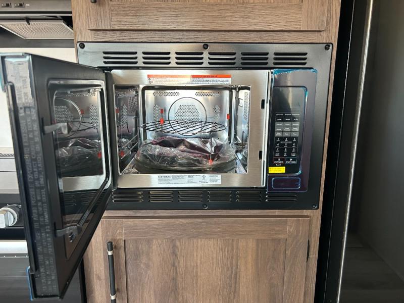 Extended stays are easy in this spacious destination trailer. Since there are two private bedrooms and two full baths, you can camp with family and friends, plus there are triple slides for more space! The front bedroom includes a king bed slide out, a closet, dresser, plus washer and dryer prep if you choose to add those appliances. The master bedroom towards the back features a queen bed slide, dual closets, and a full rear bath, and both bathrooms includes a shower with a seat for more comfort! Everyone can meet in the combined kitchen and living area to relax on the tri-fold sofa, play a game at the flex lounge, or just enjoy the 50" TV and fireplace. And the full kitchen is sure to impress with its three burner gas oven, air fryer microwave, and 16 cu. ft. refrigerator!