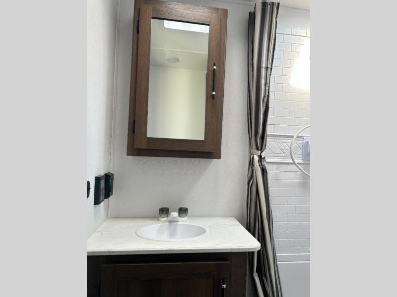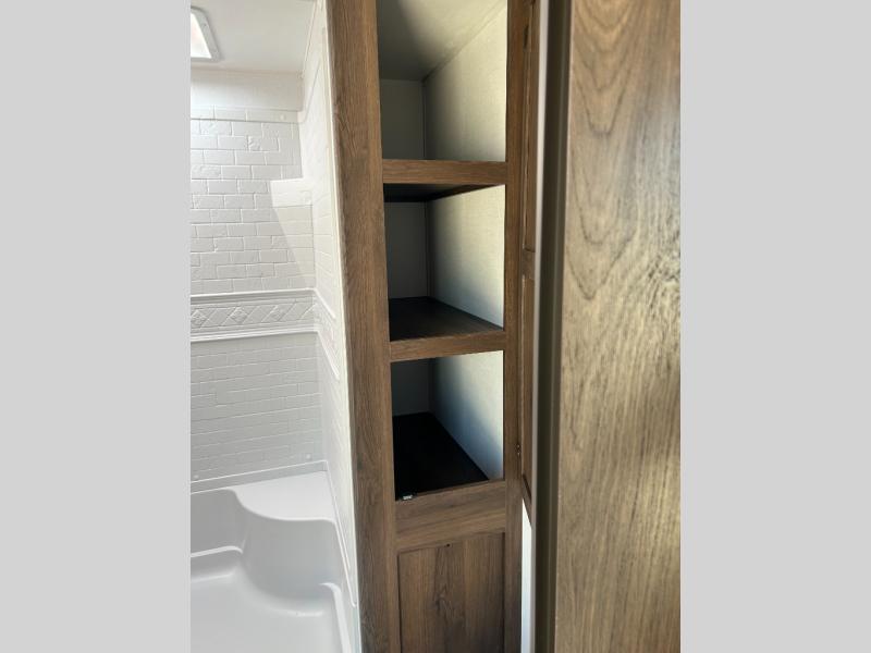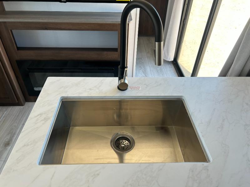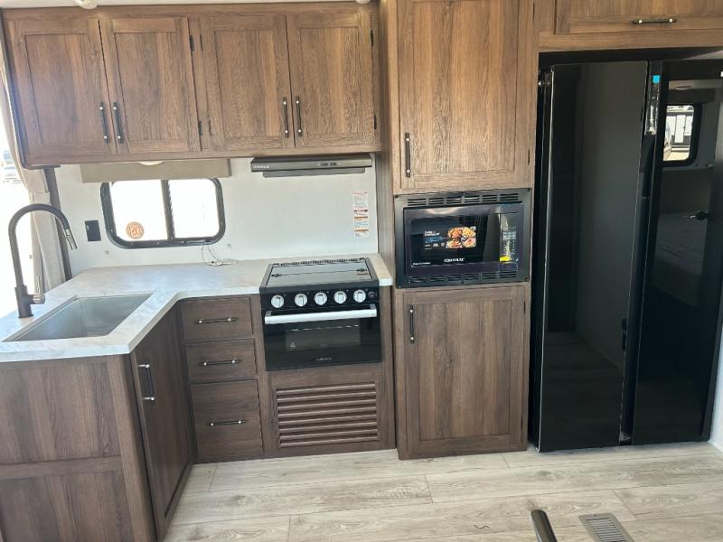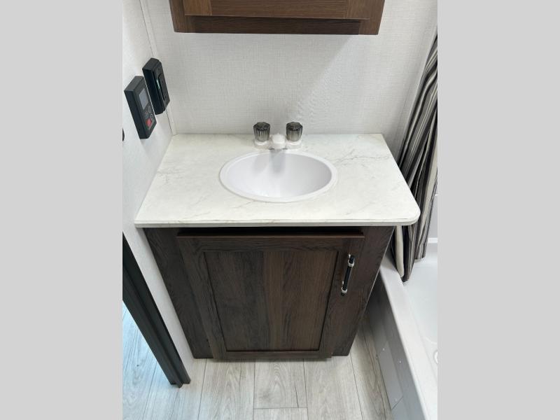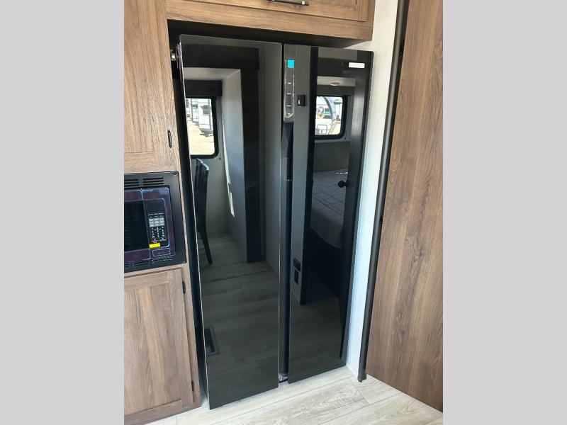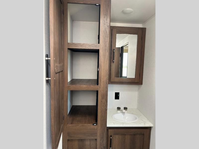 Extended stays are easy in this spacious destination trailer. Since there are two private bedrooms and two full baths, you can camp with family and friends, plus there are triple slides for more space! The front bedroom includes a king bed slide out, a closet, dresser, plus washer and dryer prep if you choose to add those appliances. The master bedroom towards the back features a queen bed slide, dual closets, and a full rear bath, and both bathrooms includes a shower with a seat for more comfort! Everyone can meet in the combined kitchen and living area to relax on the tri-fold sofa, play a game at the flex lounge, or just enjoy the 50" TV and fireplace. And the full kitchen is sure to impress with its three burner gas oven, air fryer microwave, and 16 cu. ft. refrigerator!