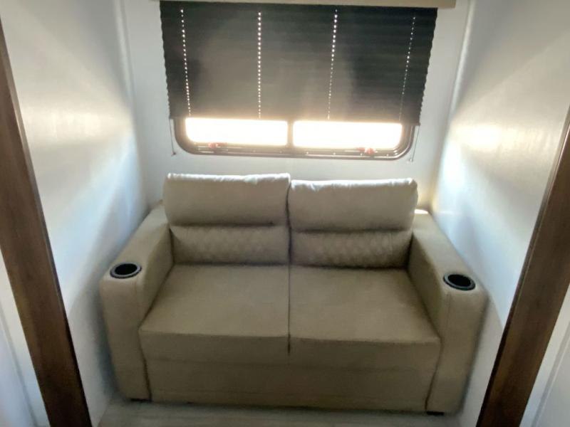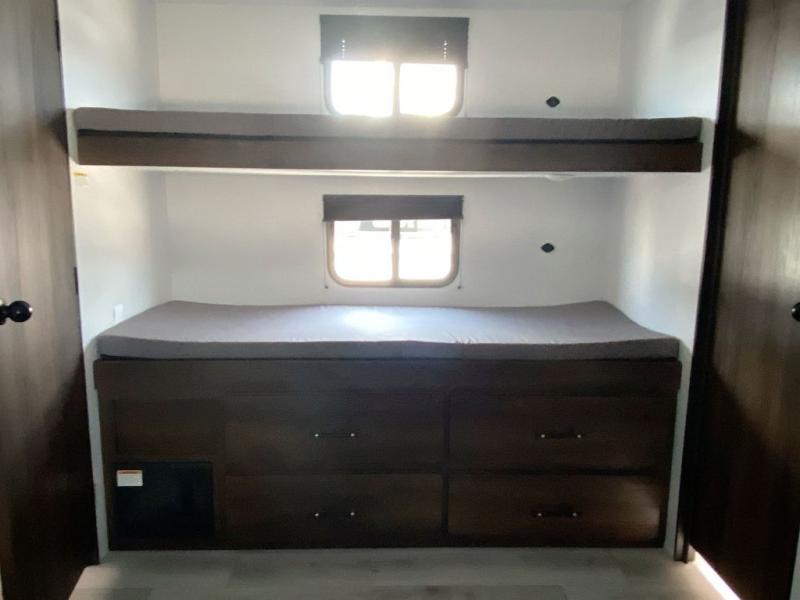 • Rear private bunkhouse suite featuring two bunks, a tri-fold sofa slide, and a full bath with exterior entry