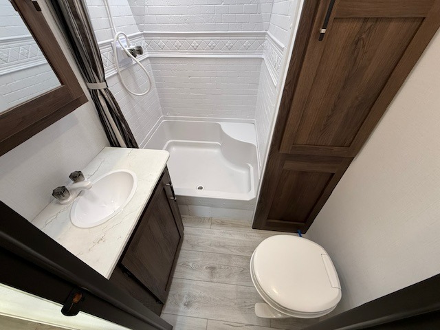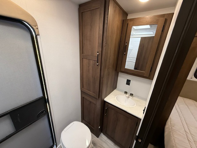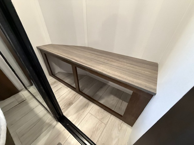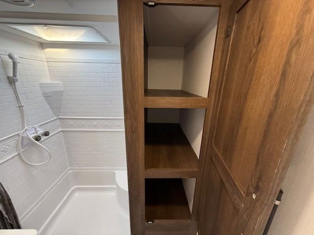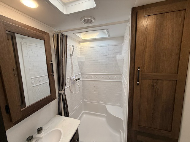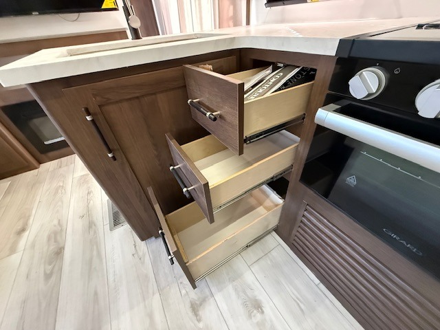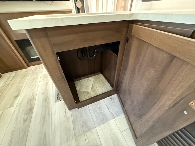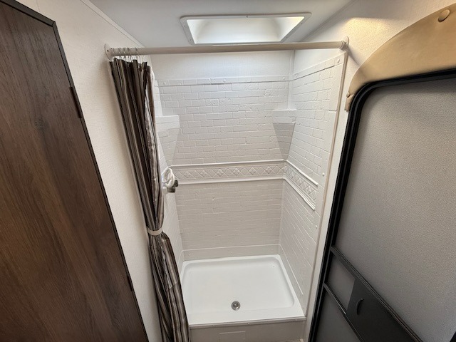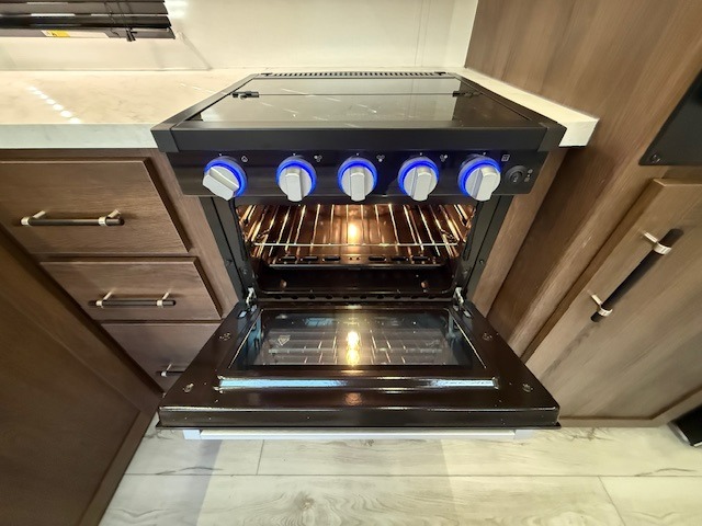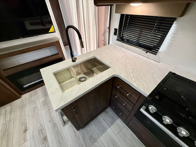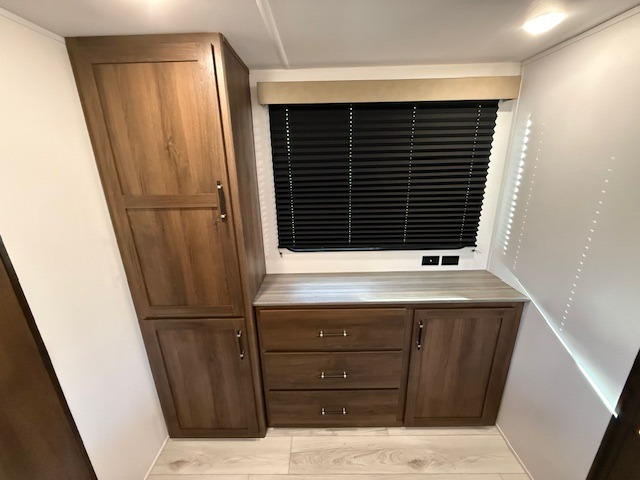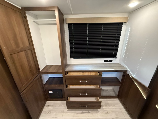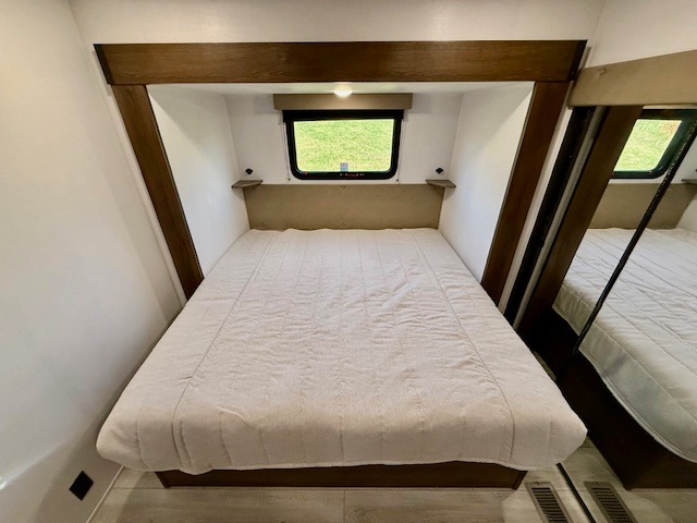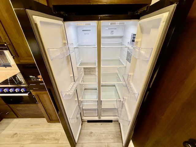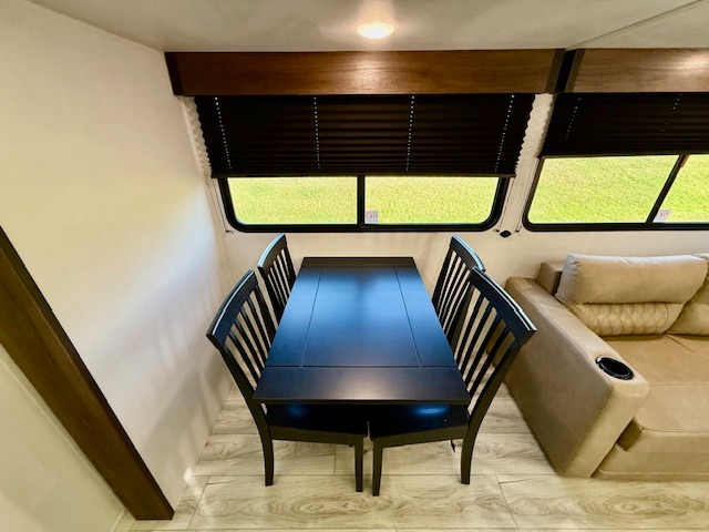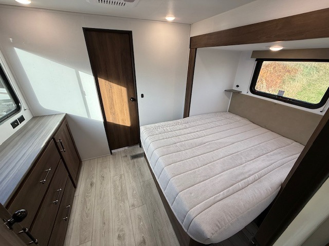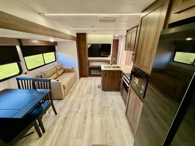 This is the perfect trailer to travel with friends and family since there are two bedrooms! The front bedroom includes a king bed slide out, a closet, dresser, plus washer and dryer prep if you choose to add these appliances. There is also a full bath right next to this room for easy access. Head to the rear master bedroom to find a queen bed slide out, a dresser and a closet, plus a full rear bath with one of the dual entry doors to the unit for added convenience. Everyone can meet in the combined kitchen and living area in the morning while the chef makes breakfast on the three burner gas range. There is a free-standing table and a tri-fold sofa within the large slide out here, and the entertainment center with a fireplace is close by to make it more cozy. After breakfast you can head out on a trail or two, or just relax outdoors under the 20' power awning!