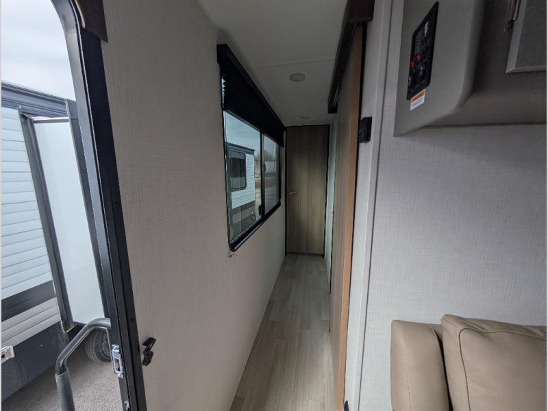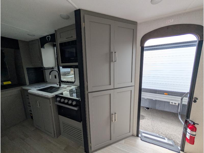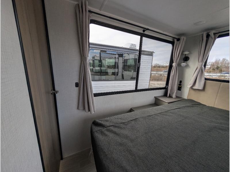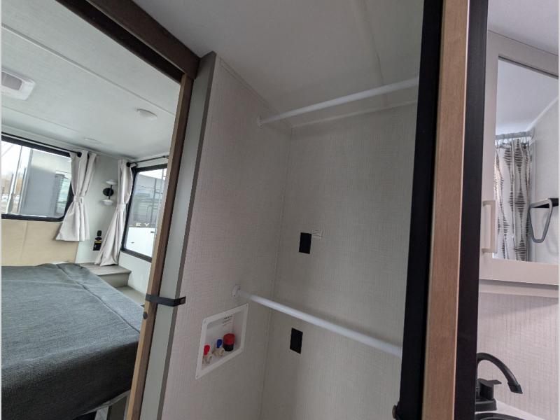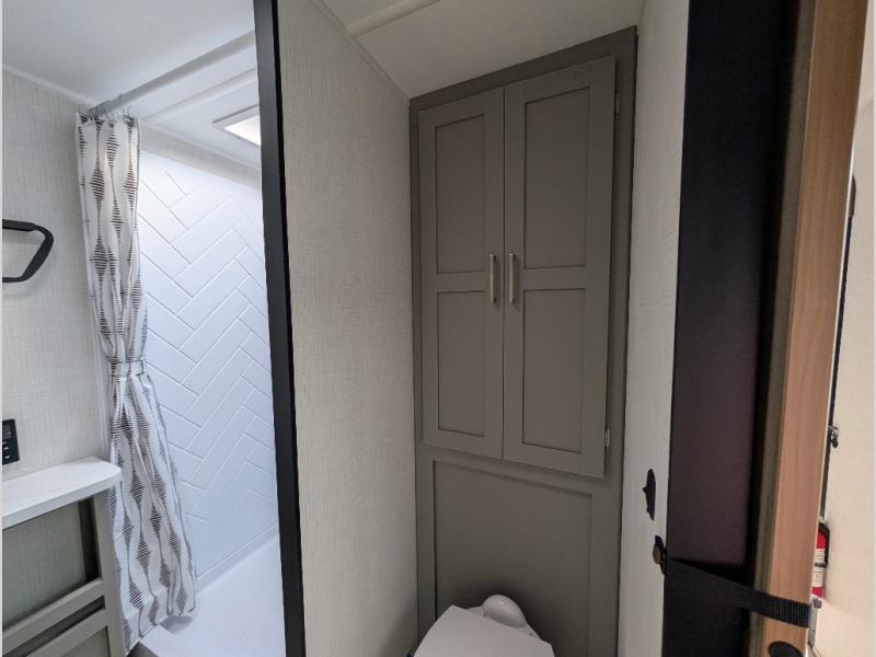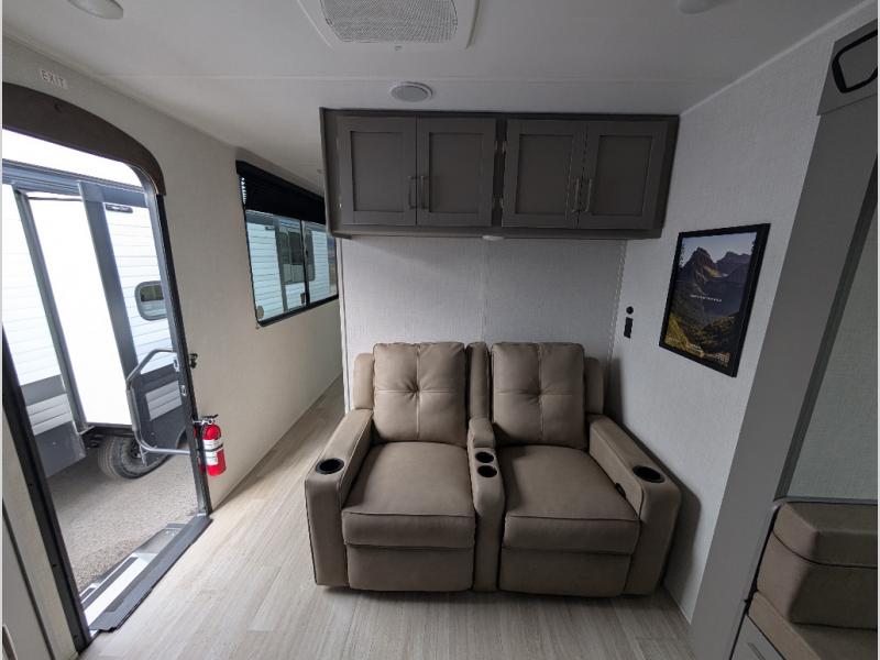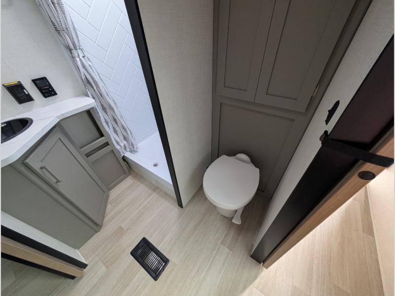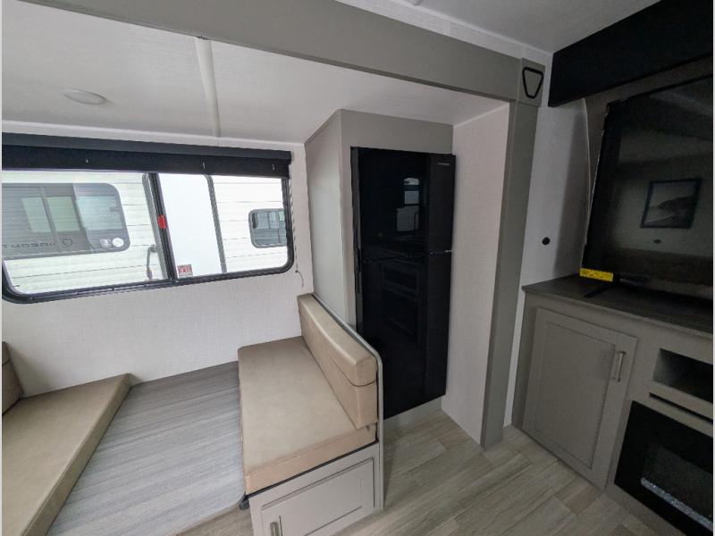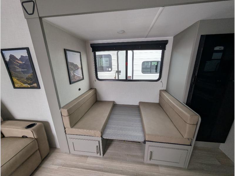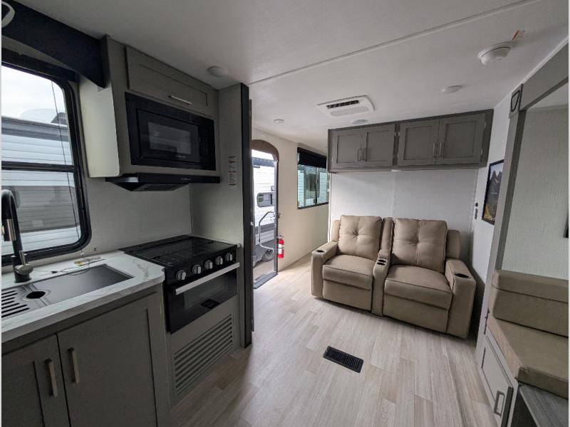 This travel trailer is designed for campers who want extra comfort without giving up easy towing, this travel trailer offers a smart, functional layout for everyday living on the road. Featuring a complete bath with 30" x 36" shower and linen storage. You get inviting seating, a well-equipped kitchen, and plenty of storage so you can settle in and feel at home on every trip. This floorplan stands out with its 50" TV perfectly positioned for movie nights, plus dedicated wardrobe and shoe storage to keep clutter under control. At the end of the day, you can stretch out on the Olympic queen bed, giving you more sleeping space than a standard queen, and the kitchen’s air fryer microwave lets you whip up quick, crispy meals without needing extra appliances.