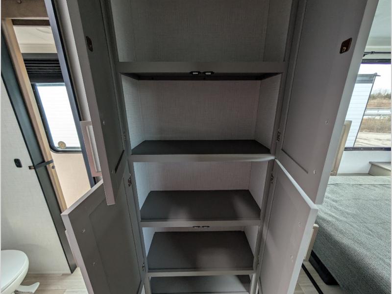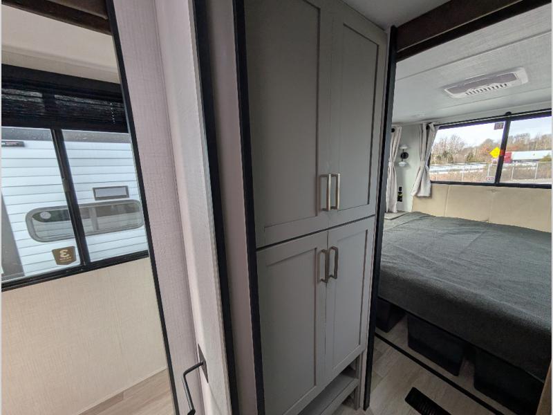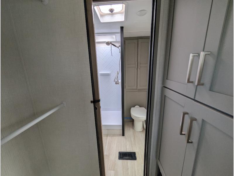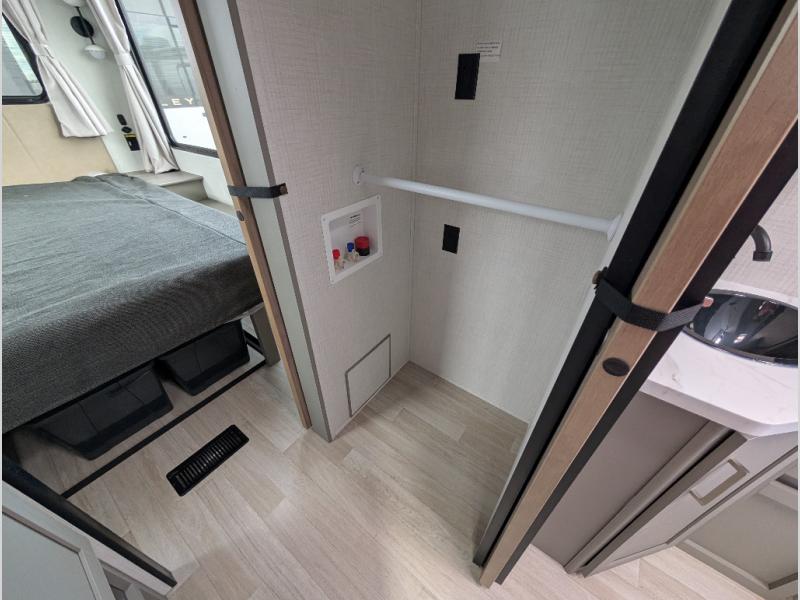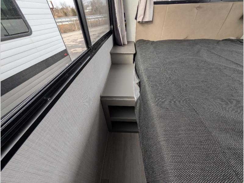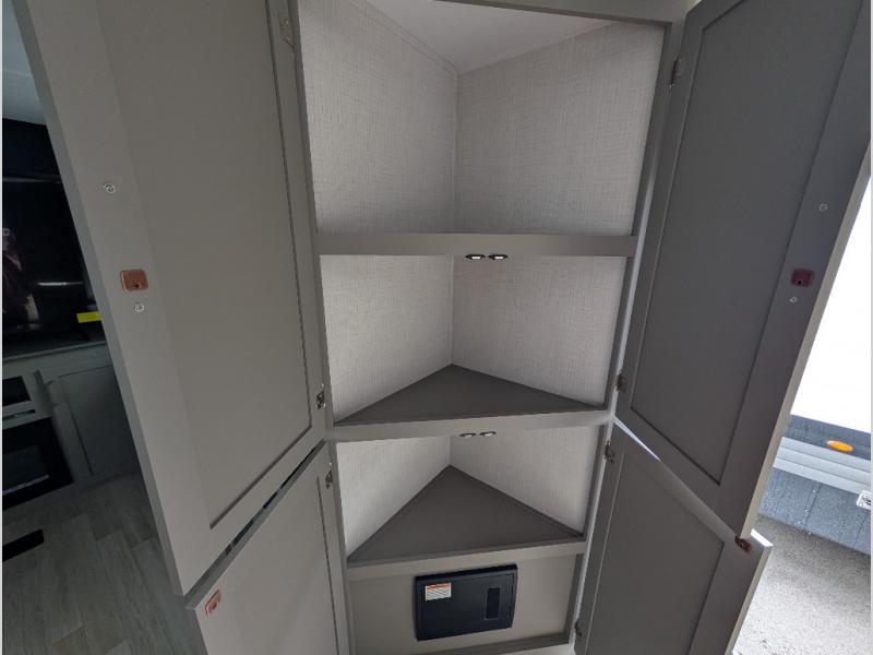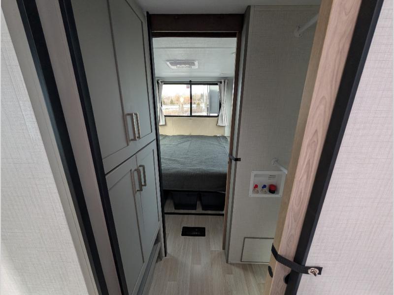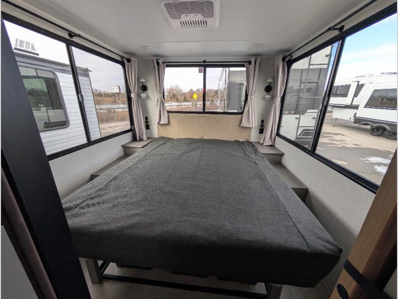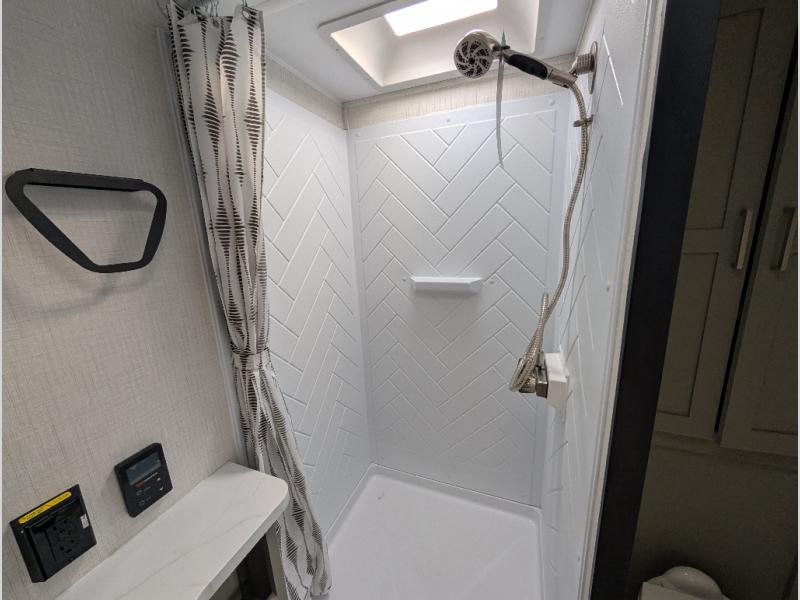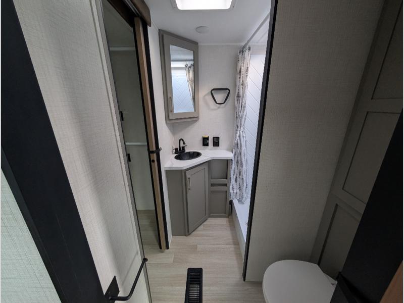 This travel trailer is designed for campers who want extra comfort without giving up easy towing, this travel trailer offers a smart, functional layout for everyday living on the road. Featuring a complete bath with 30" x 36" shower and linen storage. You get inviting seating, a well-equipped kitchen, and plenty of storage so you can settle in and feel at home on every trip. This floorplan stands out with its 50" TV perfectly positioned for movie nights, plus dedicated wardrobe and shoe storage to keep clutter under control. At the end of the day, you can stretch out on the Olympic queen bed, giving you more sleeping space than a standard queen, and the kitchen’s air fryer microwave lets you whip up quick, crispy meals without needing extra appliances.