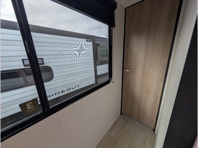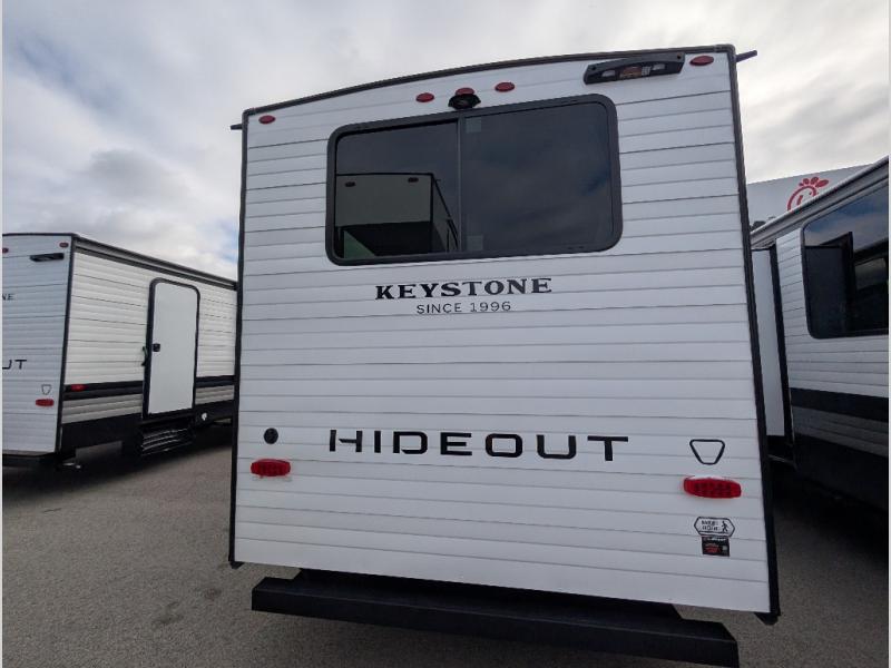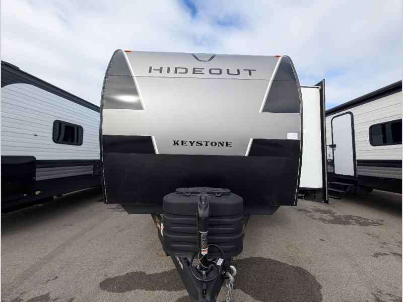 Hideout Max travel trailers by Keystone are built to make the most of every trip, with durable construction, a fully walkable roof with ladder prep, tinted safety glass windows, and solid step entry steps that make getting in and out easy. Standard features like a waterproof drop-frame pass-through for bulky gear, a power awning with LED lights, power stabilizer jacks, and a power tongue jack keep campsite setup simple, while the tankless water heater, SolarFlex™-ready wiring, and 26K dual A/C system on 30-amp service help every Hideout Max feel comfortable and capable, no matter which floorplan you choose.
