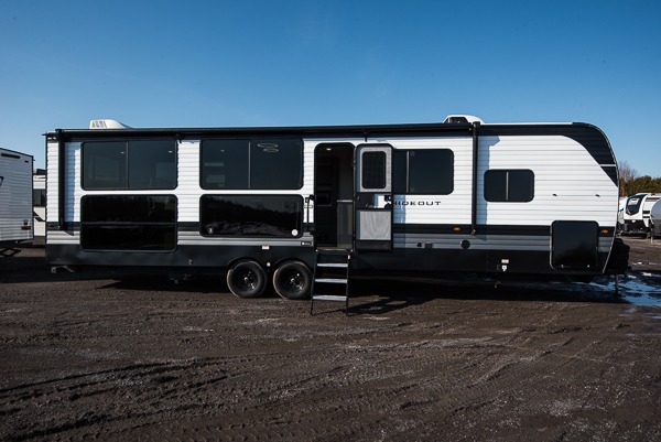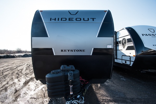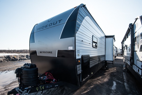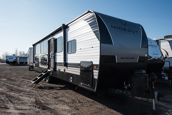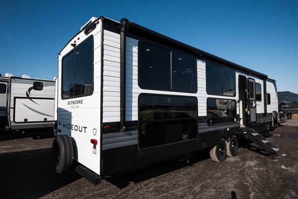 Hideout Max travel trailers by Keystone are built to make the most of every trip, with durable construction, a fully walkable roof with ladder prep, tinted safety glass windows, and solid step entry steps that make getting in and out easy. Standard features like a waterproof drop-frame pass-through for bulky gear, a power awning with LED lights, power stabilizer jacks, and a power tongue jack keep campsite setup simple, while the tankless water heater, SolarFlex™-ready wiring, and 26K dual A/C system on 30-amp service help every Hideout Max feel comfortable and capable, no matter which floorplan you choose.