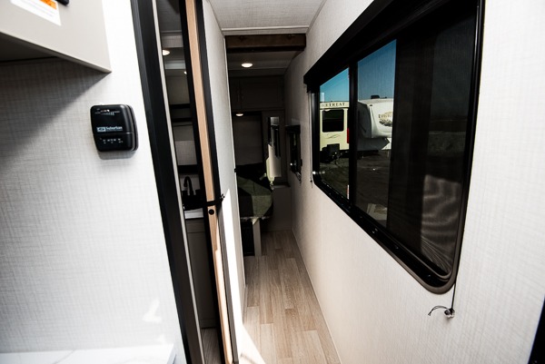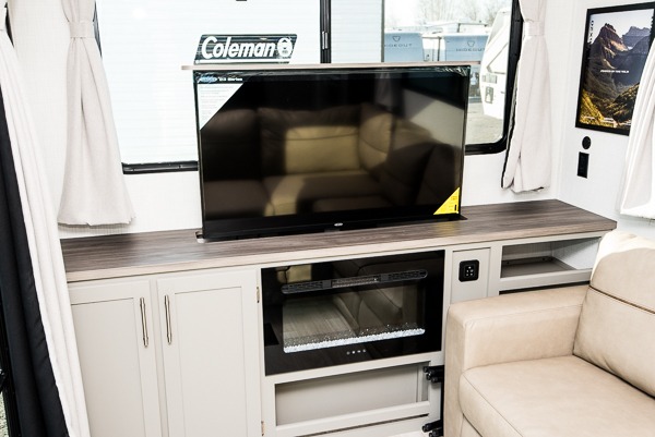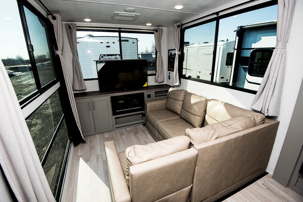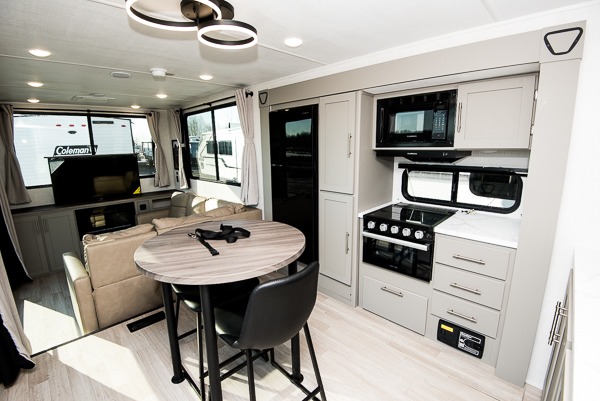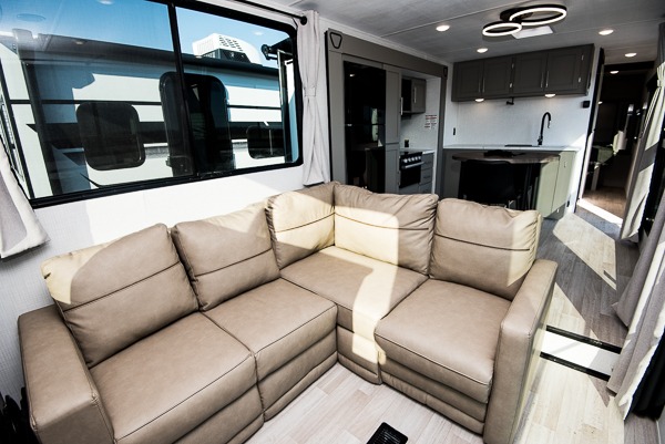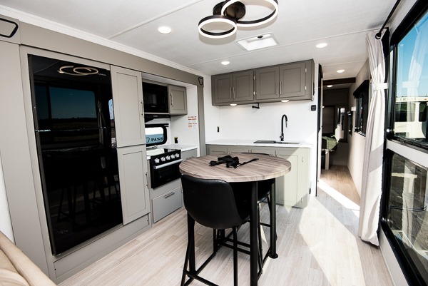 This travel trailer is designed for campers who want residential-style comfort without giving up easy towing, offering a smart, functional layout for everyday living on the road. A sunken living room creates a cozy, separate lounge space, complete with a fireplace and a large sectional sofa that’s perfect for stretching out or hosting friends. In the kitchen area, a bistro table gives you a stylish spot for coffee, meals, or laptops without eating up floor space. At the end of the day, you can retreat to the front bedroom where an Olympic queen bed and dual wardrobes provide extra sleeping room and plenty of storage so you can stay organized and feel at home on every trip.
