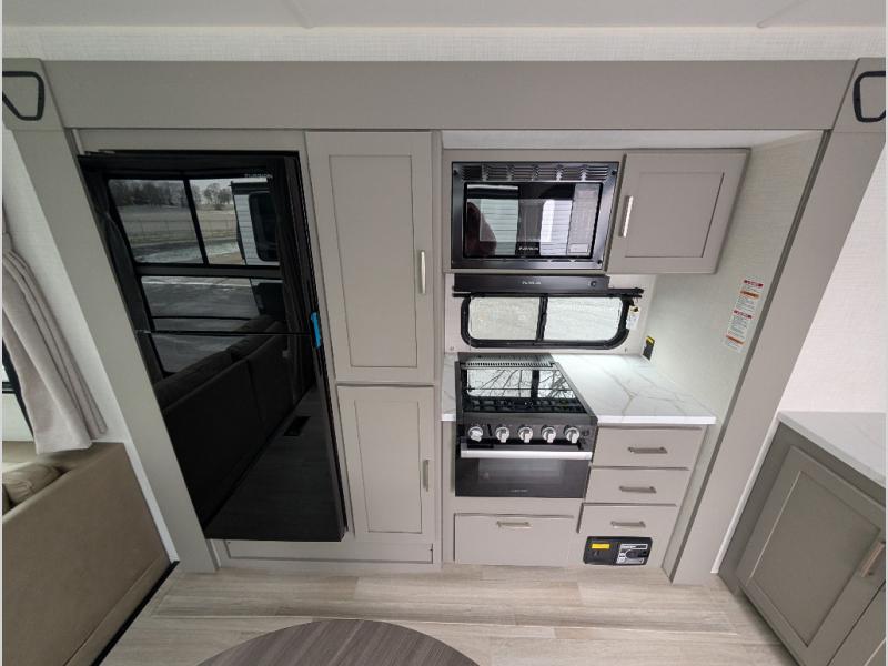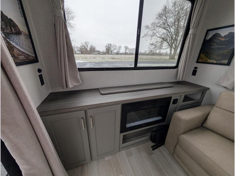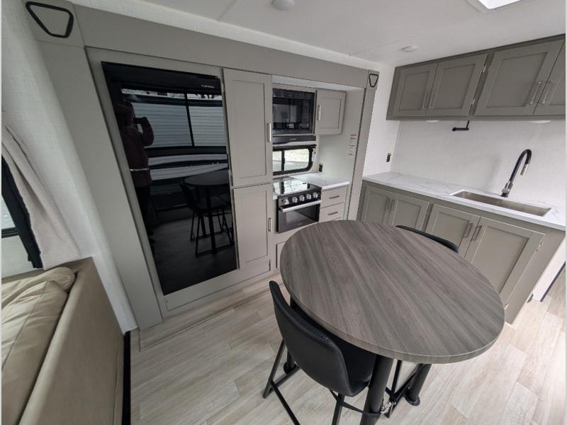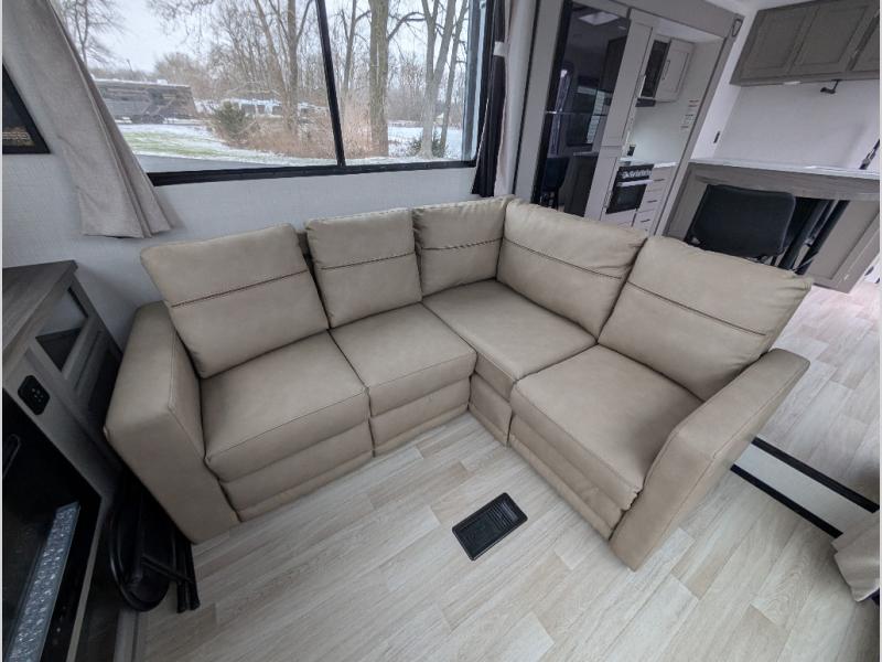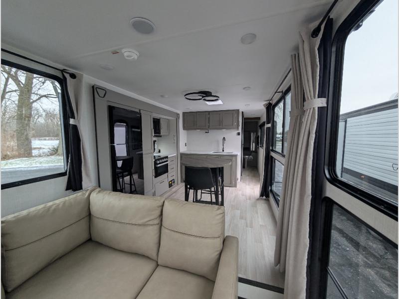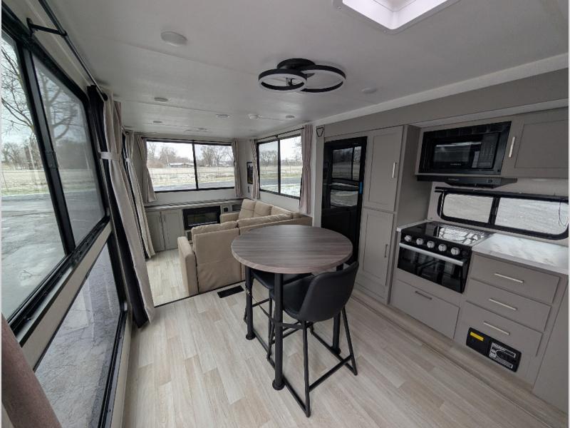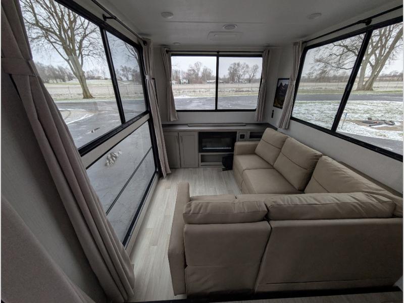 This travel trailer is designed for campers who want residential-style comfort without giving up easy towing, offering a smart, functional layout for everyday living on the road. A sunken living room creates a cozy, separate lounge space, complete with a fireplace and a large sectional sofa that’s perfect for stretching out or hosting friends. In the kitchen area, a bistro table gives you a stylish spot for coffee, meals, or laptops without eating up floor space. At the end of the day, you can retreat to the front bedroom where an Olympic queen bed and dual wardrobes provide extra sleeping room and plenty of storage so you can stay organized and feel at home on every trip.