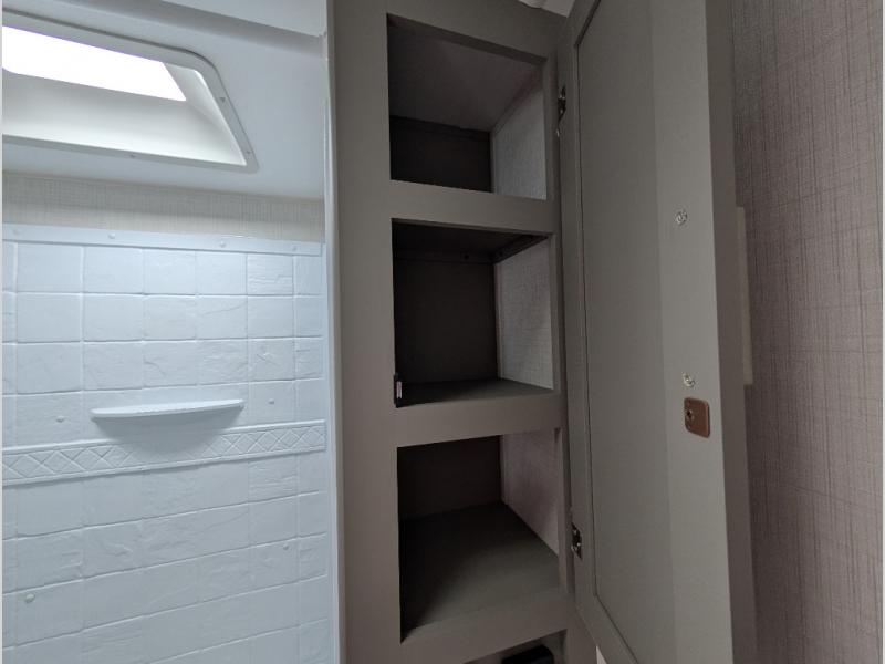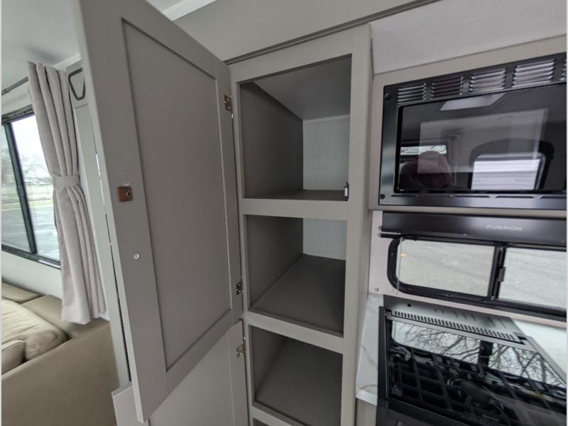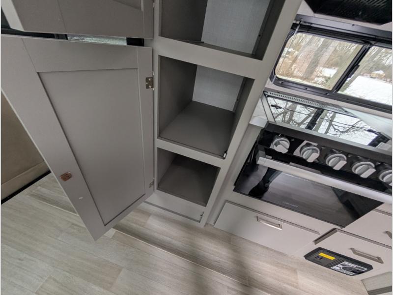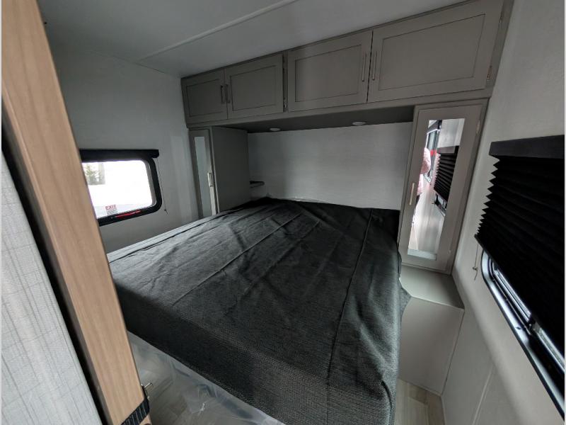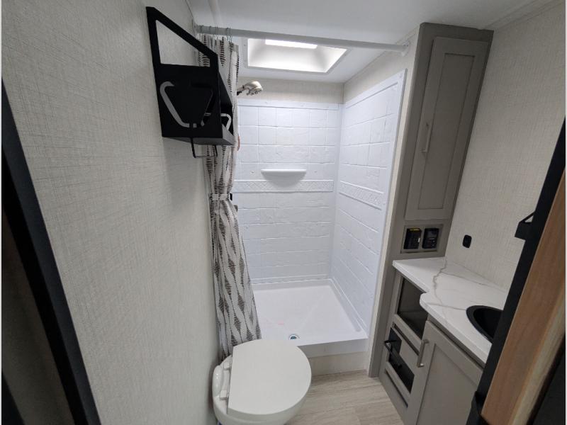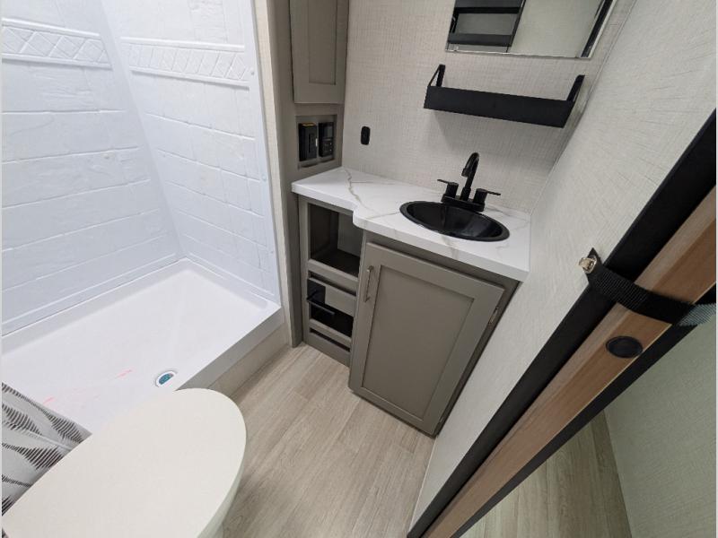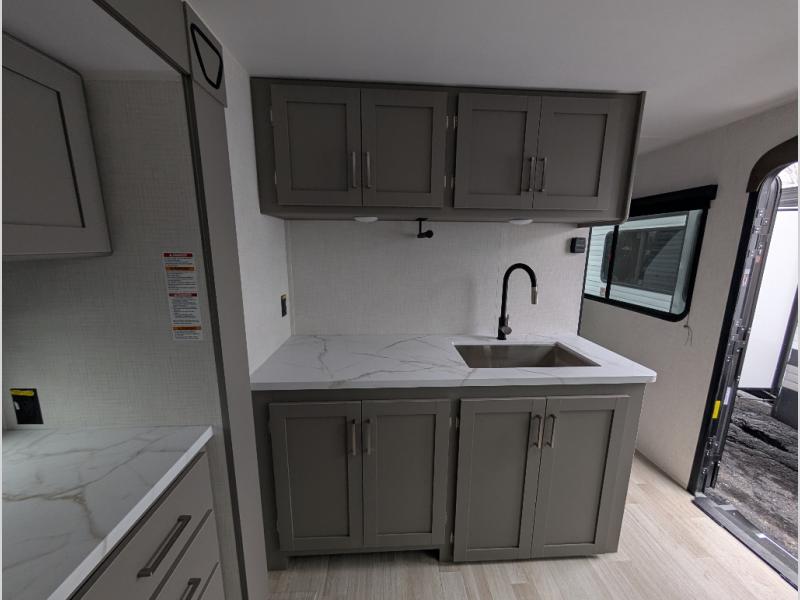 This travel trailer is designed for campers who want residential-style comfort without giving up easy towing, offering a smart, functional layout for everyday living on the road. A sunken living room creates a cozy, separate lounge space, complete with a fireplace and a large sectional sofa that’s perfect for stretching out or hosting friends. In the kitchen area, a bistro table gives you a stylish spot for coffee, meals, or laptops without eating up floor space. At the end of the day, you can retreat to the front bedroom where an Olympic queen bed and dual wardrobes provide extra sleeping room and plenty of storage so you can stay organized and feel at home on every trip.