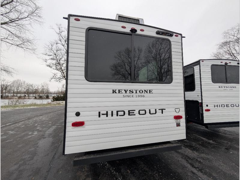 Hideout Max travel trailers by Keystone are built to make the most of every trip, with durable construction, a fully walkable roof with ladder prep, tinted safety glass windows, and solid step entry steps that make getting in and out easy. Standard features like a waterproof drop-frame pass-through for bulky gear, a power awning with LED lights, power stabilizer jacks, and a power tongue jack keep campsite setup simple, while the tankless water heater, SolarFlex™-ready wiring, and 26K dual A/C system on 30-amp service help every Hideout Max feel comfortable and capable, no matter which floorplan you choose.