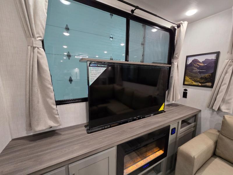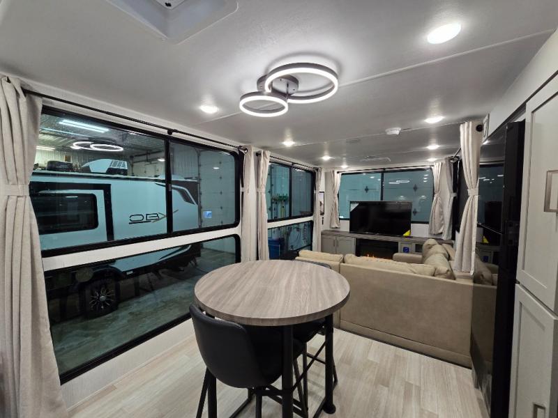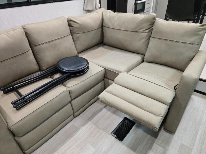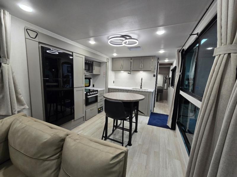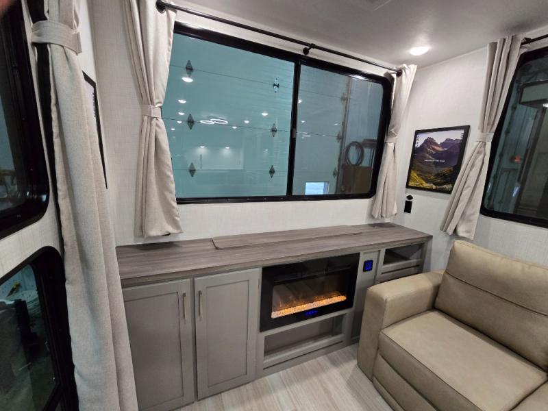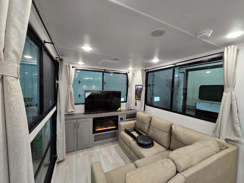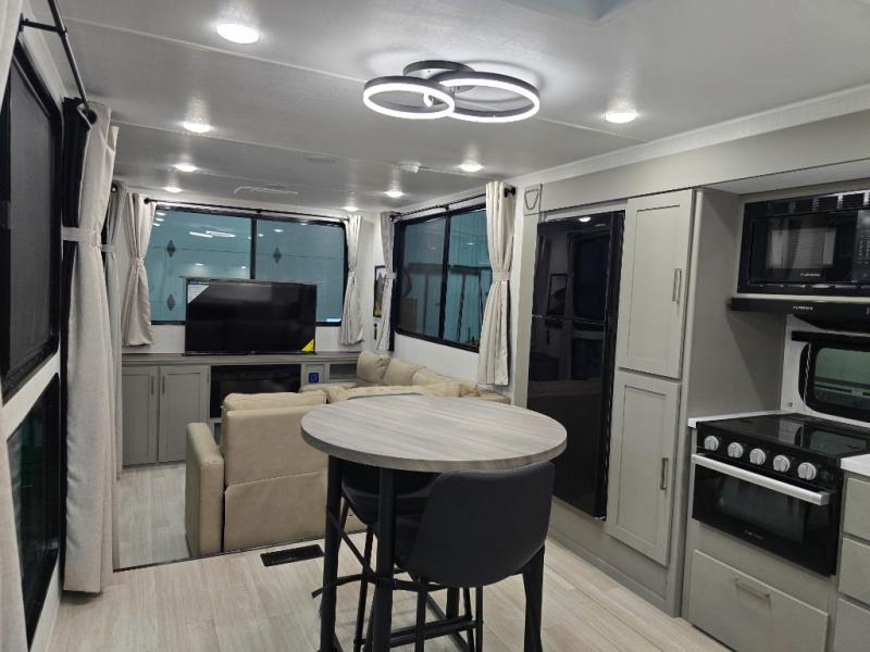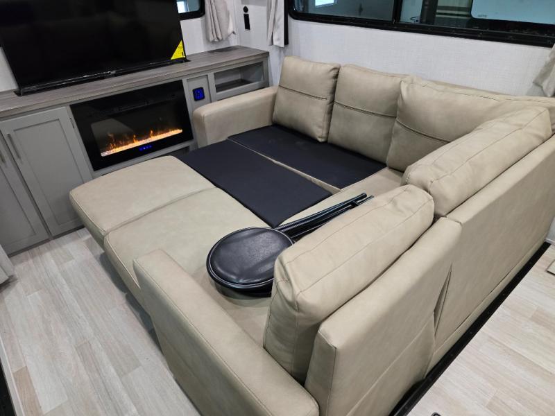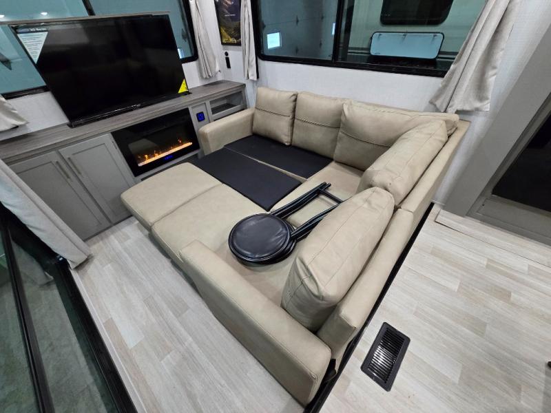 This travel trailer is designed for campers who want residential-style comfort without giving up easy towing, offering a smart, functional layout for everyday living on the road. A sunken living room creates a cozy, separate lounge space, complete with a fireplace and a large sectional sofa that’s perfect for stretching out or hosting friends. In the kitchen area, a bistro table gives you a stylish spot for coffee, meals, or laptops without eating up floor space. At the end of the day, you can retreat to the front bedroom where an Olympic queen bed and dual wardrobes provide extra sleeping room and plenty of storage so you can stay organized and feel at home on every trip.
