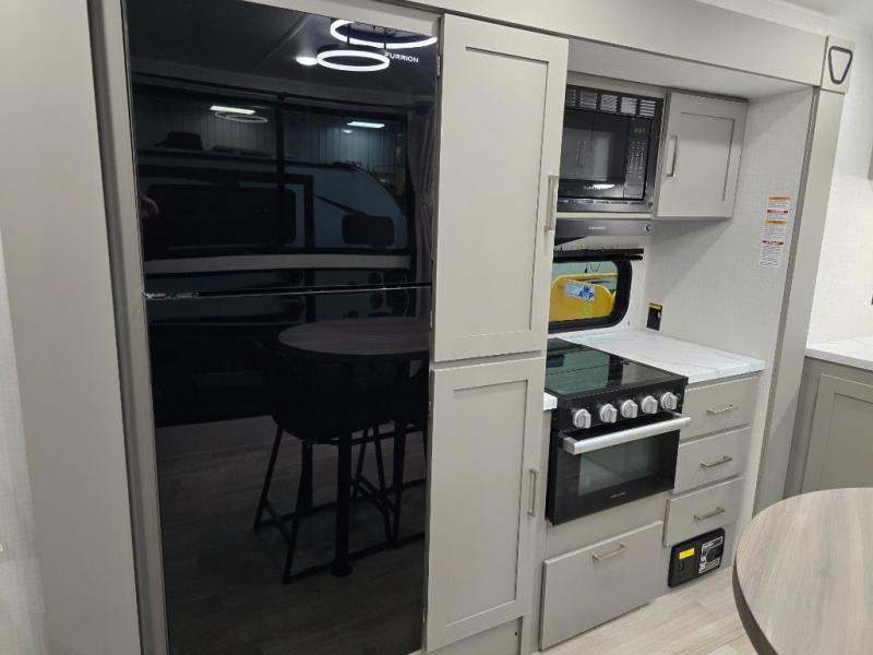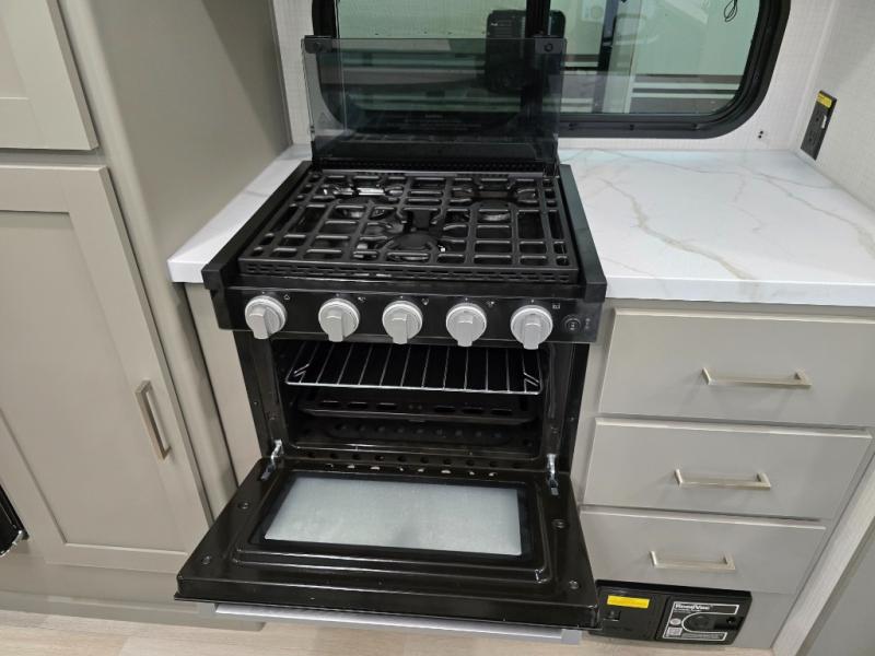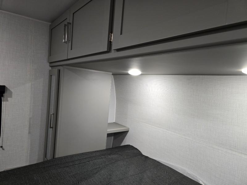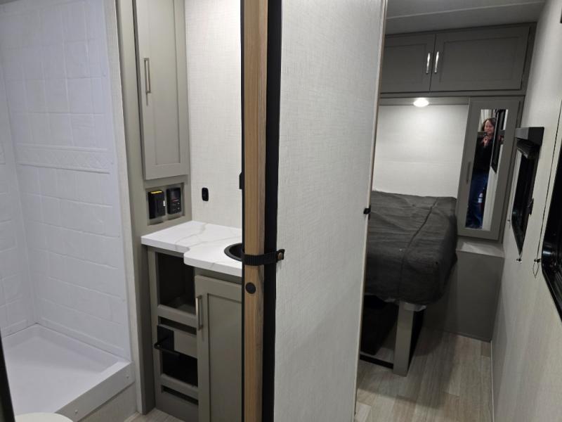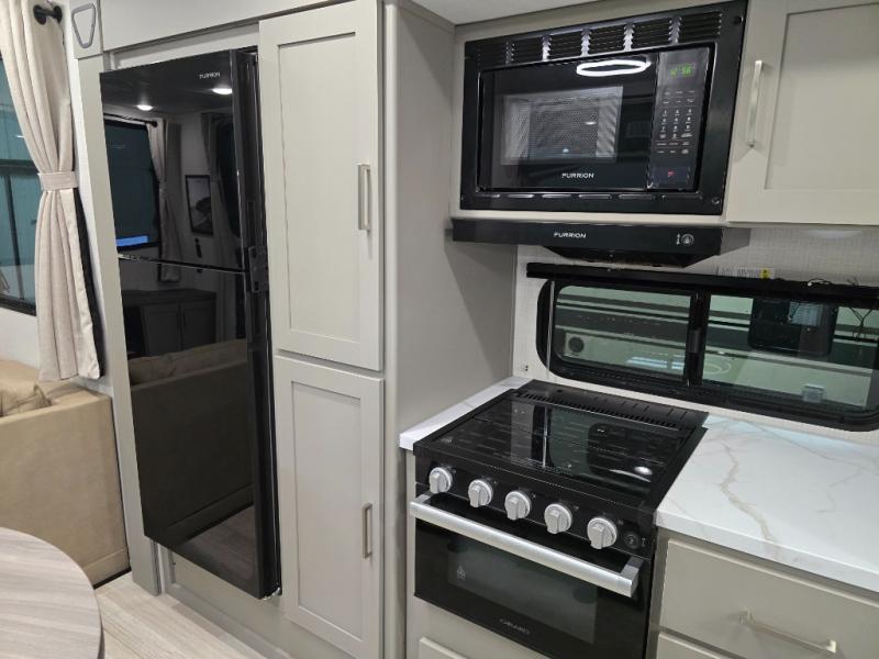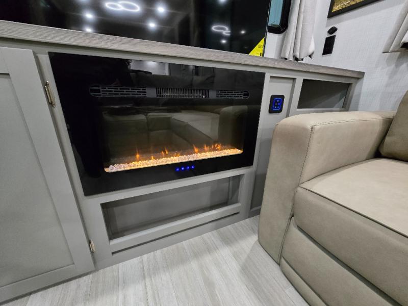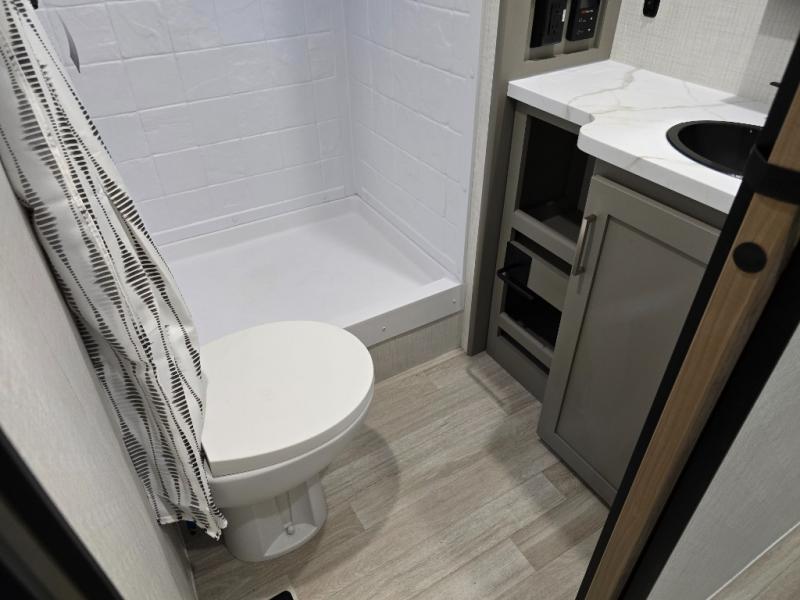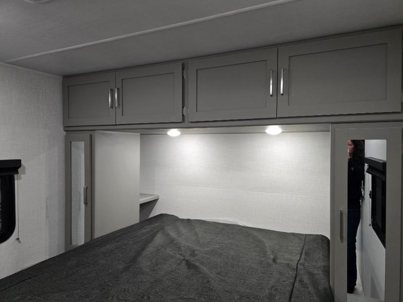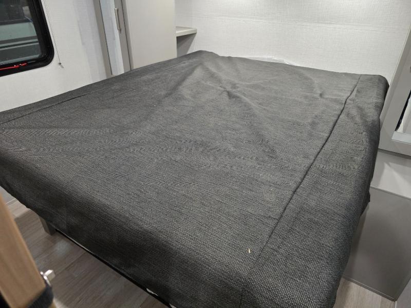 This travel trailer is designed for campers who want residential-style comfort without giving up easy towing, offering a smart, functional layout for everyday living on the road. A sunken living room creates a cozy, separate lounge space, complete with a fireplace and a large sectional sofa that’s perfect for stretching out or hosting friends. In the kitchen area, a bistro table gives you a stylish spot for coffee, meals, or laptops without eating up floor space. At the end of the day, you can retreat to the front bedroom where an Olympic queen bed and dual wardrobes provide extra sleeping room and plenty of storage so you can stay organized and feel at home on every trip.