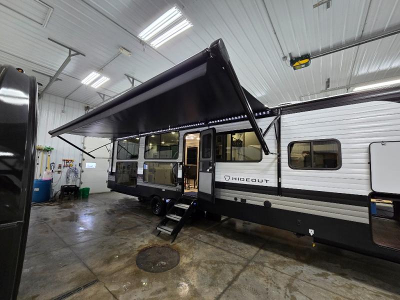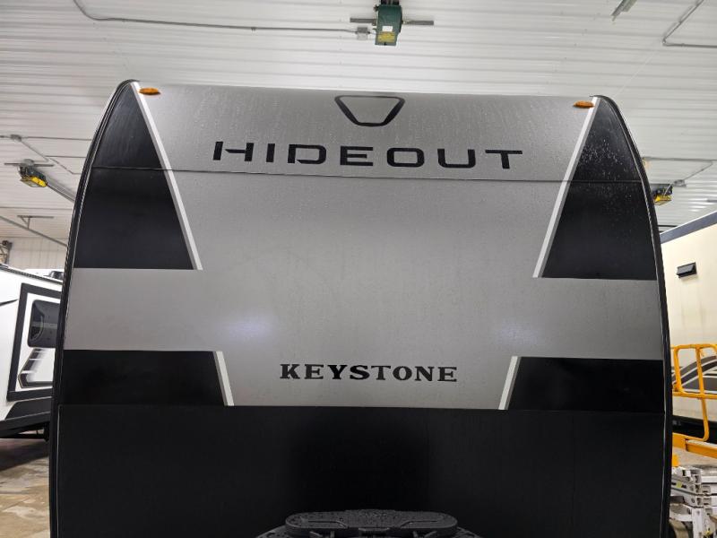 Hideout Max travel trailers by Keystone are built to make the most of every trip, with durable construction, a fully walkable roof with ladder prep, tinted safety glass windows, and solid step entry steps that make getting in and out easy. Standard features like a waterproof drop-frame pass-through for bulky gear, a power awning with LED lights, power stabilizer jacks, and a power tongue jack keep campsite setup simple, while the tankless water heater, SolarFlex™-ready wiring, and 26K dual A/C system on 30-amp service help every Hideout Max feel comfortable and capable, no matter which floorplan you choose.