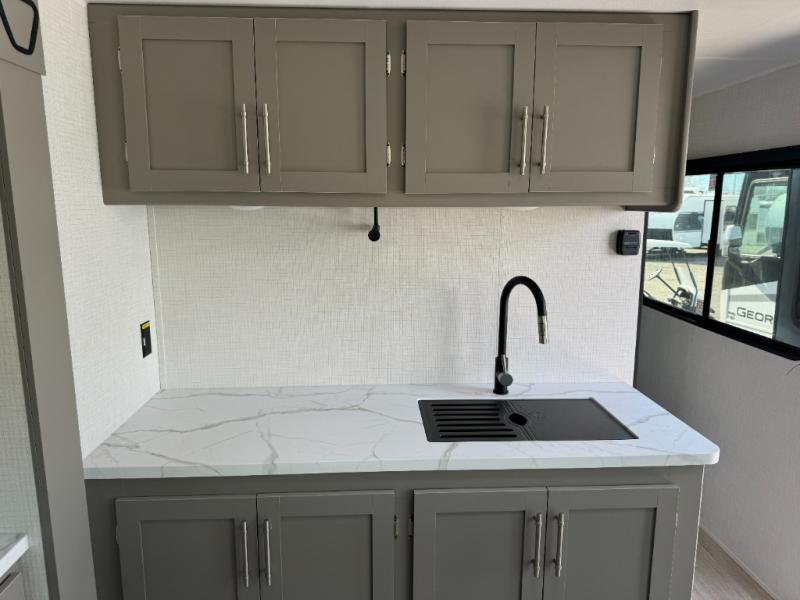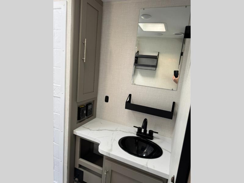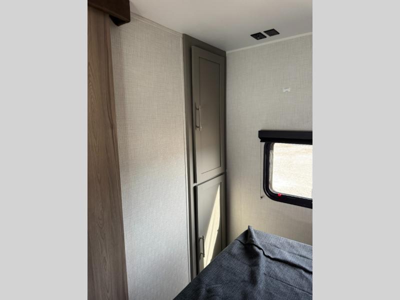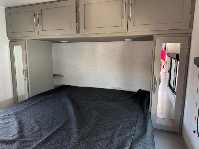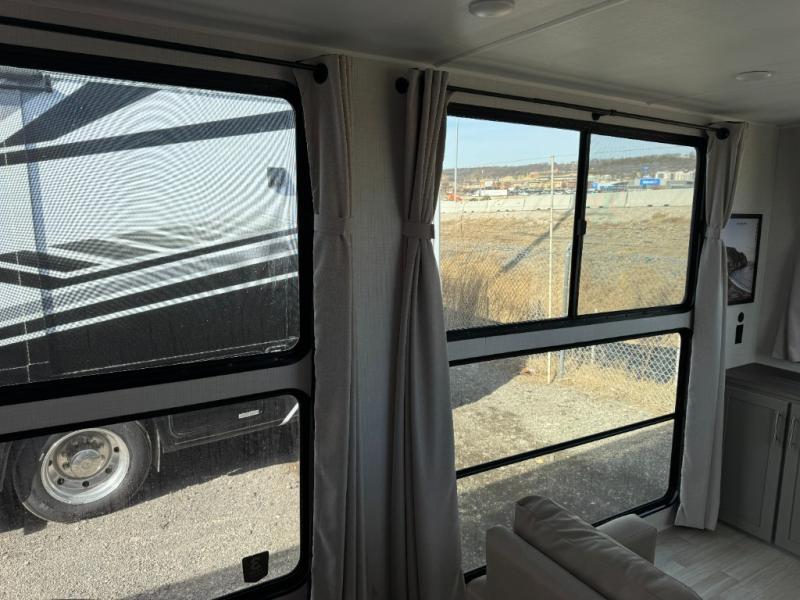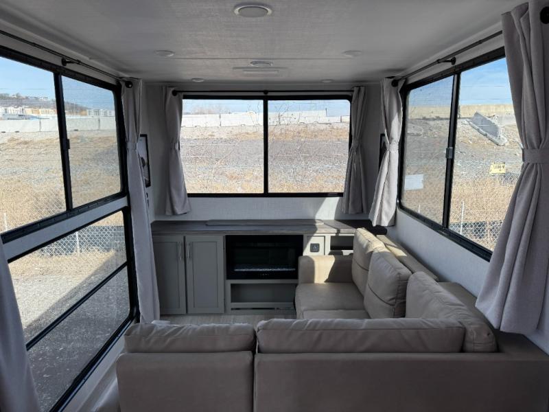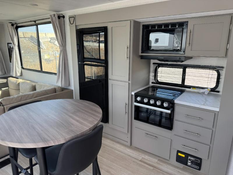 This travel trailer is designed for campers who want residential-style comfort without giving up easy towing, offering a smart, functional layout for everyday living on the road. A sunken living room creates a cozy, separate lounge space, complete with a fireplace and a large sectional sofa that’s perfect for stretching out or hosting friends. In the kitchen area, a bistro table gives you a stylish spot for coffee, meals, or laptops without eating up floor space. At the end of the day, you can retreat to the front bedroom where an Olympic queen bed and dual wardrobes provide extra sleeping room and plenty of storage so you can stay organized and feel at home on every trip.