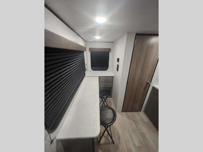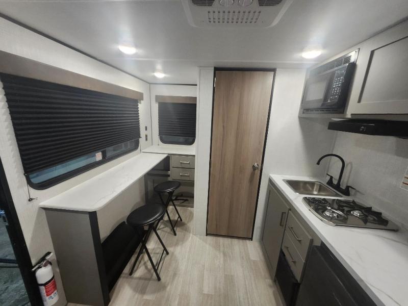 Your small crew will love camping in this lightweight travel trailer. There is a full-size bed up front with an overhead shelf to keep belongings out of the way. The two-burner cooktop and microwave oven will let you make breakfast in the morning, and the bar table with two stools provides a place to dine together. And a private bath with a shower and toilet lets you easily clean up after a day outdoors!