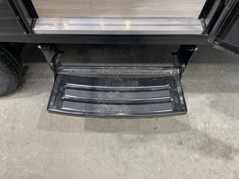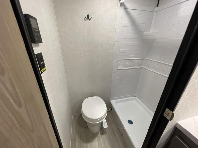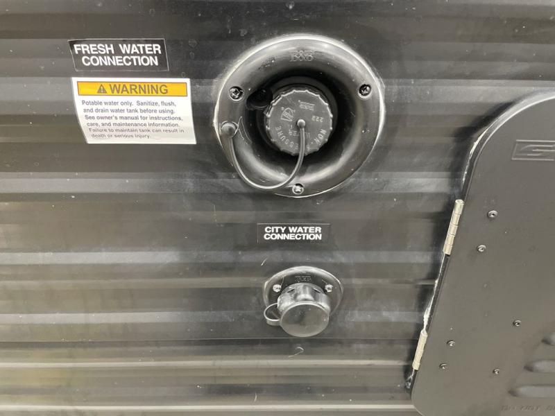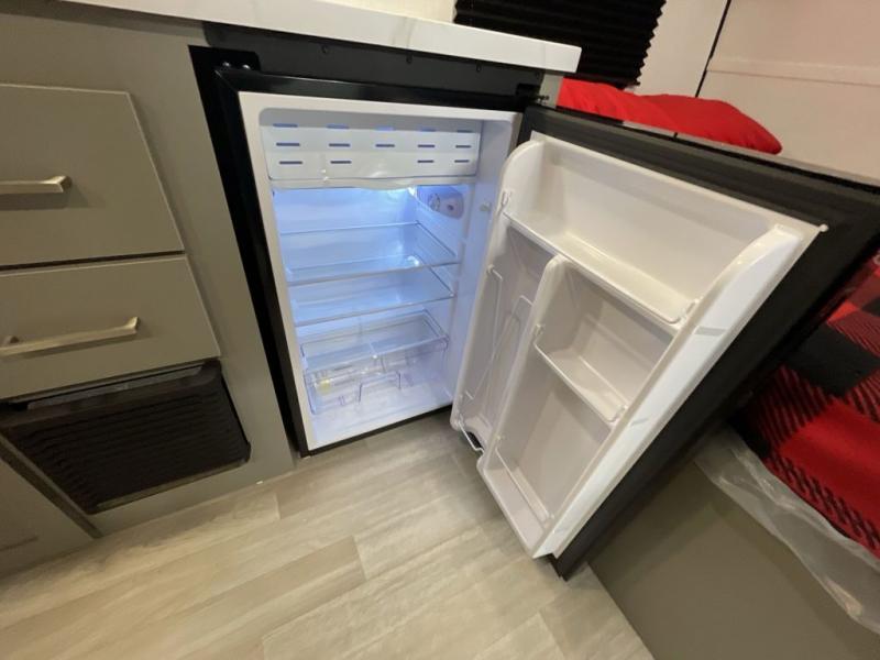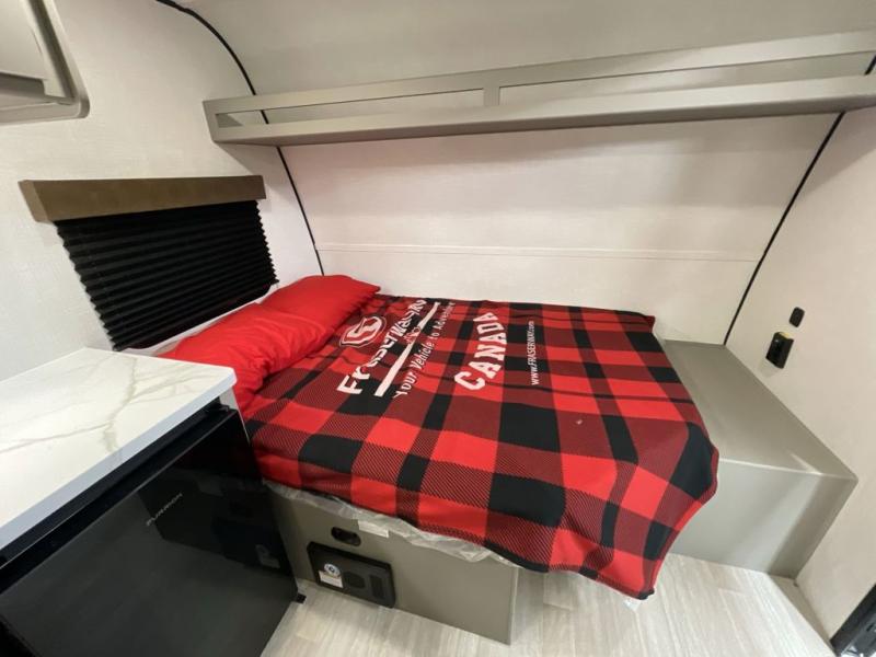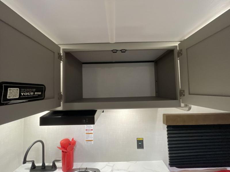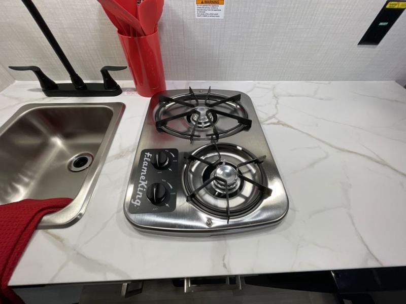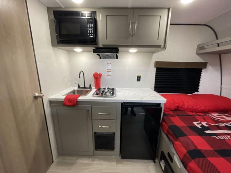 Your small crew will love camping in this lightweight travel trailer. There is a full-size bed up front with an overhead shelf to keep belongings out of the way. The two-burner cooktop and microwave oven will let you make breakfast in the morning, and the bar table with two stools provides a place to dine together. And a private bath with a shower and toilet lets you easily clean up after a day outdoors!