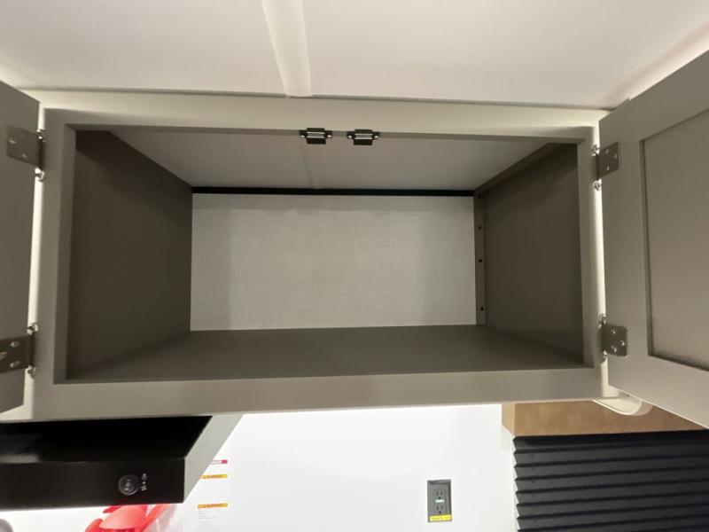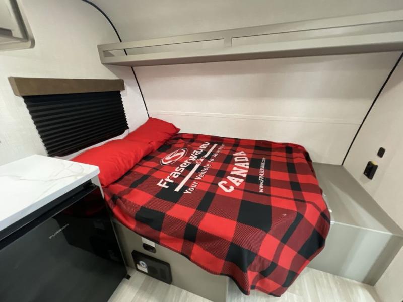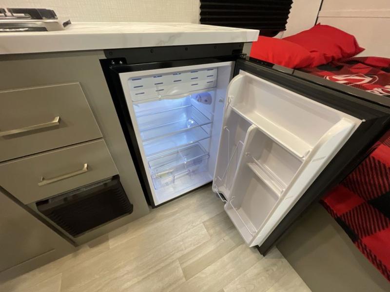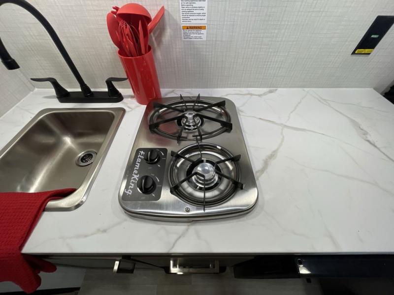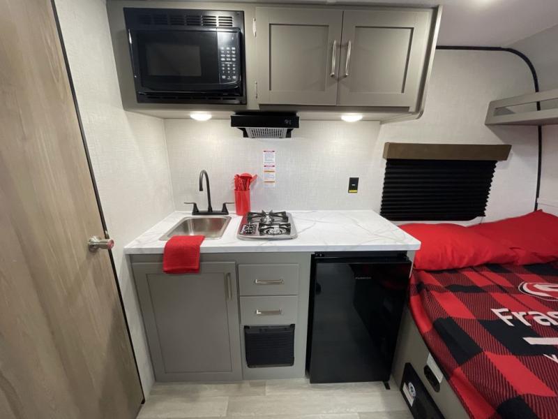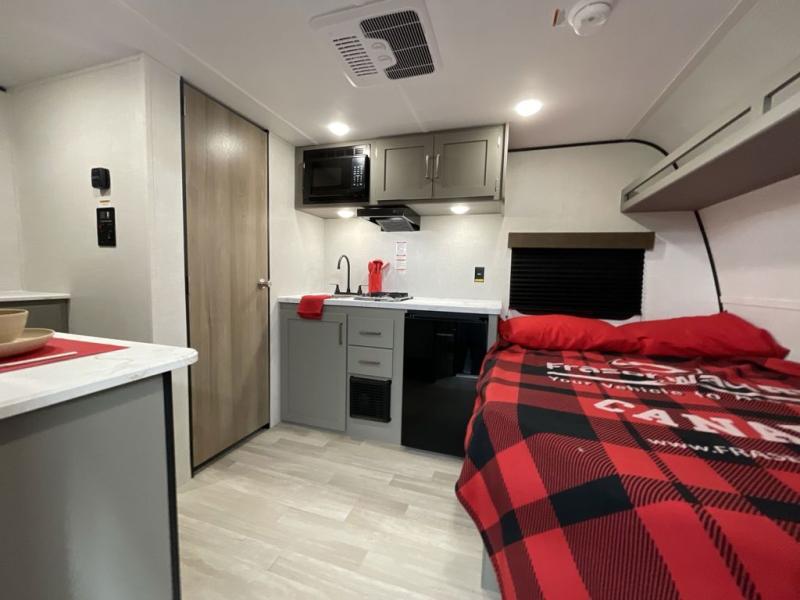 Your small crew will love camping in this lightweight travel trailer. There is a full-size bed up front with an overhead shelf to keep belongings out of the way. The two-burner cooktop and microwave oven will let you make breakfast in the morning, and the bar table with two stools provides a place to dine together. And a private bath with a shower and toilet lets you easily clean up after a day outdoors!