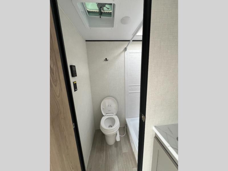 Your small crew will love camping in this lightweight travel trailer. There is a full-size bed up front with an overhead shelf to keep belongings out of the way. The two-burner cooktop and microwave oven will let you make breakfast in the morning, and the bar table with two stools provides a place to dine together. And a private bath with a shower and toilet lets you easily clean up after a day outdoors!