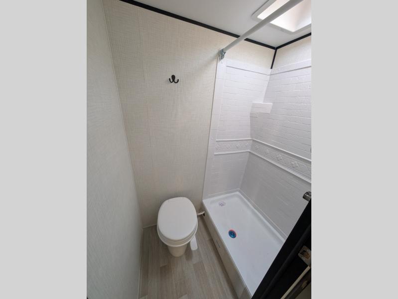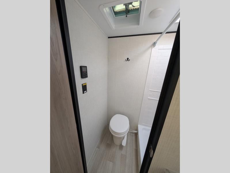 This lightweight travel trailer is perfect for six happy campers. You'll enjoy the front full-size bed, while your guests or little ones take the double-size bunks. There is also a shelf above the bed to keep your things organized. A private bath includes a shower with a toilet so you can freshen up each day without having to leave your camper. You can make your meals on the two-burner gas cooktop or in the microwave oven, then take your plate outdoors to eat under the 8' power awning!
