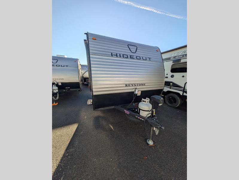 With any Hideout Mini travel trailer by Keystone, you will enjoy lightweight towing thanks to their single axle! The XL tinted safety glass windows are ultra durable, and the power awning will provide protection from the sun as you relax in your camp chairs outside. Each model includes blackout night shades, LED lighting, plus many more interior comforts. There is also a 20K BTU furnace to keep you comfortable, plus a tankless water heater for endless hot showers!
