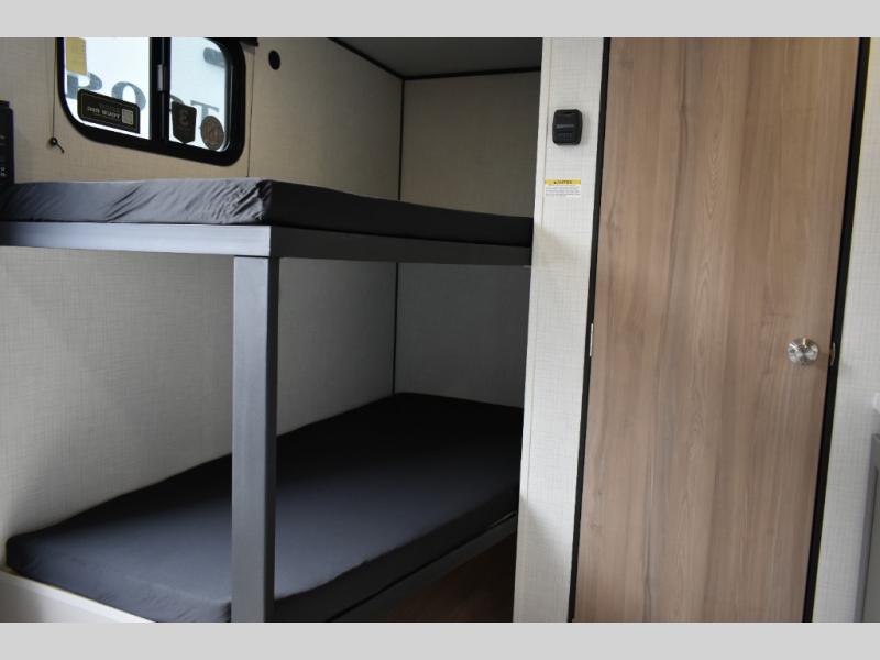 This lightweight travel trailer is perfect for six happy campers. You'll enjoy the front full-size bed, while your guests or little ones take the double-size bunks. There is also a shelf above the bed to keep your things organized. A private bath includes a shower with a toilet so you can freshen up each day without having to leave your camper. You can make your meals on the two-burner gas cooktop or in the microwave oven, then take your plate outdoors to eat under the 8' power awning!