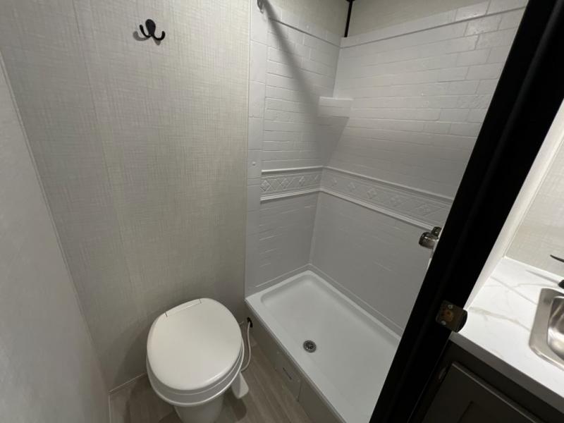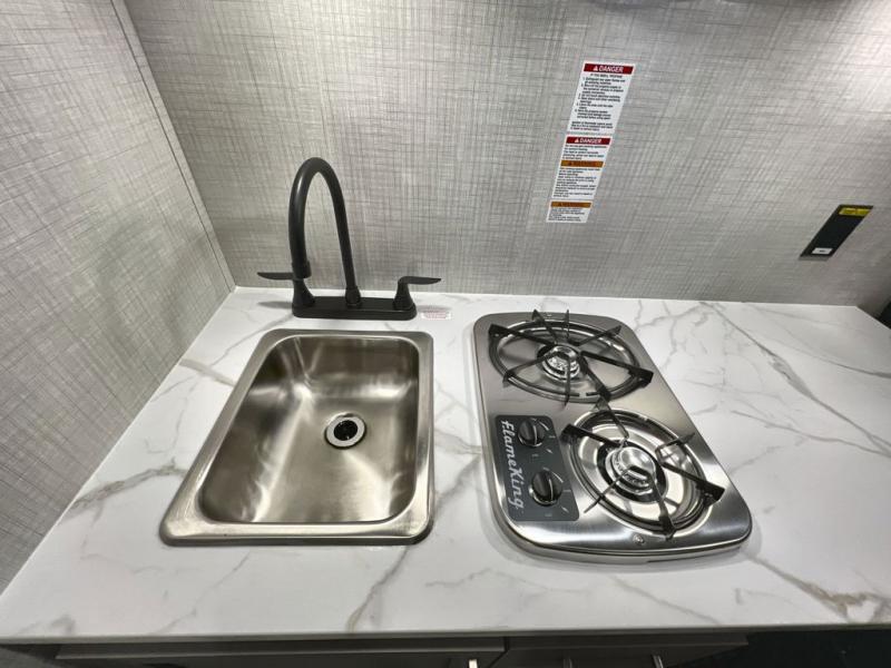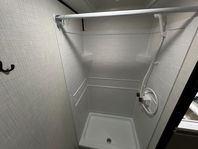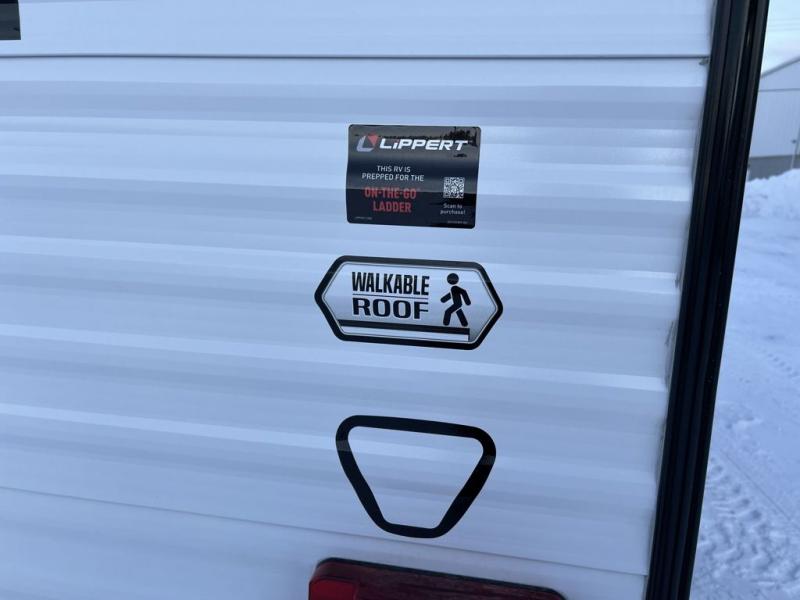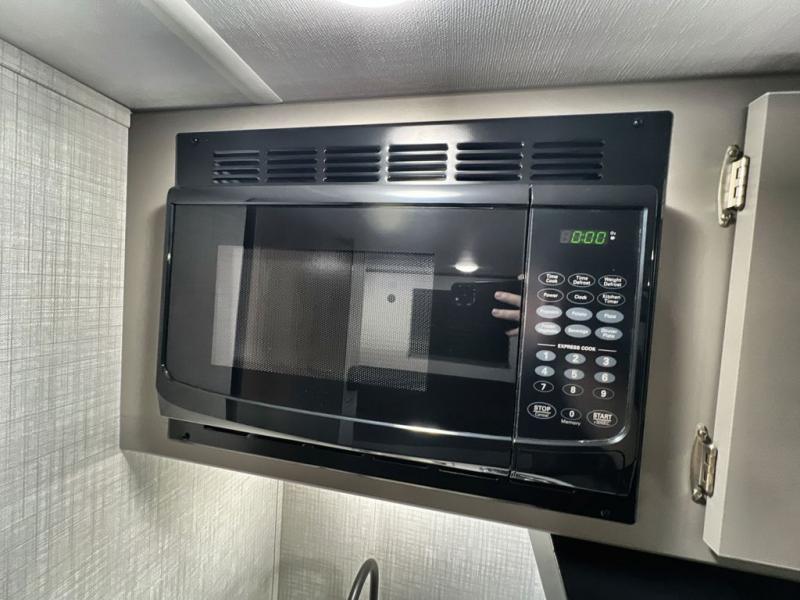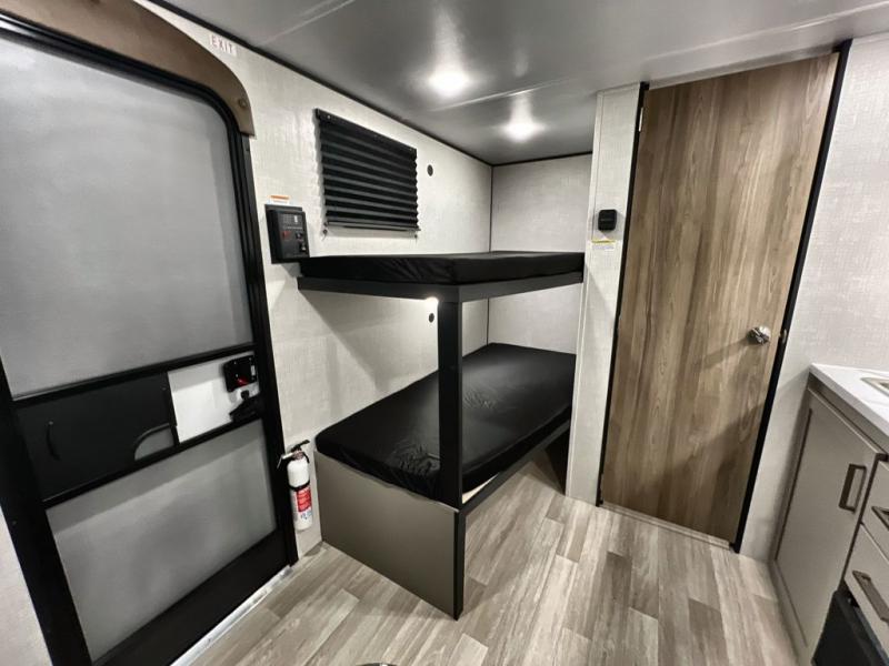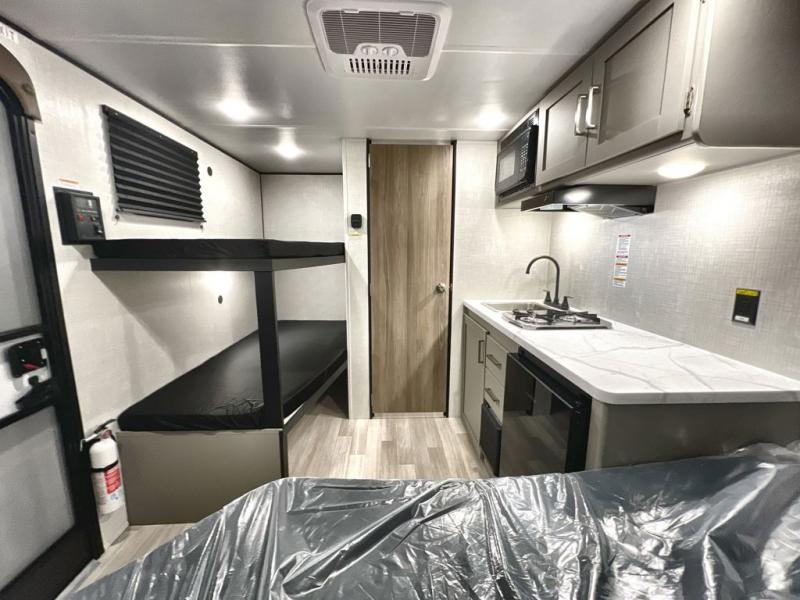 This lightweight travel trailer is perfect for six happy campers. You'll enjoy the front full-size bed, while your guests or little ones take the double-size bunks. There is also a shelf above the bed to keep your things organized. A private bath includes a shower with a toilet so you can freshen up each day without having to leave your camper. You can make your meals on the two-burner gas cooktop or in the microwave oven, then take your plate outdoors to eat under the 8' power awning!