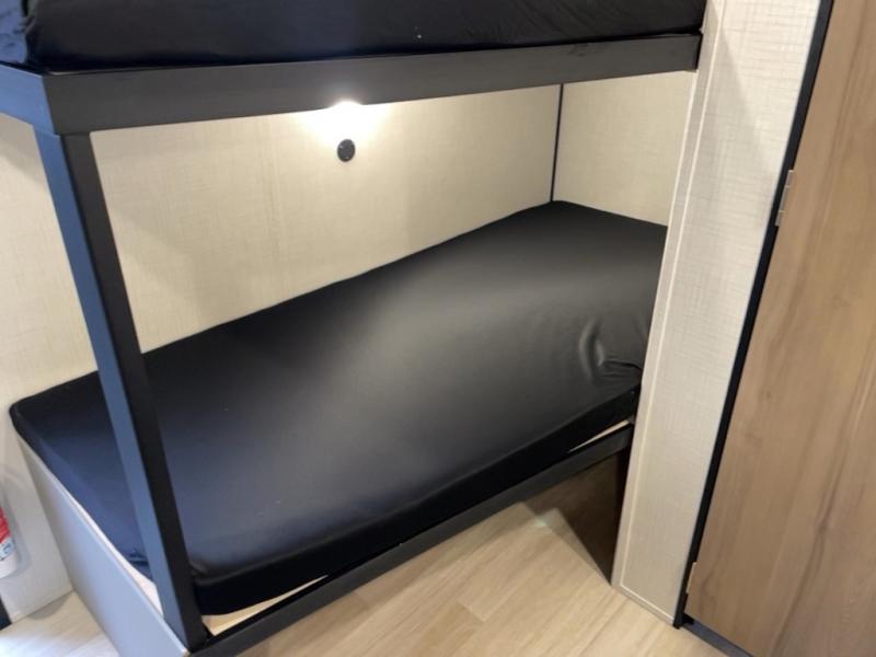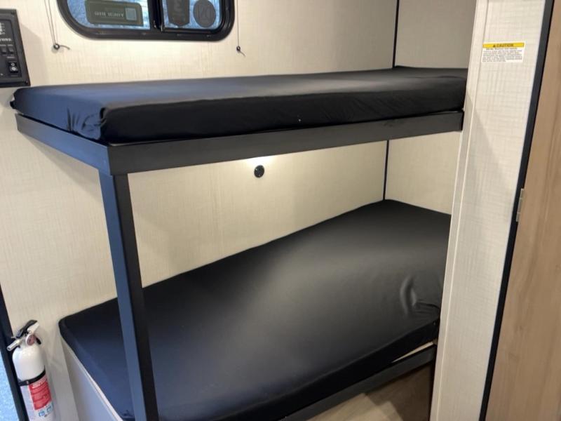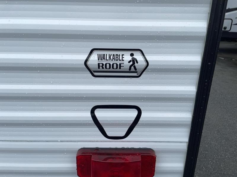 This lightweight travel trailer is perfect for six happy campers. You'll enjoy the front full-size bed, while your guests or little ones take the double-size bunks. There is also a shelf above the bed to keep your things organized. A private bath includes a shower with a toilet so you can freshen up each day without having to leave your camper. You can make your meals on the two-burner gas cooktop or in the microwave oven, then take your plate outdoors to eat under the 8' power awning!