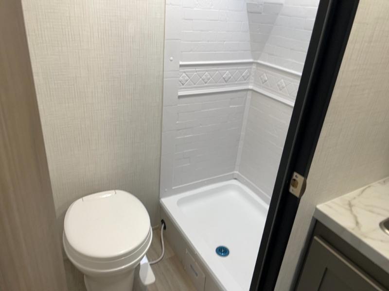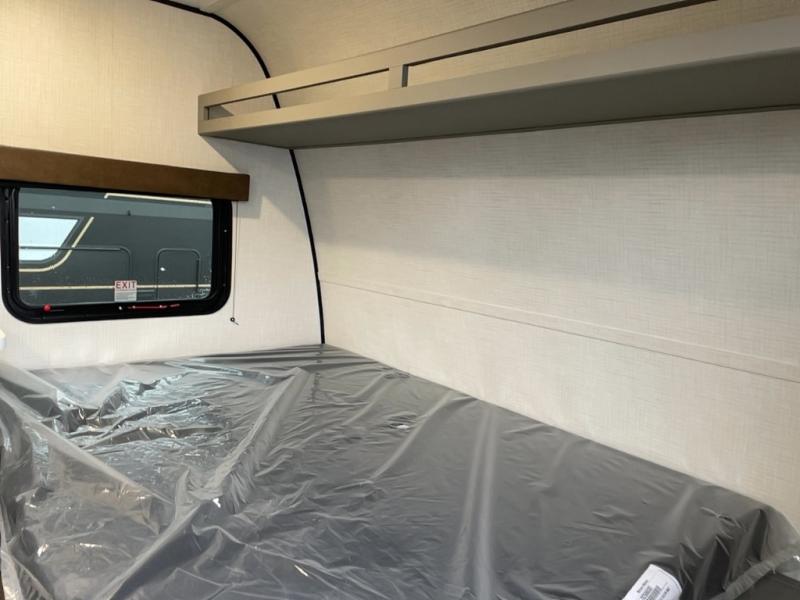 This lightweight travel trailer is perfect for six happy campers. You'll enjoy the front full-size bed, while your guests or little ones take the double-size bunks. There is also a shelf above the bed to keep your things organized. A private bath includes a shower with a toilet so you can freshen up each day without having to leave your camper. You can make your meals on the two-burner gas cooktop or in the microwave oven, then take your plate outdoors to eat under the 8' power awning!