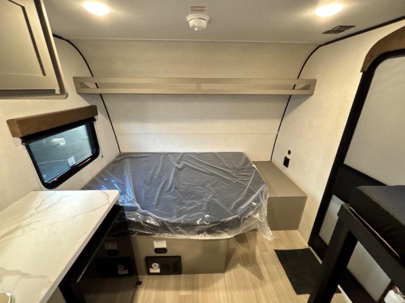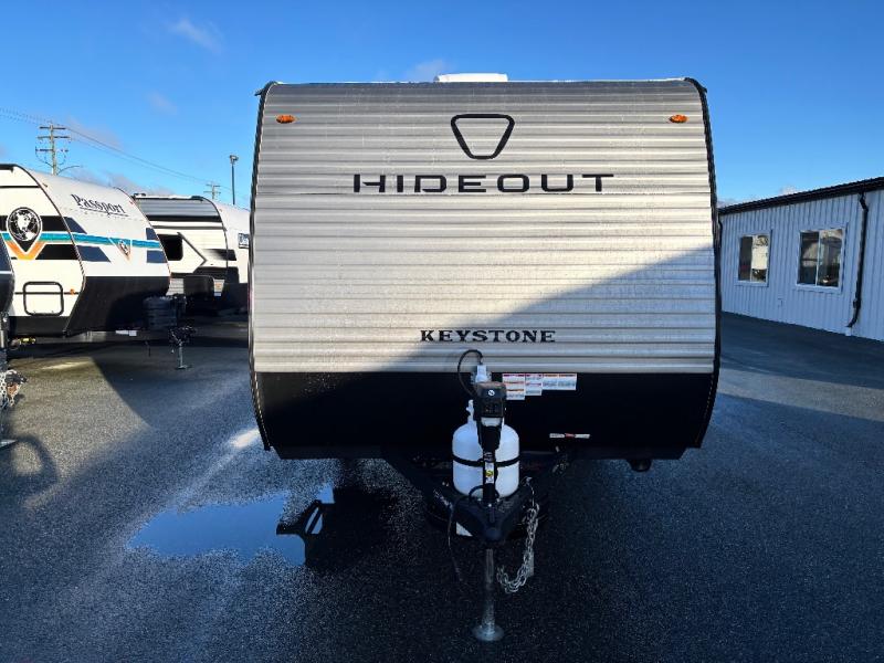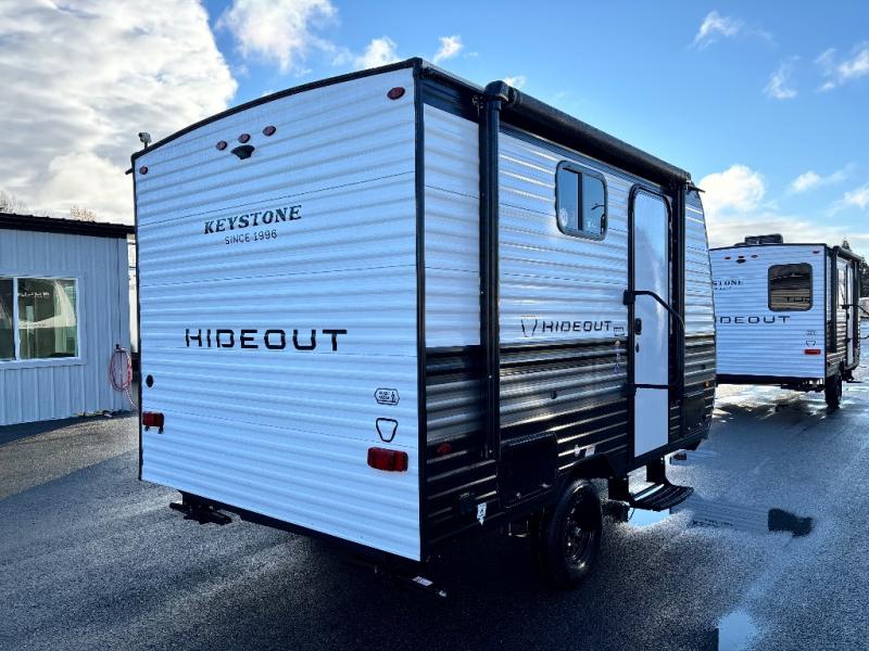 With any Hideout Mini travel trailer by Keystone, you will enjoy lightweight towing thanks to their single axle! The XL tinted safety glass windows are ultra durable, and the power awning will provide protection from the sun as you relax in your camp chairs outside. Each model includes blackout night shades, LED lighting, plus many more interior comforts. There is also a 20K BTU furnace to keep you comfortable, plus a tankless water heater for endless hot showers!