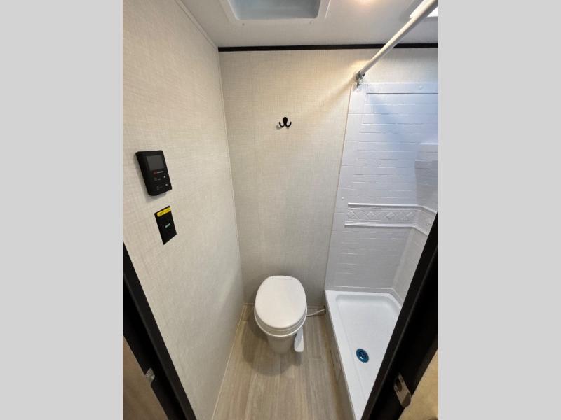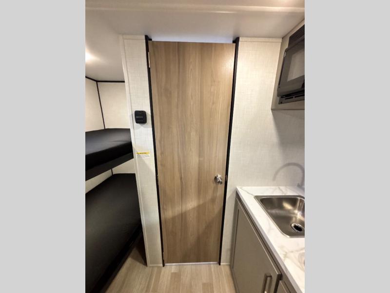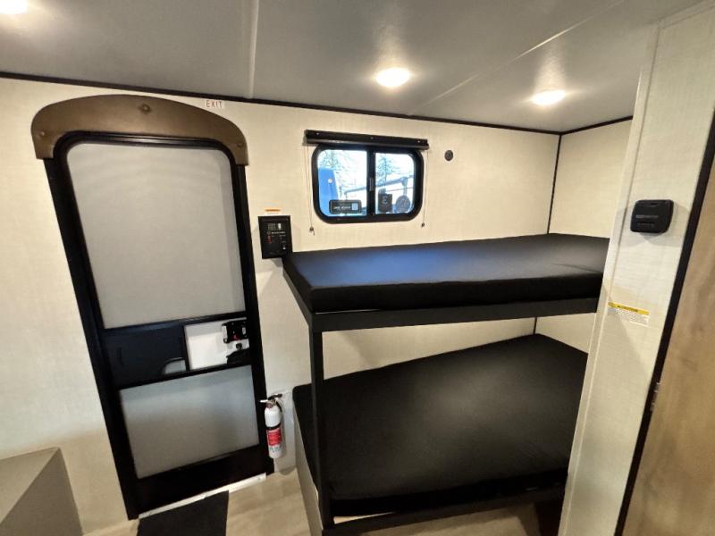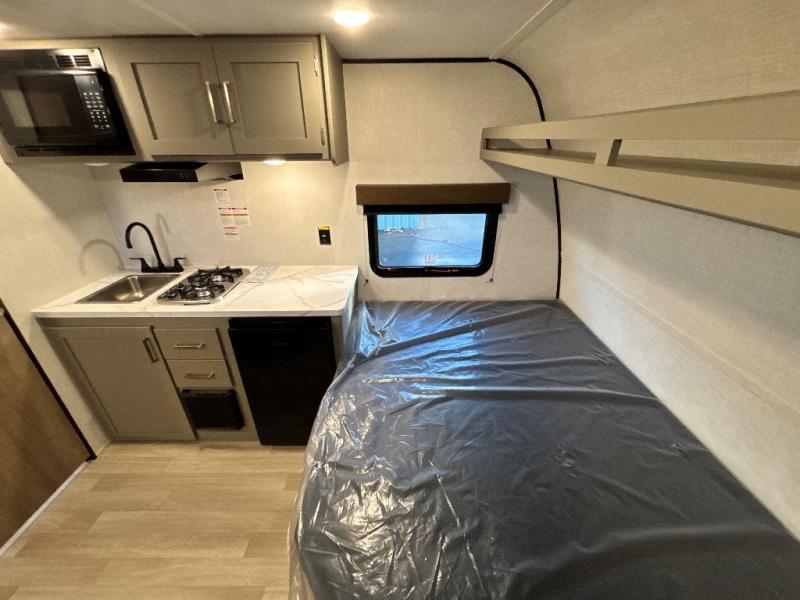This lightweight travel trailer is perfect for six happy campers. You'll enjoy the front full-size bed, while your guests or little ones take the double-size bunks. There is also a shelf above the bed to keep your things organized. A private bath includes a shower with a toilet so you can freshen up each day without having to leave your camper. You can make your meals on the two-burner gas cooktop or in the microwave oven, then take your plate outdoors to eat under the 8' power awning!