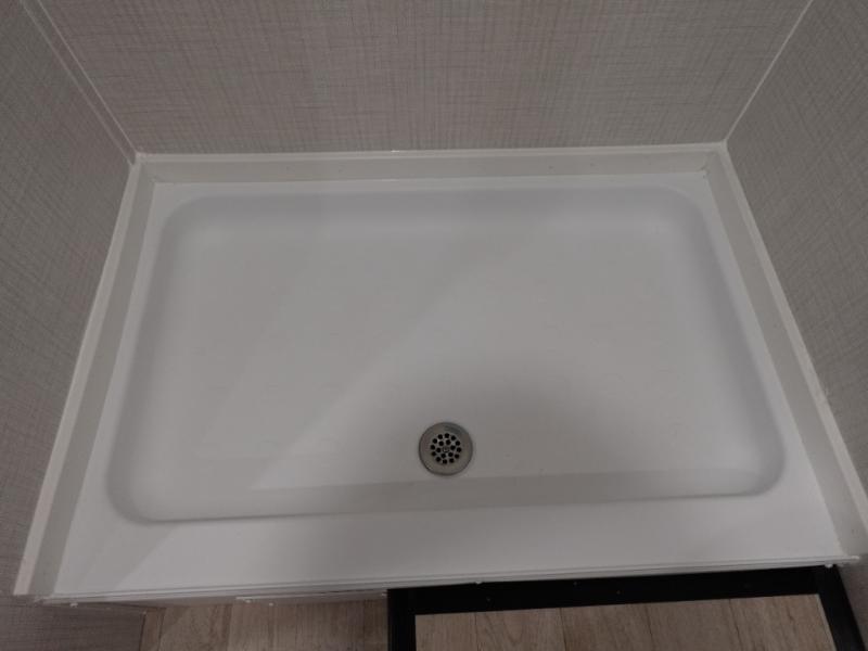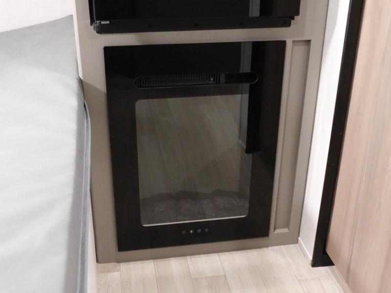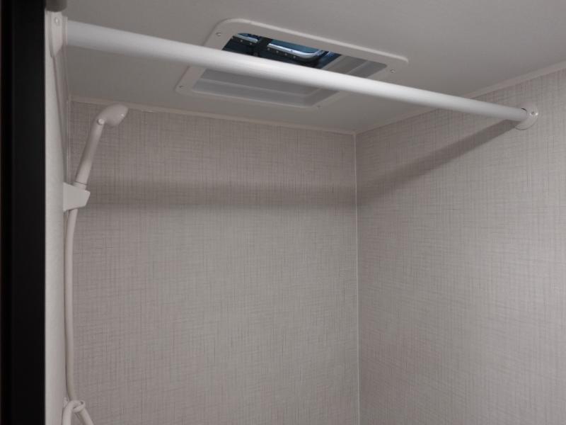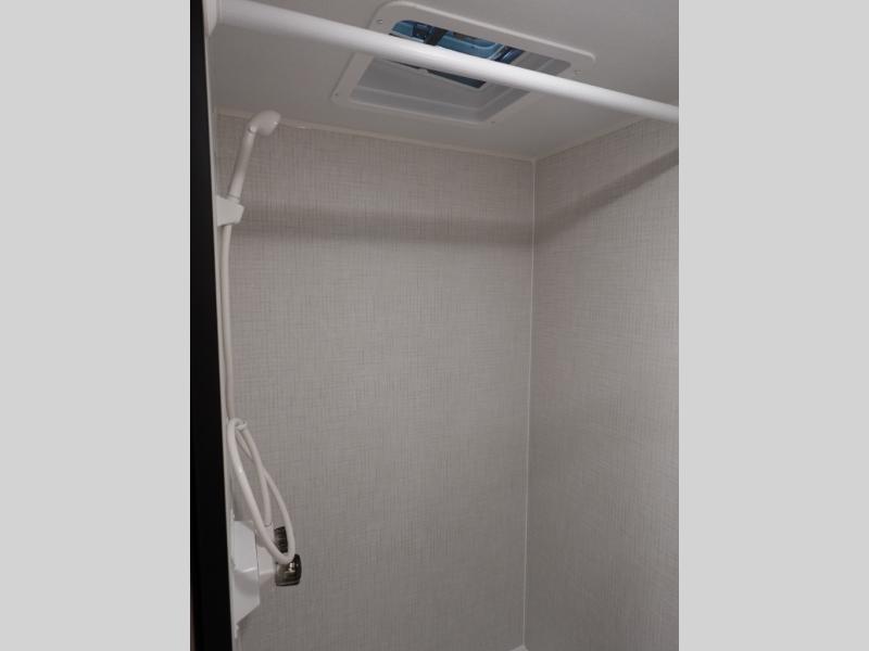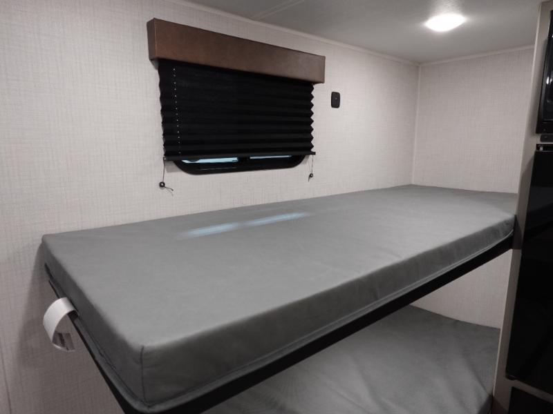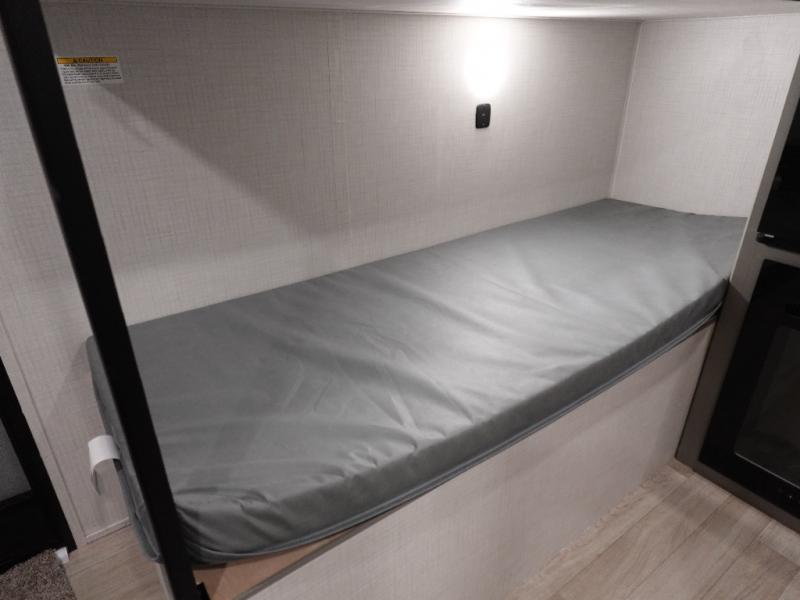 This lightweight travel trailer is perfect for four happy campers. You'll enjoy the front full-size bed, while your guests or little ones take the 28" x 74" bunk beds. There is also a shelf above the bed to keep your things organized. A private bath includes a shower with a toilet so you can freshen up each day without having to leave your camper. You can make your meals on the two burner gas cooktop or in the microwave oven, then take your plate outdoors to eat under the 8' power awning!