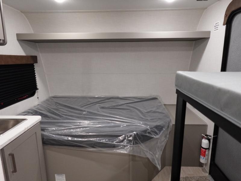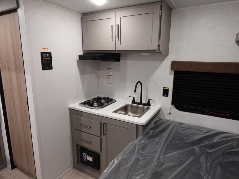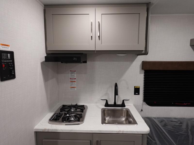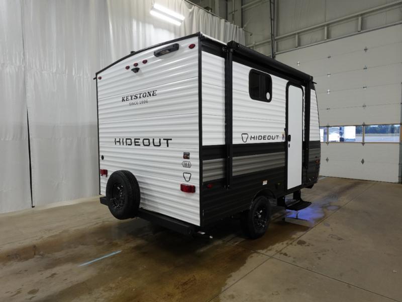 With any Hideout Mini travel trailer by Keystone, you will enjoy lightweight towing thanks to their single-axle! The AlphaPly TPO roof membrane is ultra durable, and the power awning will provide protection from the sun as you relax in your camp chairs outside. Each model includes blackout night shades, LED lighting, plus many more interior comforts. There is also a roof A/C and 20K BTU furnace to keep you comfortable, plus a tankless water heater for endless hot showers!