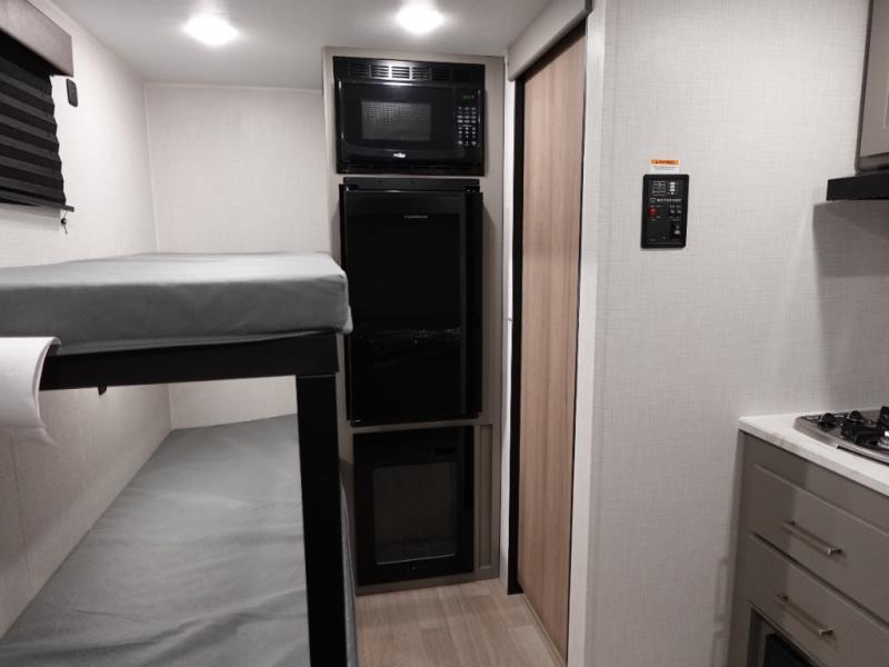 This lightweight travel trailer is perfect for four happy campers. You'll enjoy the front full-size bed, while your guests or little ones take the 28" x 74" bunk beds. There is also a shelf above the bed to keep your things organized. A private bath includes a shower with a toilet so you can freshen up each day without having to leave your camper. You can make your meals on the two burner gas cooktop or in the microwave oven, then take your plate outdoors to eat under the 8' power awning!