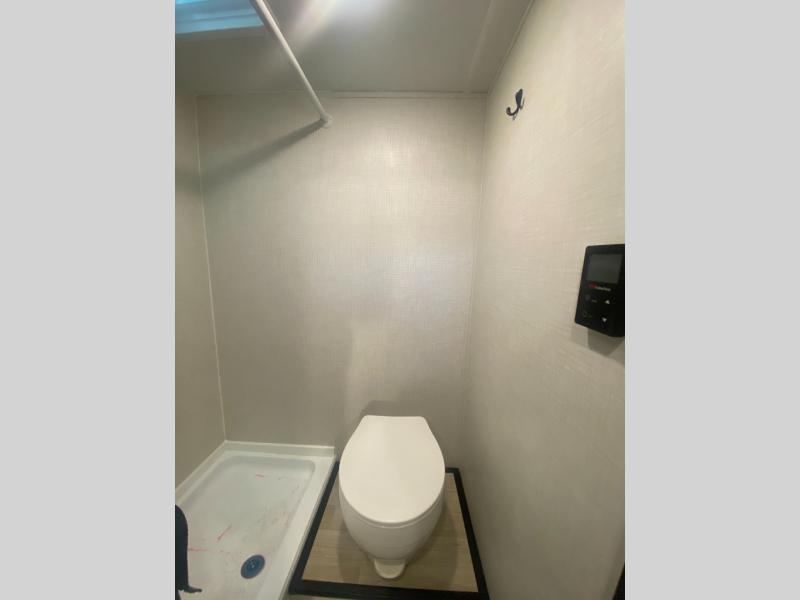 The galley kitchen maximizes every inch, offering a two-burner gas cooktop, a microwave oven, and a high-efficiency 12V refrigerator to keep your trail snacks fresh. You can enjoy your meals indoors or head outside to the shaded patio created by the 8' power awning. Despite its compact footprint, this model features a private bathroom with a shower and toilet, ensuring you can freshen up in comfort without ever having to leave your campsite or rely on public facilities.