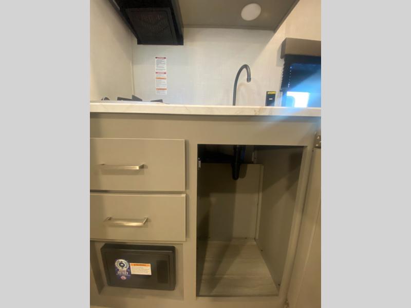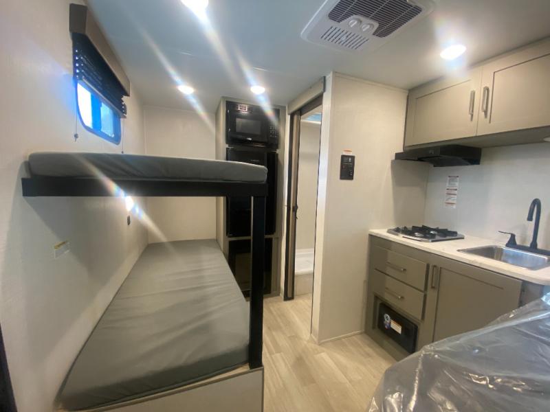 The interior is surprisingly well-appointed with modern comforts like blackout night shades for a deeper sleep, bright LED lighting, and a powerful 20K BTU furnace paired with a roof A/C to keep the cabin at the perfect temperature year-round. A standout luxury in this segment is the Girard tankless water heater, which provides endless hot water for showers—no more waiting for a small tank to reheat! With its nimble size and exterior pass-through storage for all your camping gear, the 130BH is the perfect gateway to the RV lifestyle.